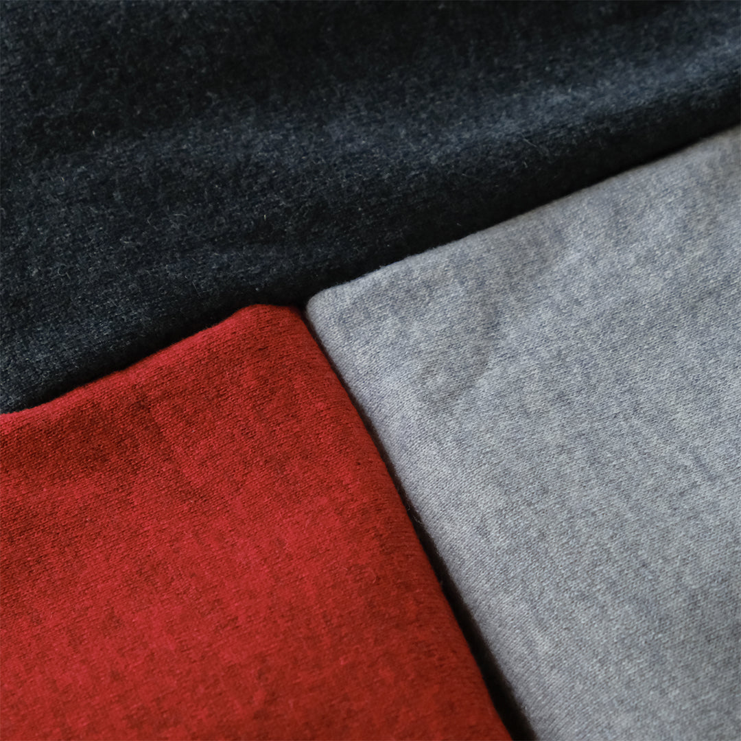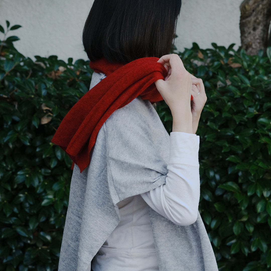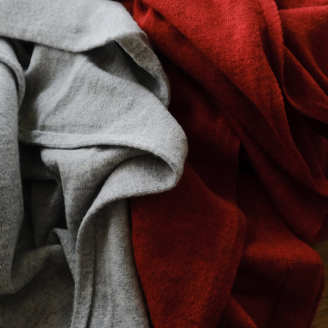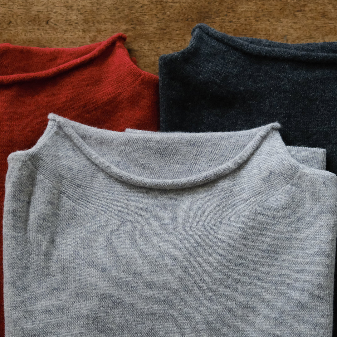 カラーはミックスレッド、グレー、チャコール、とFREEMAN--B定番の3色。原毛の段階で染めることで、カシミヤへの負担を最小限に抑えています。