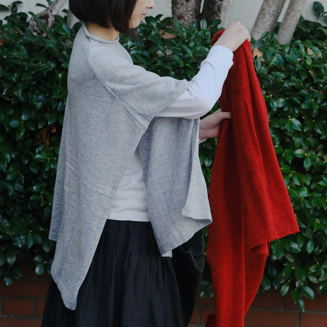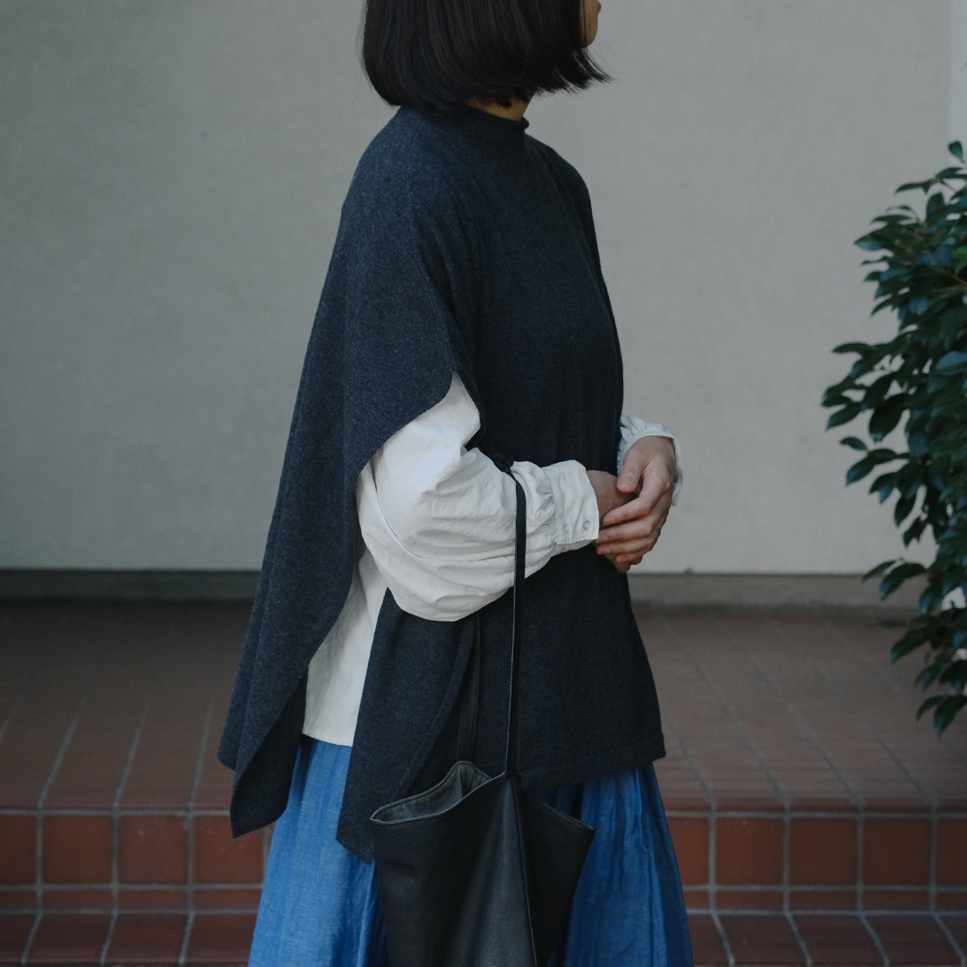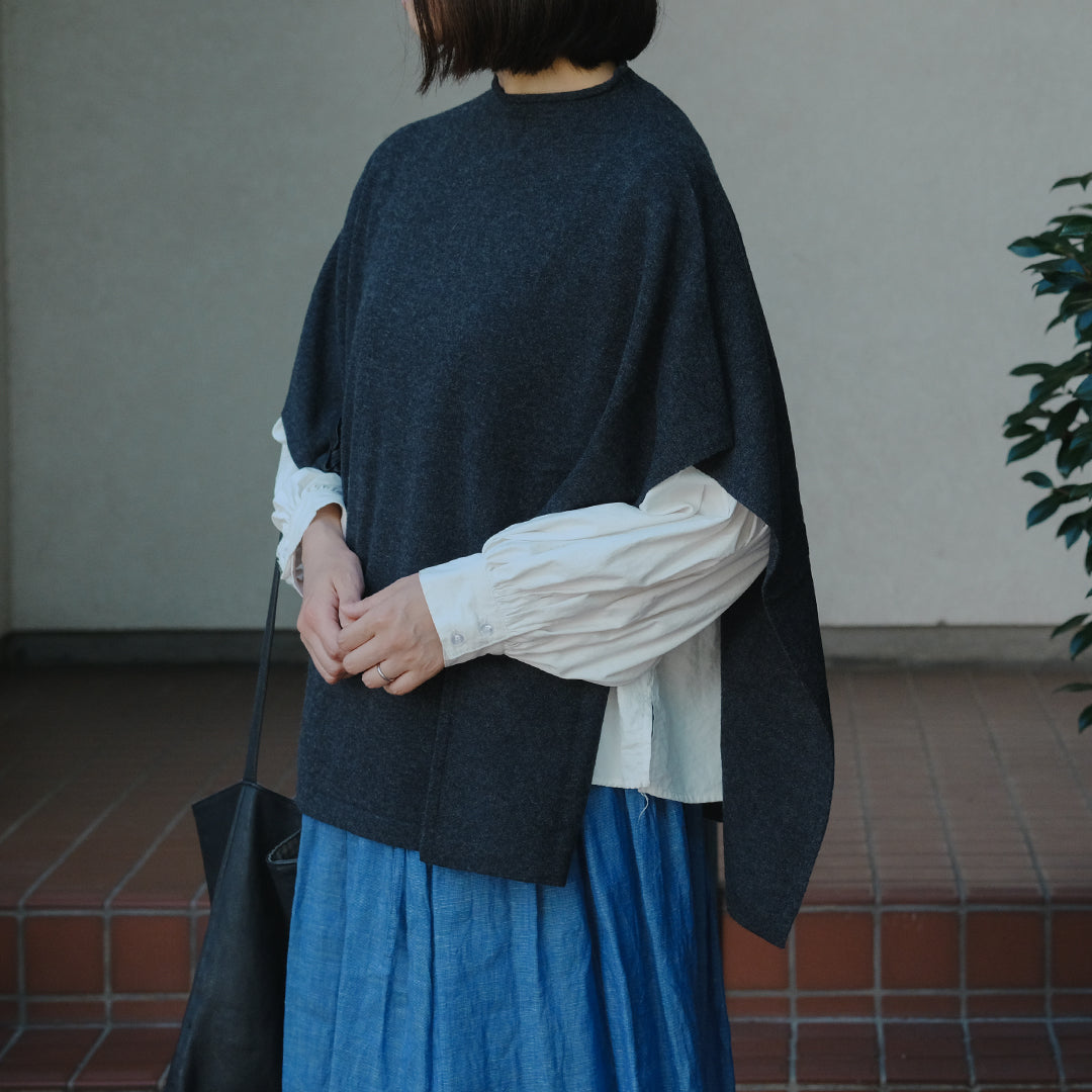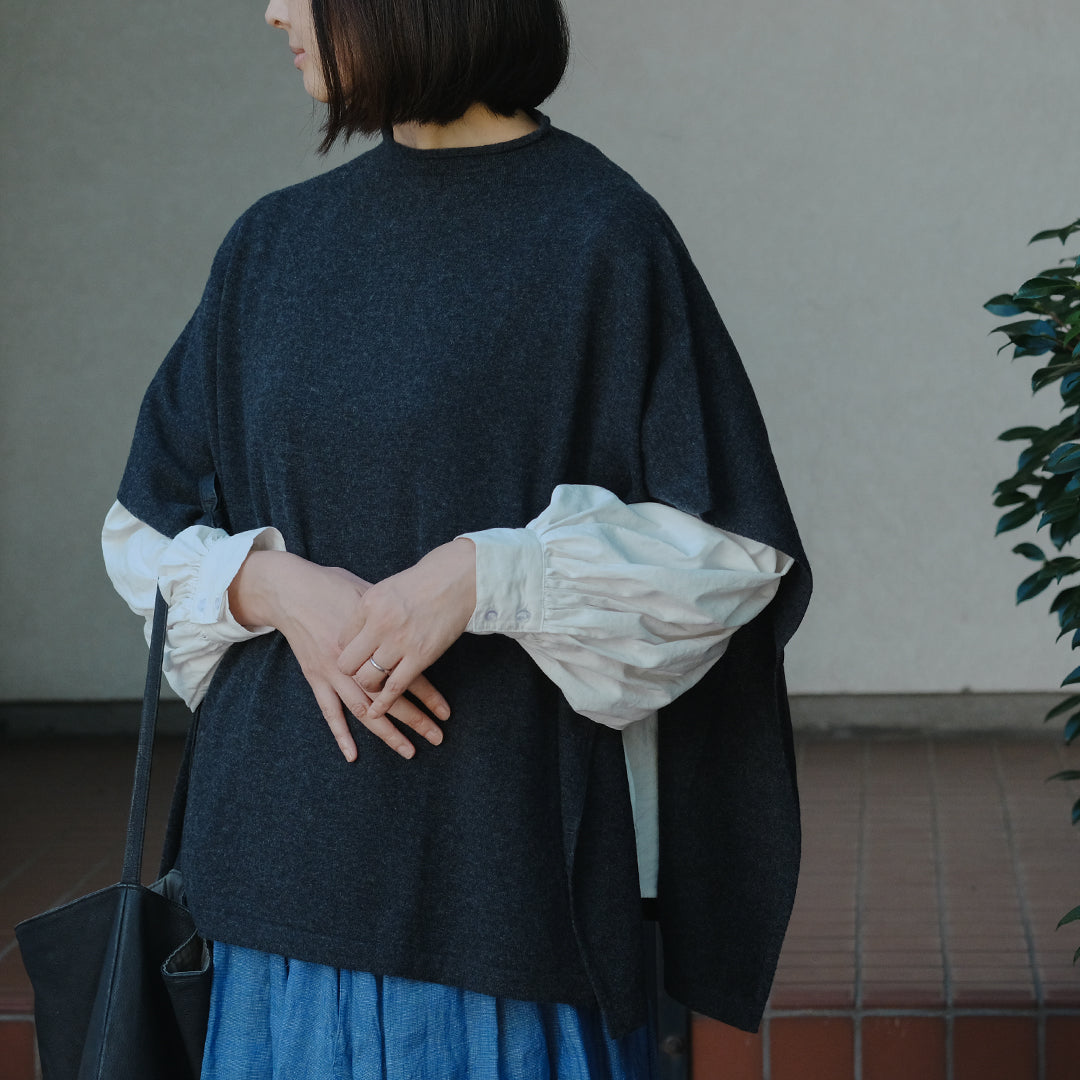 肌にも環境にもやさしいカシミヤニットを提案する「FREEMAN--B(フリーマン)」。ドレッシーな雰囲気にも着こなせるマントのようなケープ。コートの下に重ねても使えます。