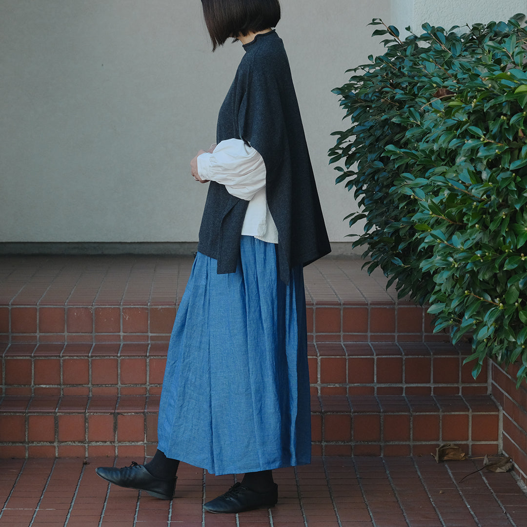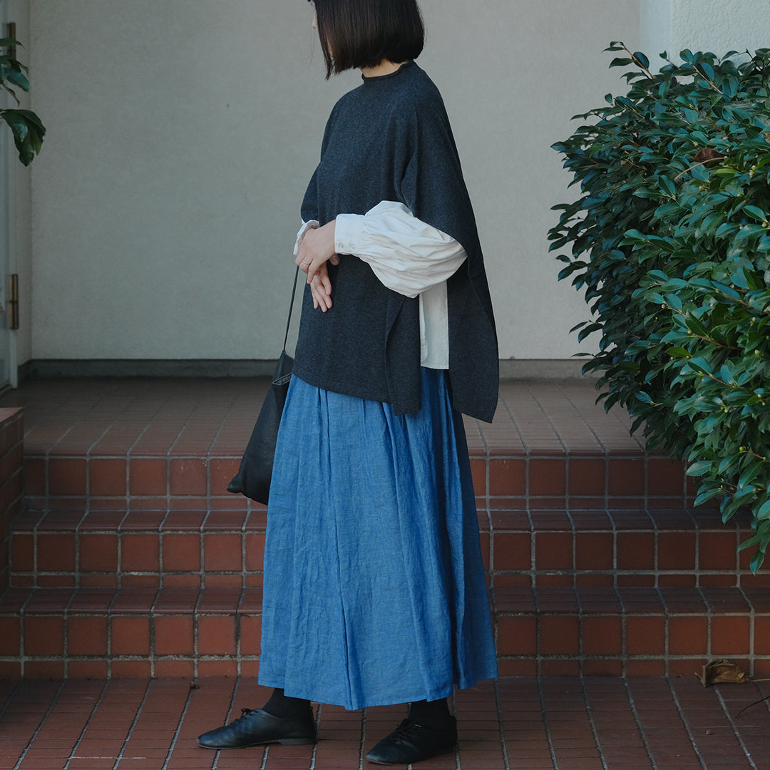 ▲カジュアルにもモダンにもなるチャコール、モデル身長168cm、スカート:リトアニアンリネンタックギャザースカート/メランジェブルー