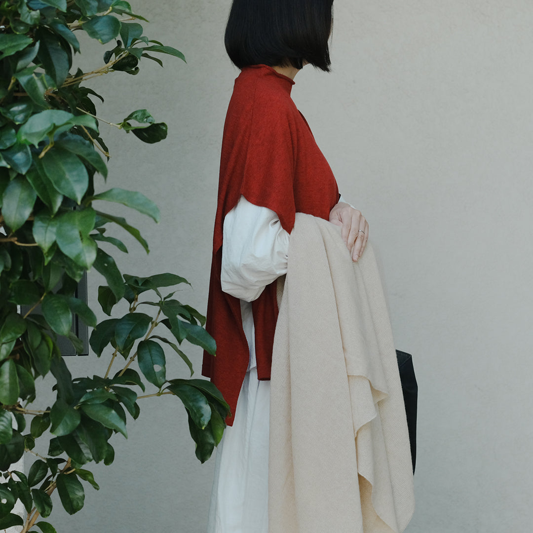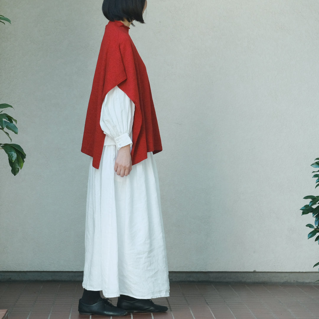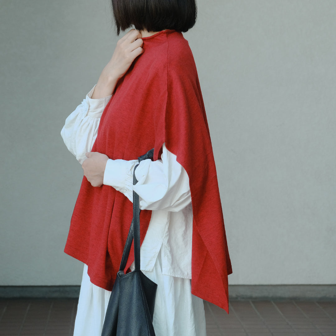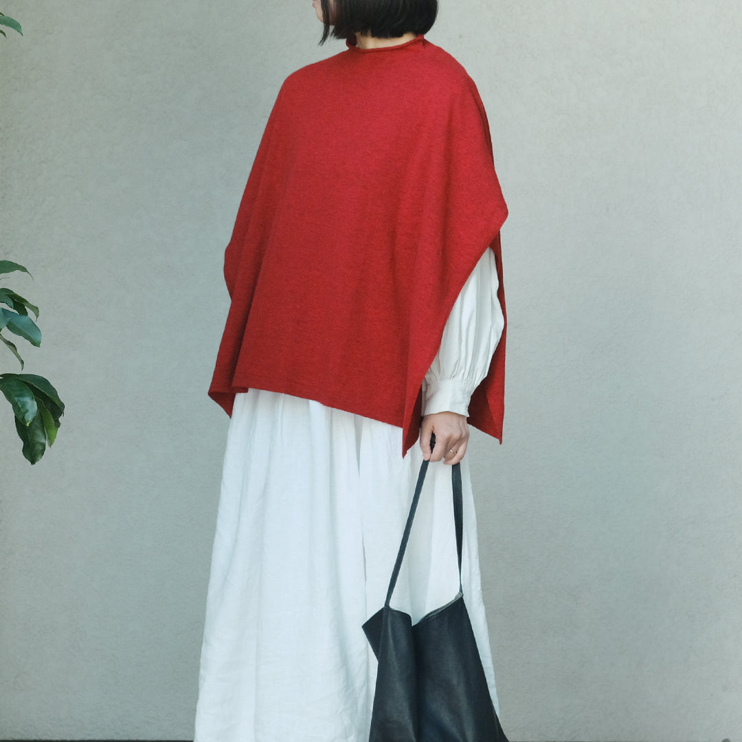 トップスのようにもマントのようにも見えるスクエアなシルエットのケープ。ワンピースやスカート、パンツにも合わせやすいエレガントな一枚です。