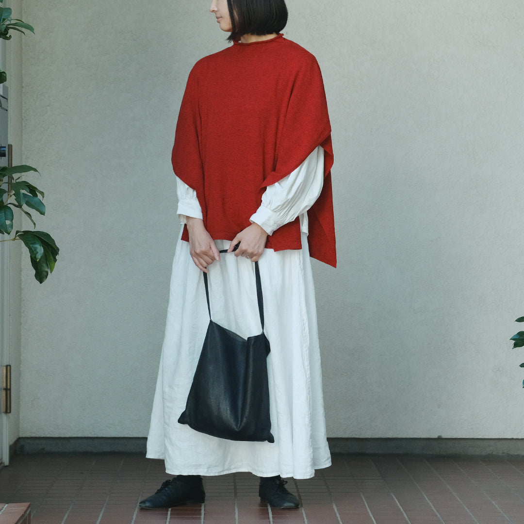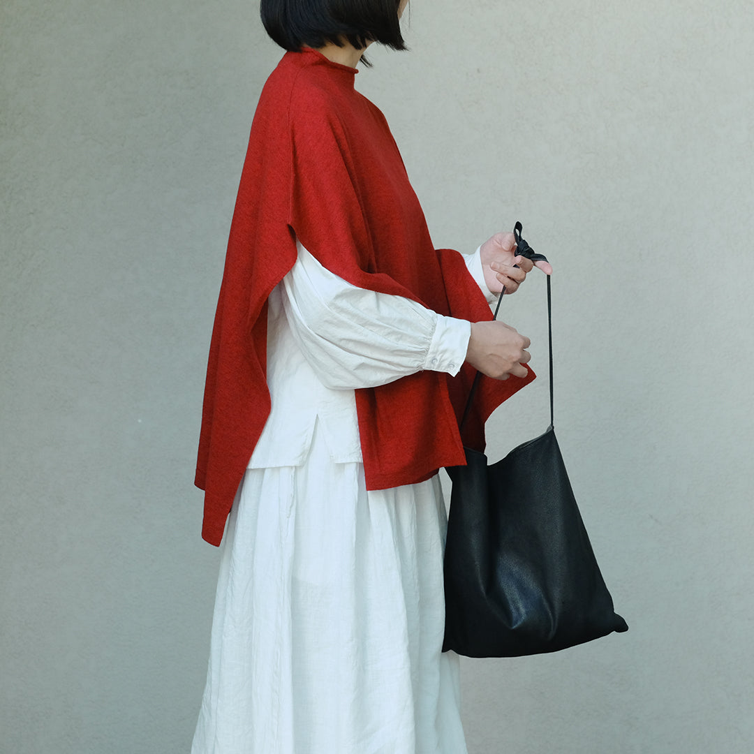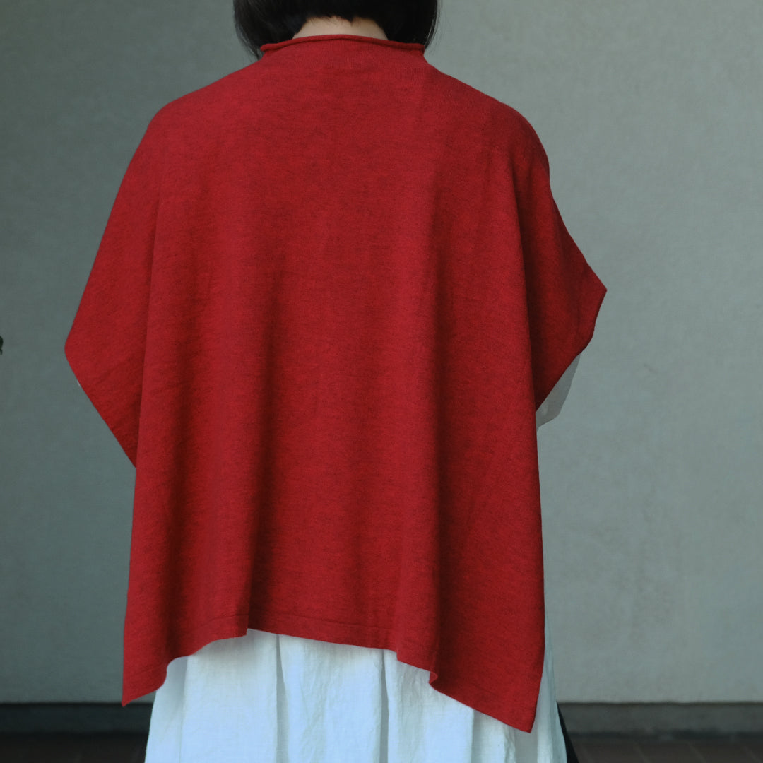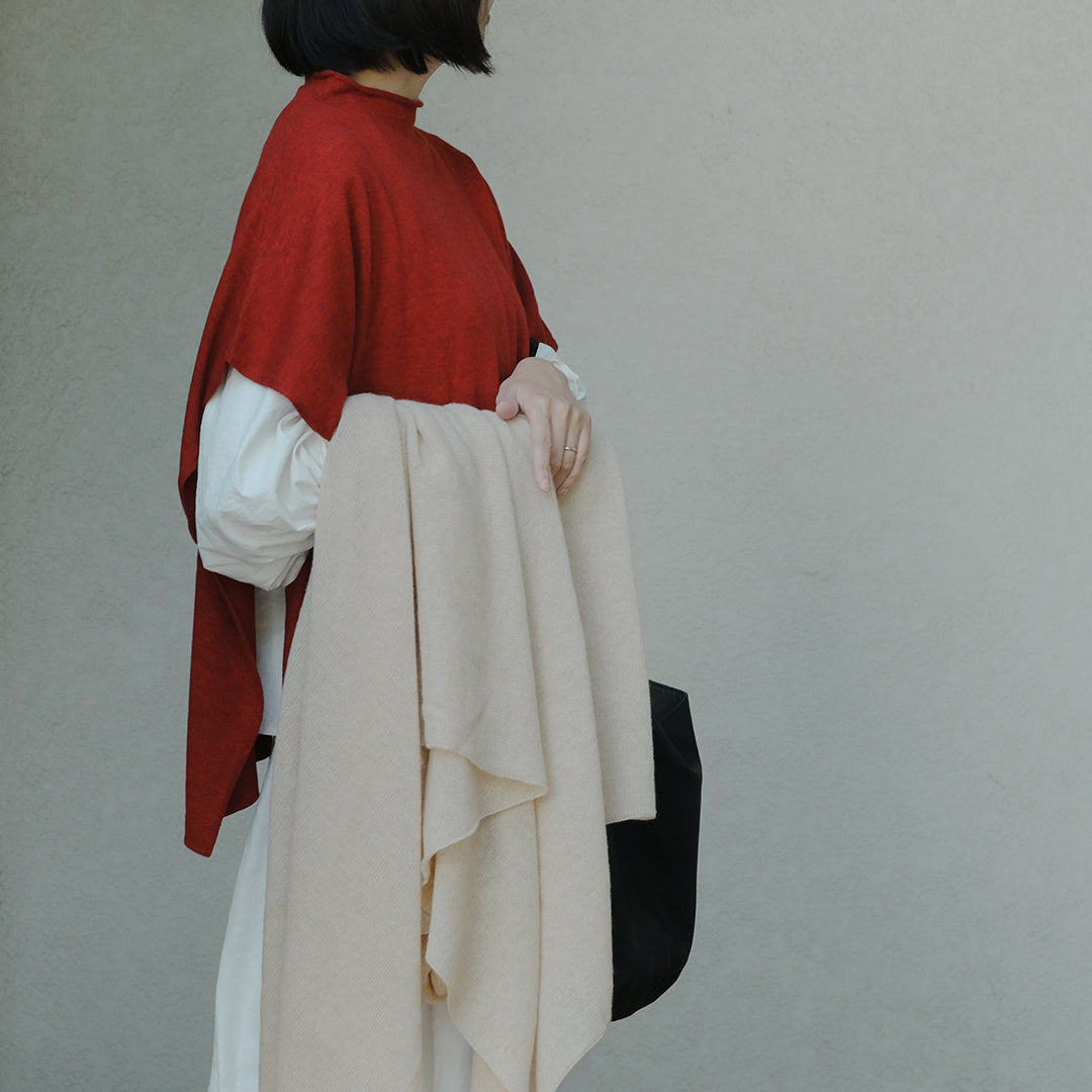 トップスのようにもマントのようにも見えるスクエアなシルエットのケープ。ワンピースやスカート、パンツにも合わせやすいエレガントな一枚です。