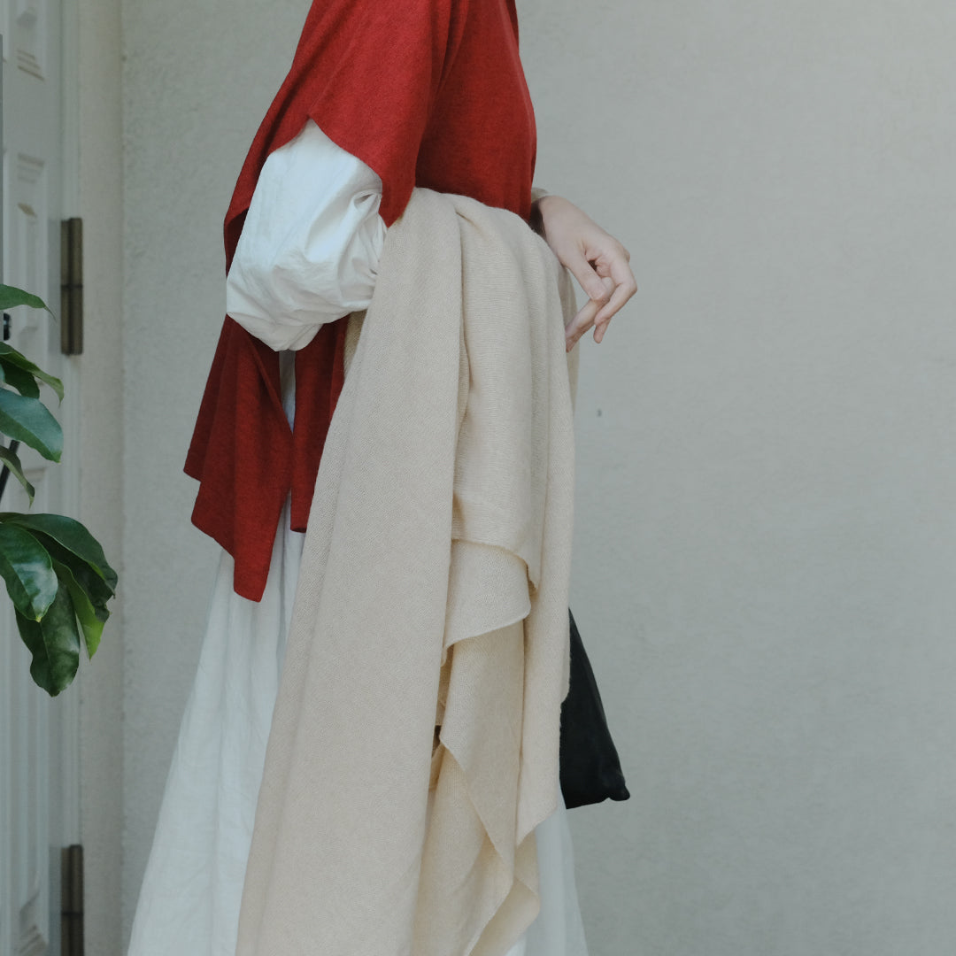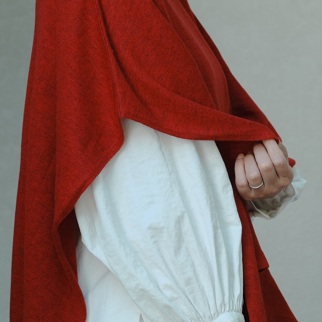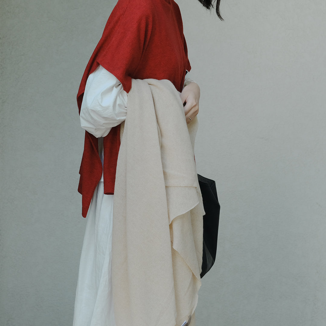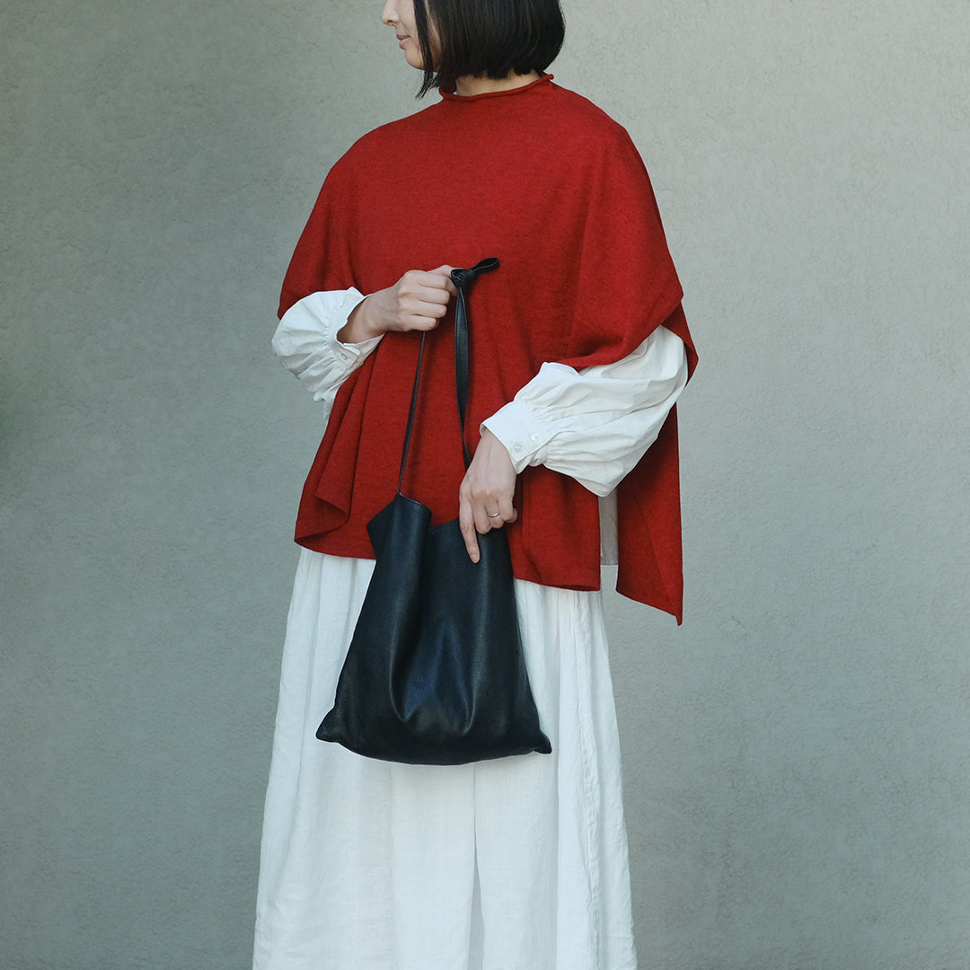 トップスのようにもマントのようにも見えるスクエアなシルエットのケープ。ワンピースやスカート、パンツにも合わせやすいエレガントな一枚です。