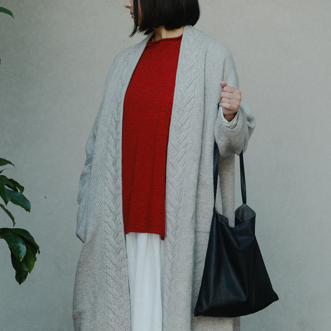 ゆったりサイズでも薄手なので、コートの下に無理なく重ねられるのもうれしいポイント。もちろんコートの上から羽織ることも。