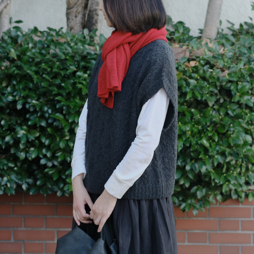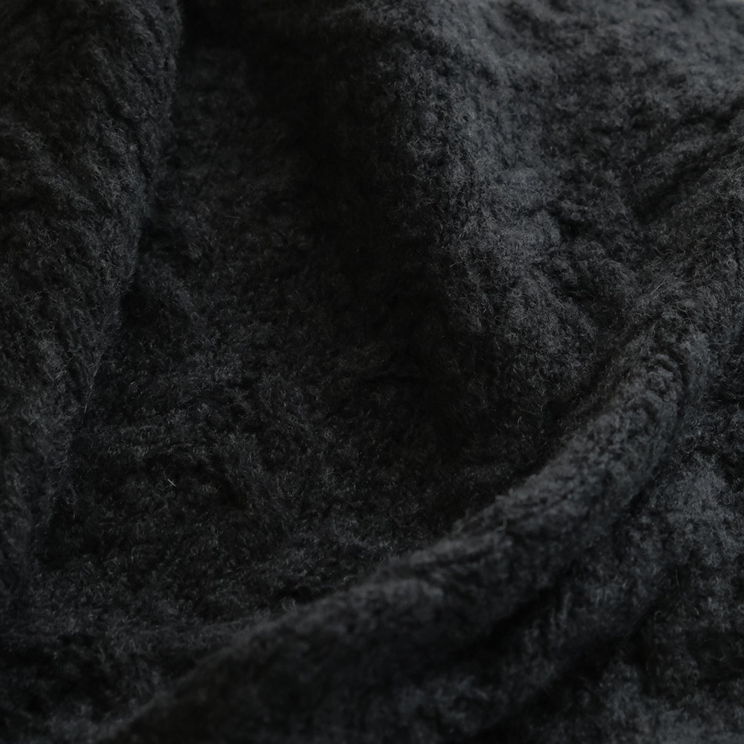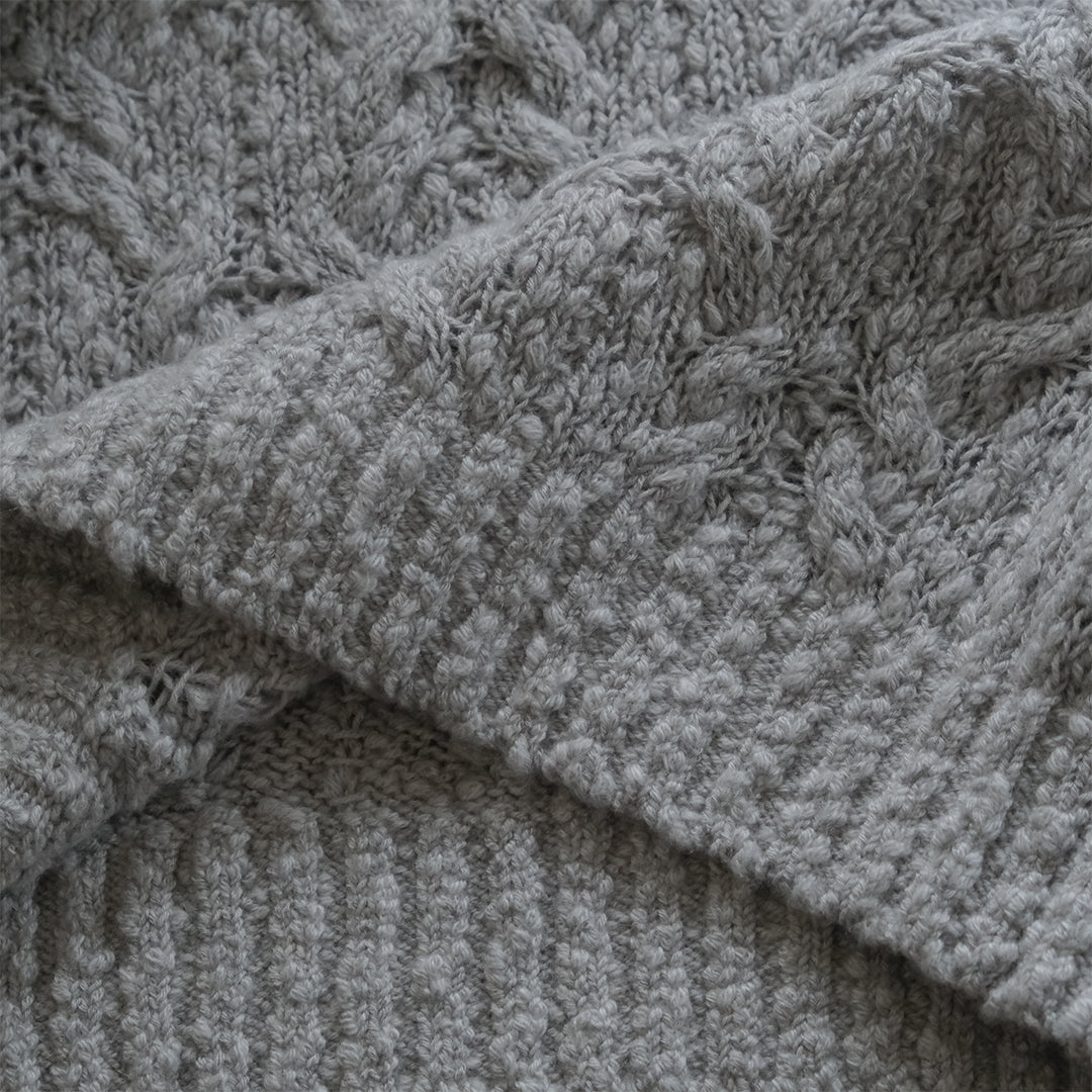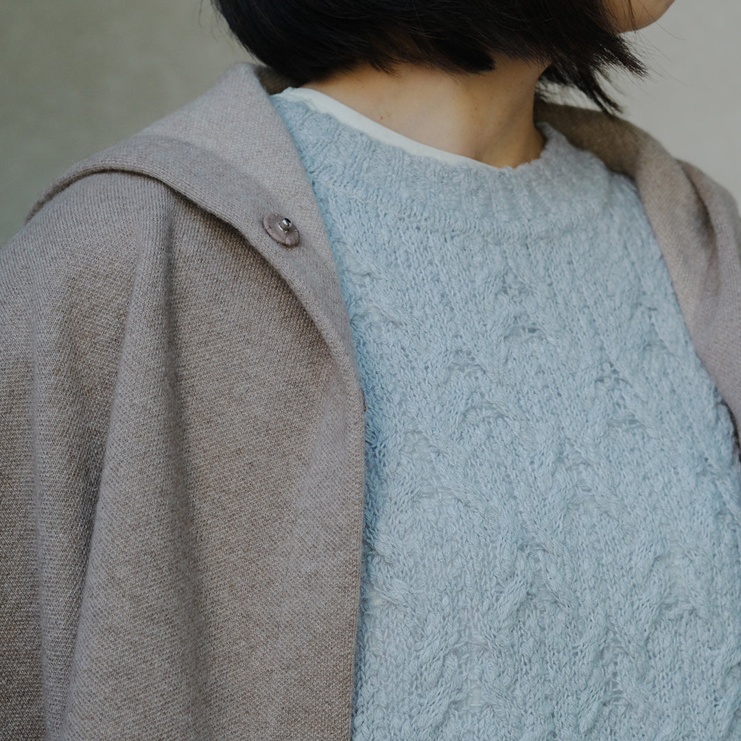 太い部分と細い部分ができるよう特殊な技法で紡績した糸を、まるで手編みのような雰囲気の柄編みで仕上げました。艶やかなカシミアの上質感も楽しめます。