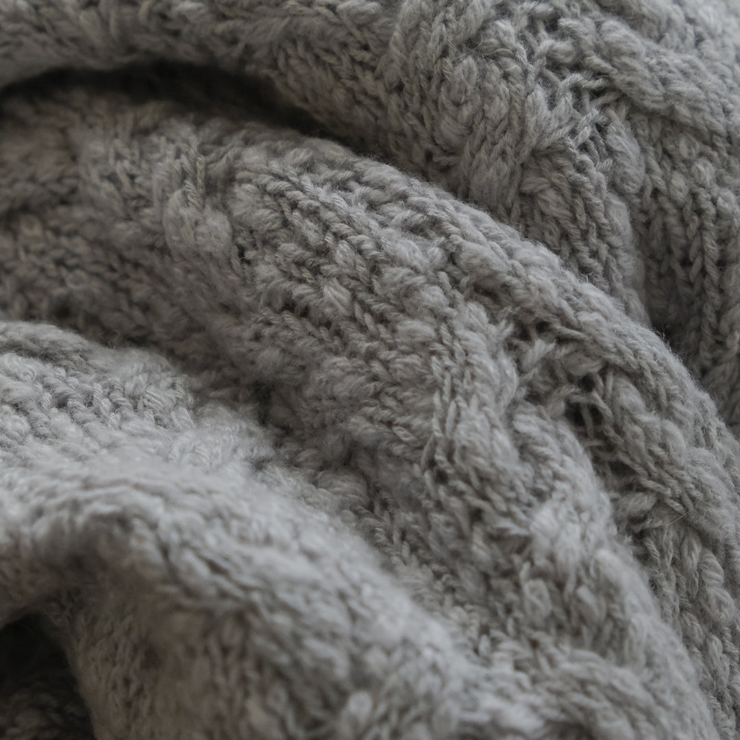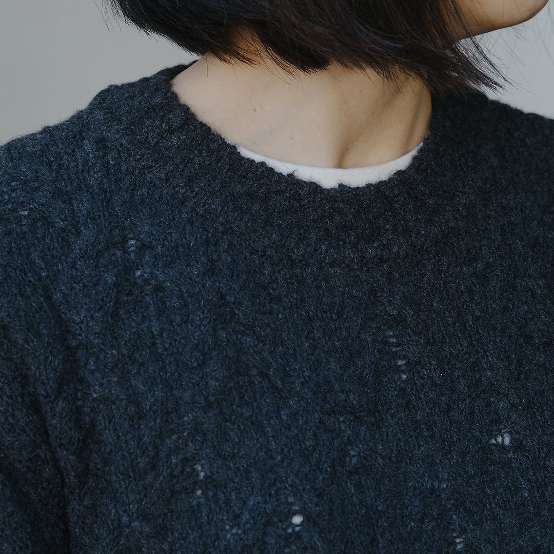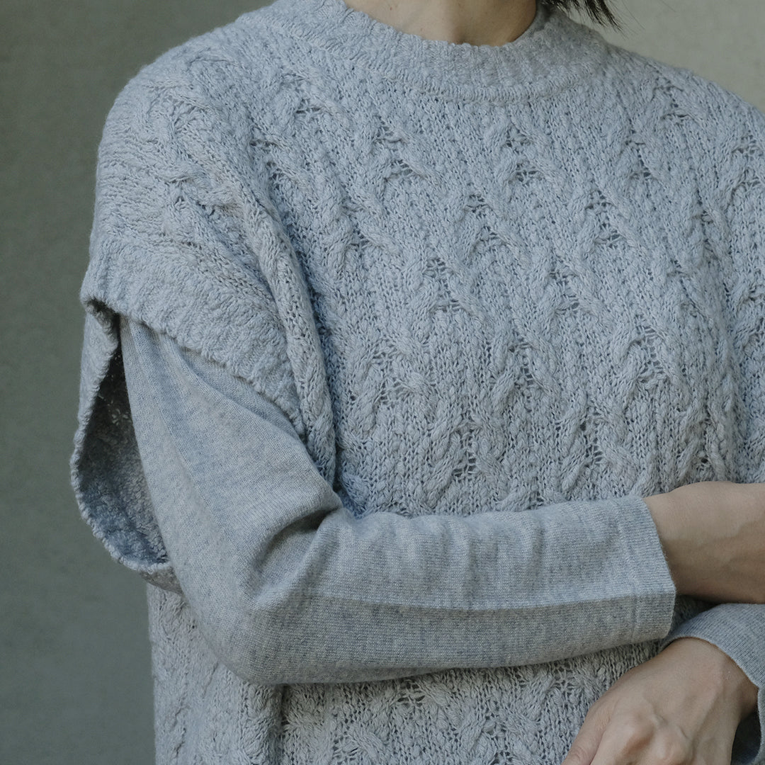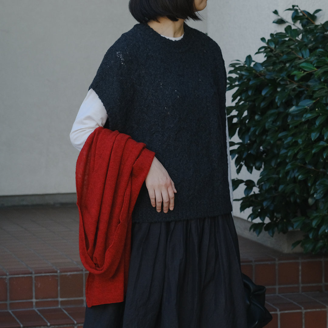 太い部分と細い部分ができるよう特殊な技法で紡績した糸を、まるで手編みのような雰囲気の柄編みで仕上げました。艶やかなカシミアの上質感も楽しめます。
