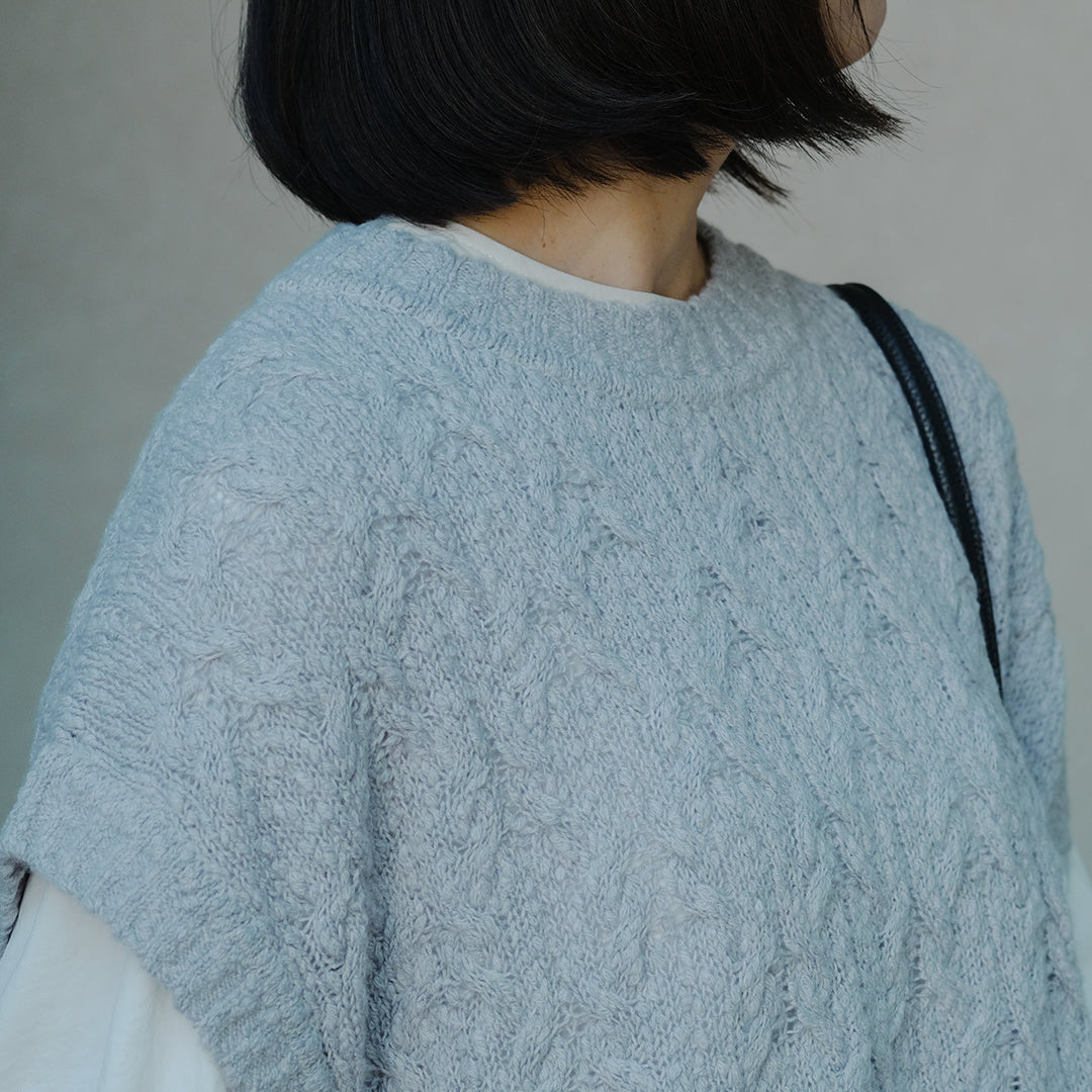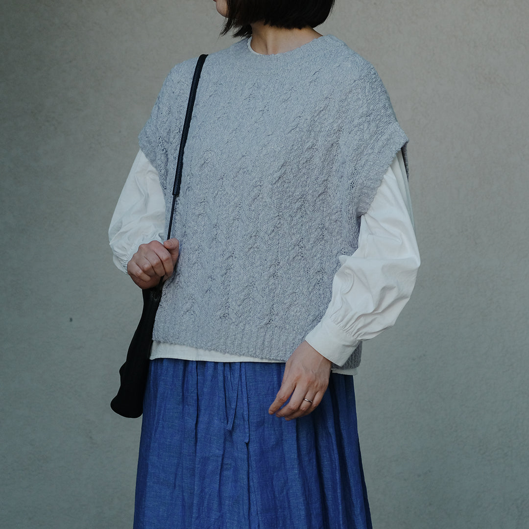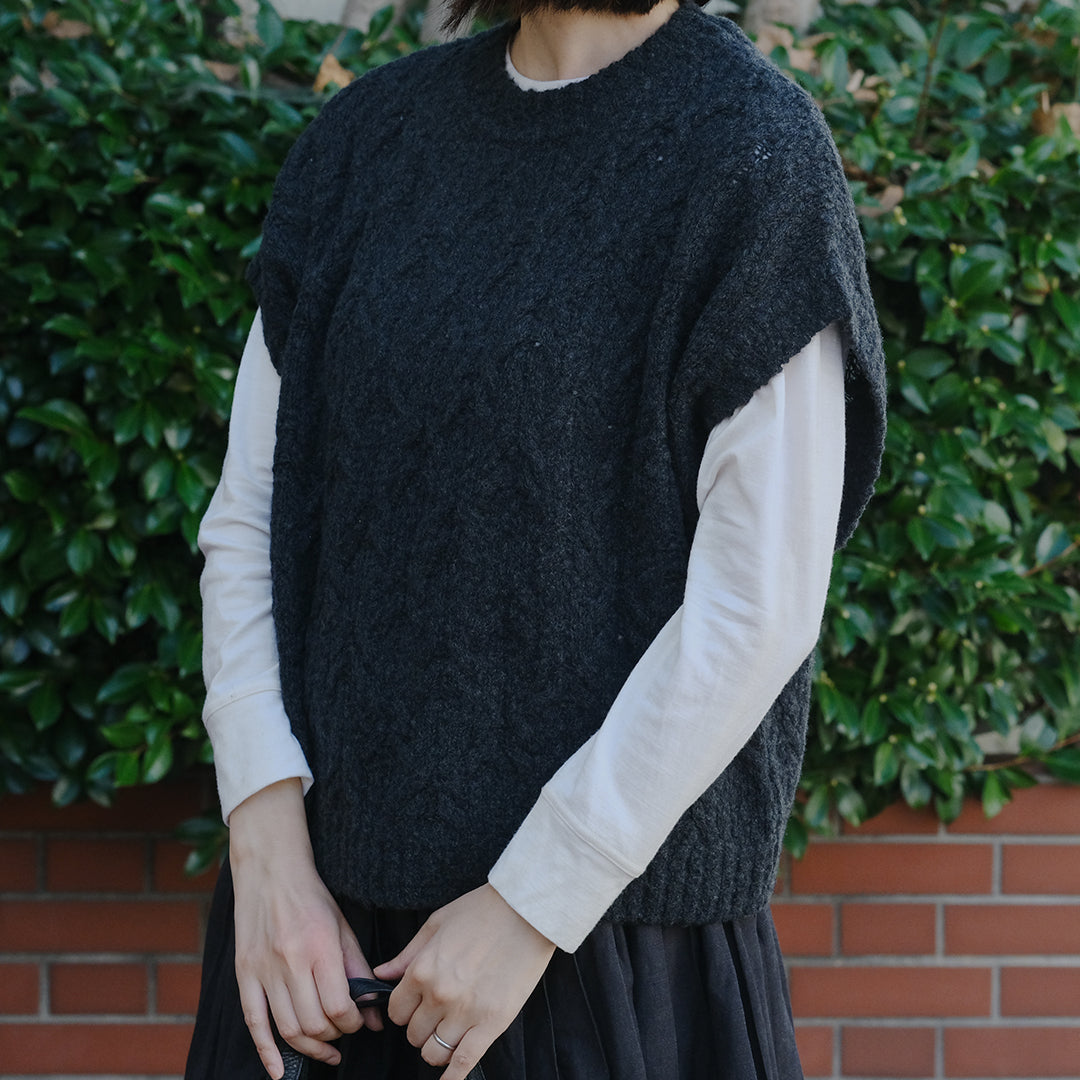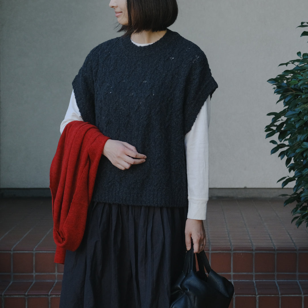 肌にも環境にもやさしいカシミヤニットを提案する「FREEMAN--B(フリーマン)」。オリジナル植物モチーフを立体的な糸で編み上げた、まるで手編みのような質感のベスト。季節に合わせて活躍するアイテムです。