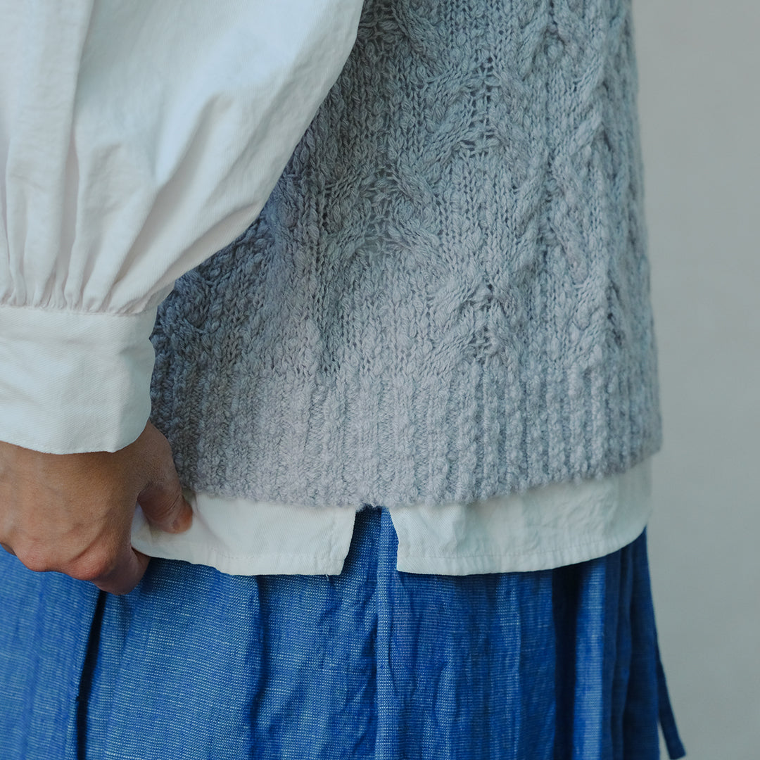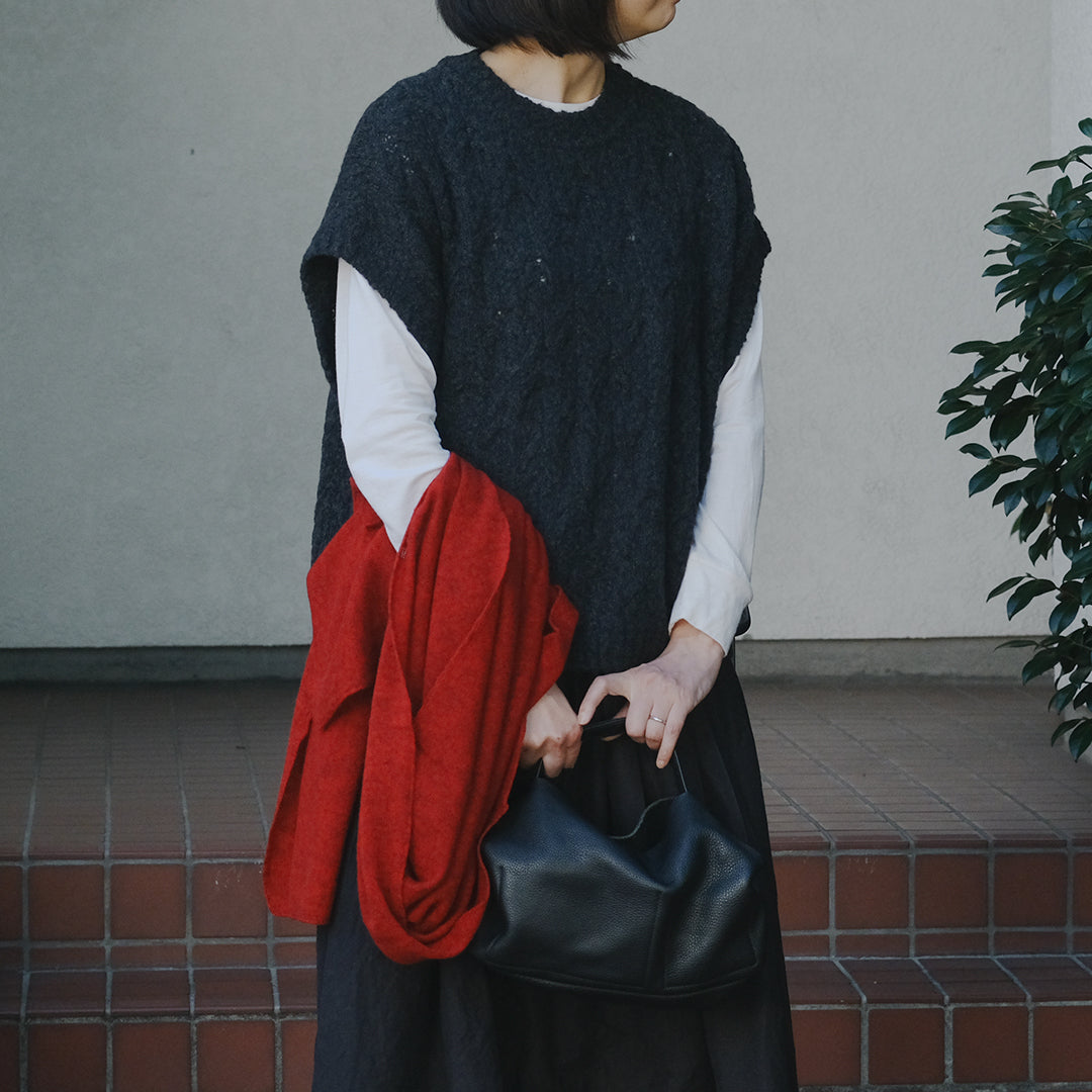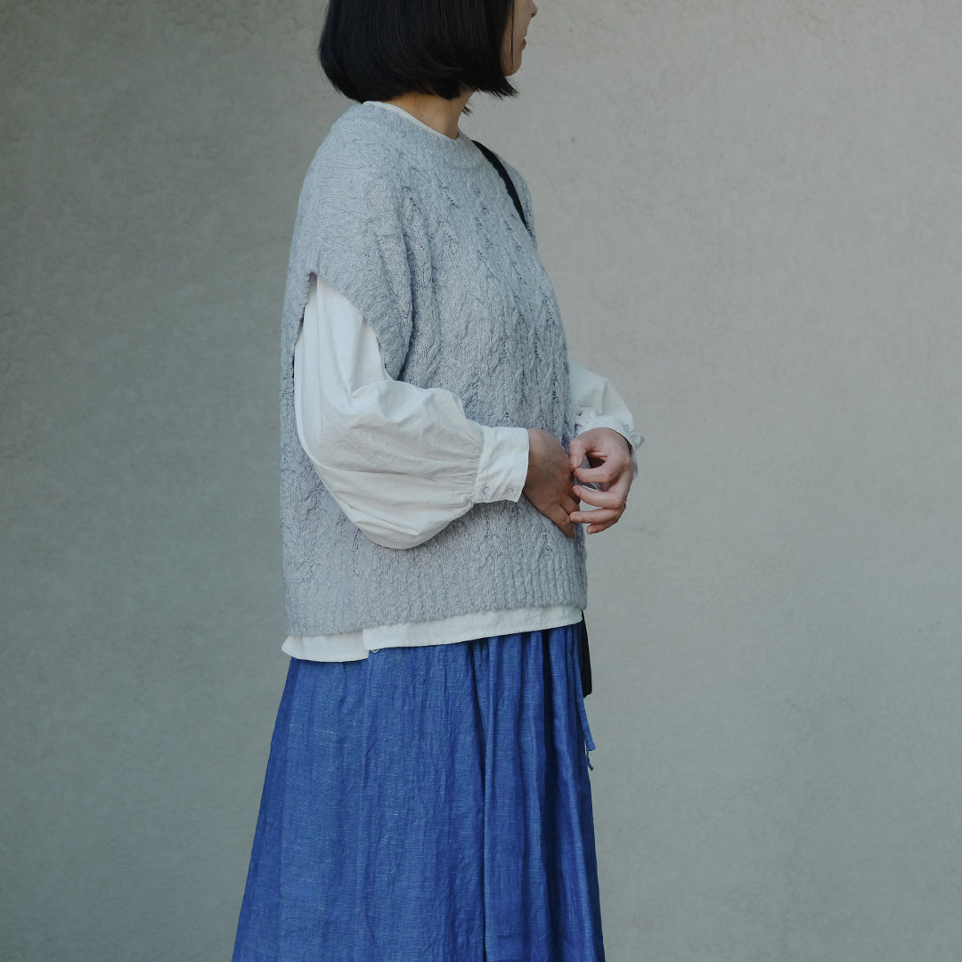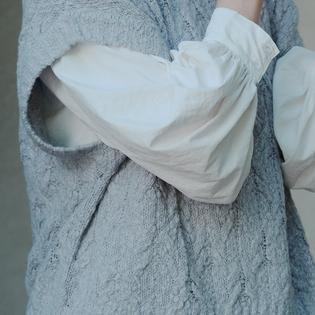 ゆったりとした袖口は、ボリュームのあるシャツでも無理なく重ねられます。
