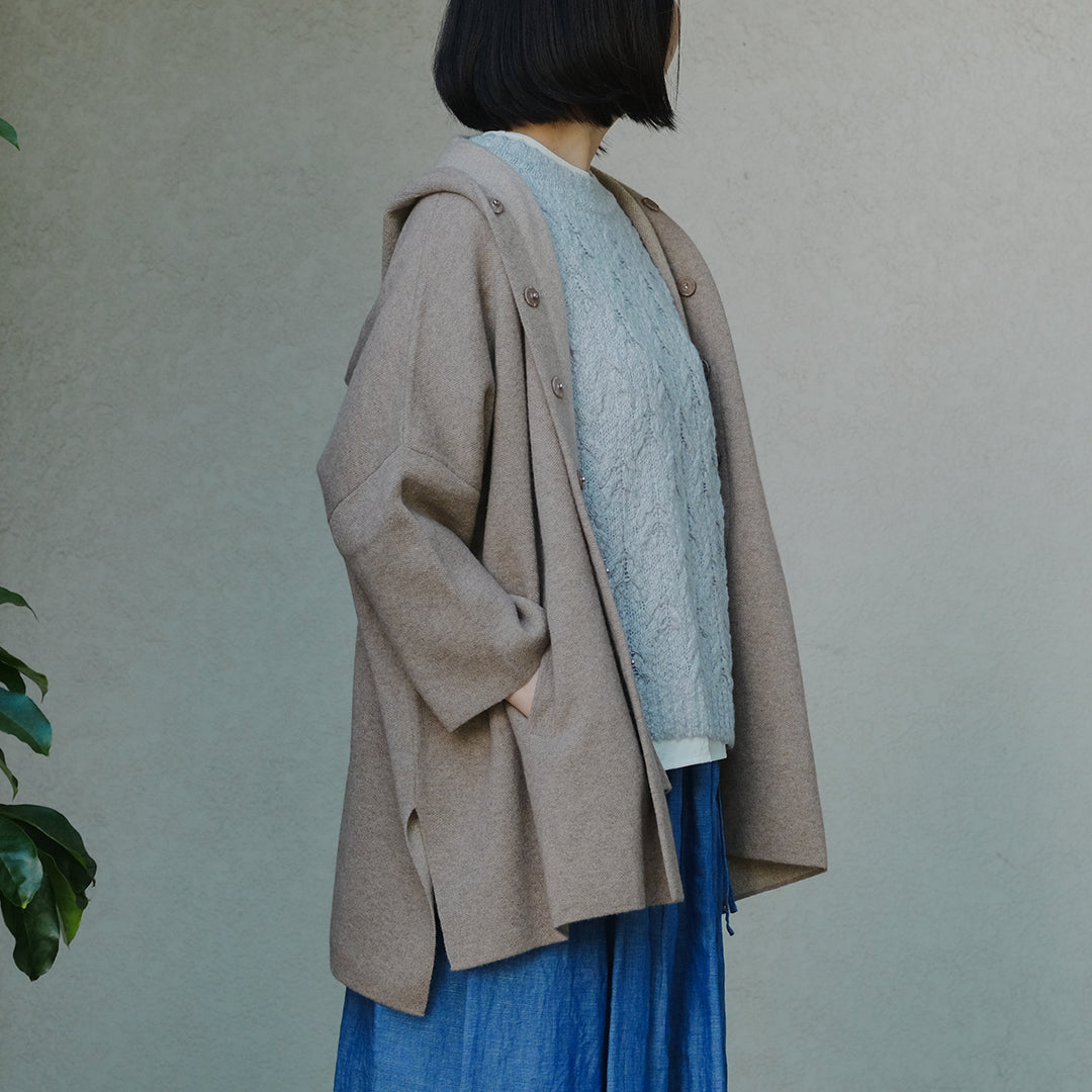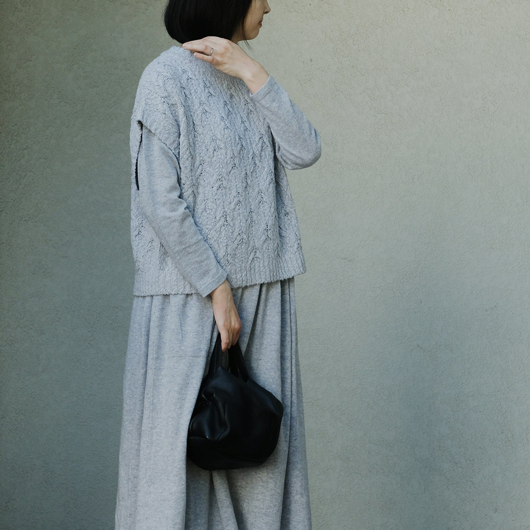 身体の線を拾わないゆったりとした身幅で、体型を選ばず着こなすことができます。肩線のないざっくりとしたデザインに、流れるように寄り添うやさしい着心地。
