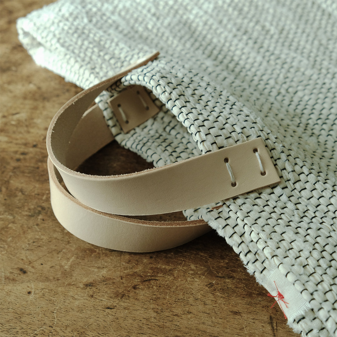 布と布が織りなす趣がここちよい、tatetoyocoの裂き織りアイテム。その伝統的な技術を生かして、今回はトートバッグを仕立ててもらいました。持ち手にはレザーをあしらい、大人が持ちたくなるバッグに仕上がっています。