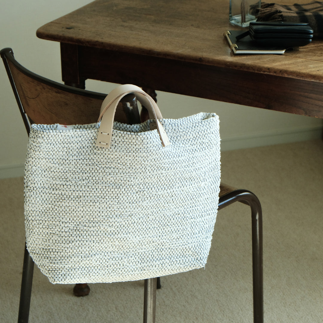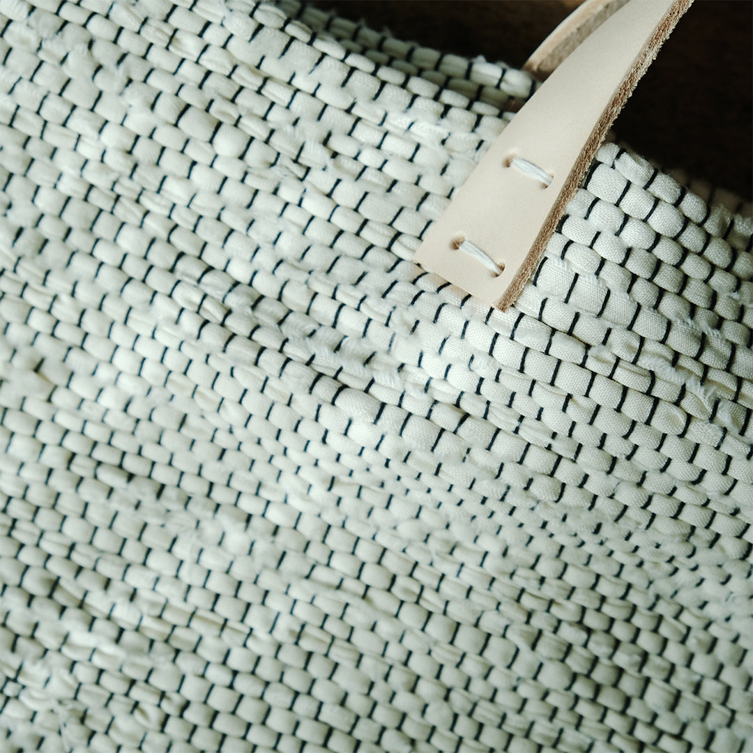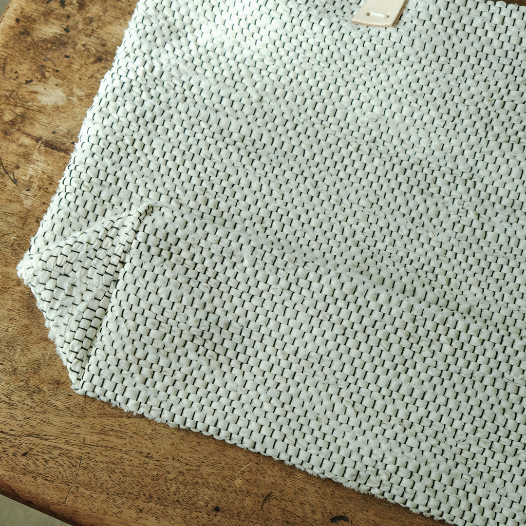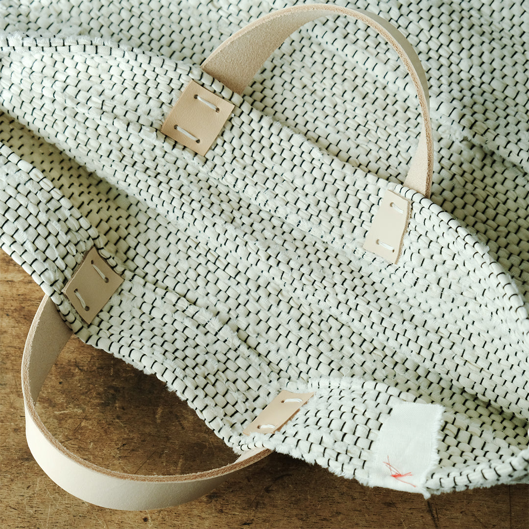 白と黒で織りなす、裂き織りバッグ