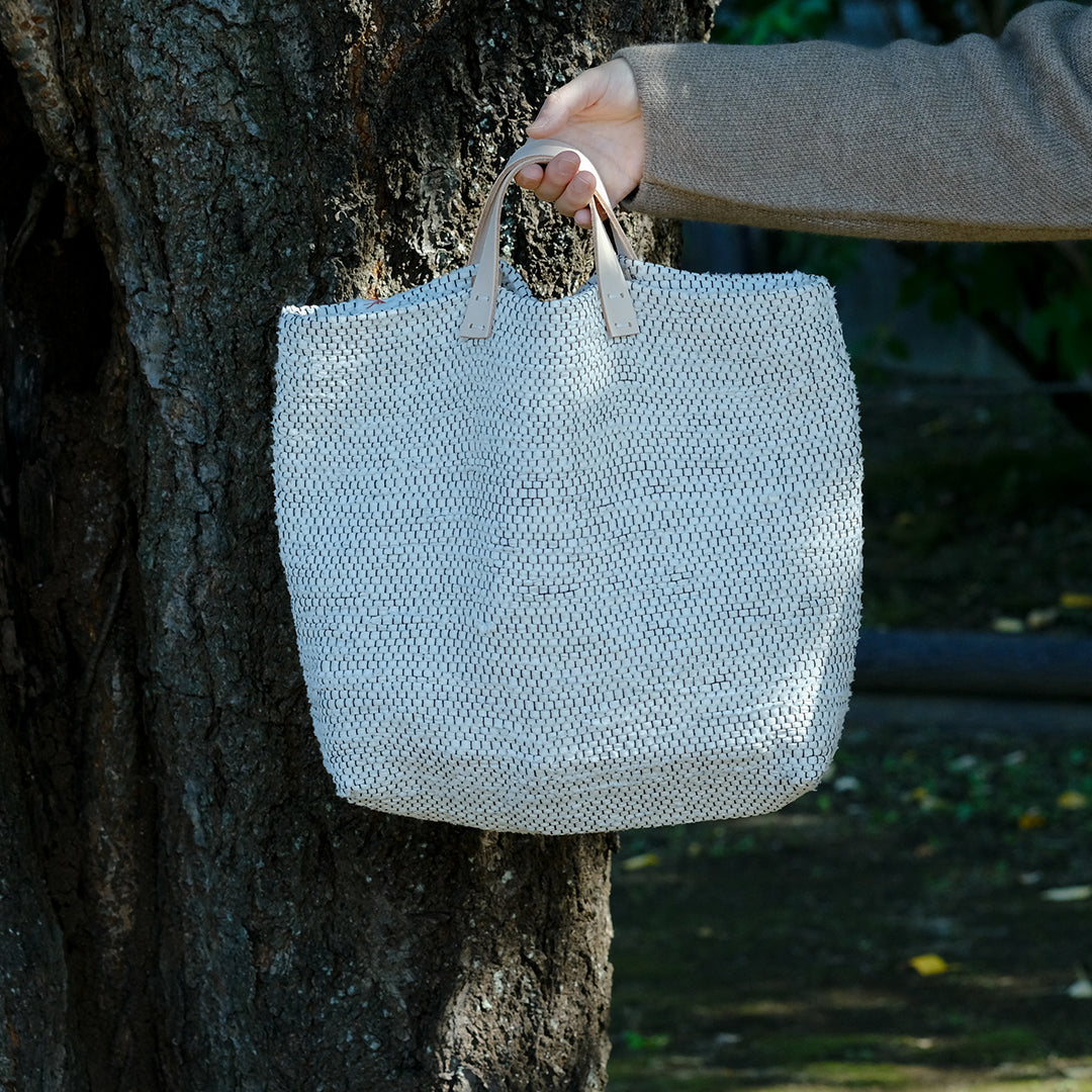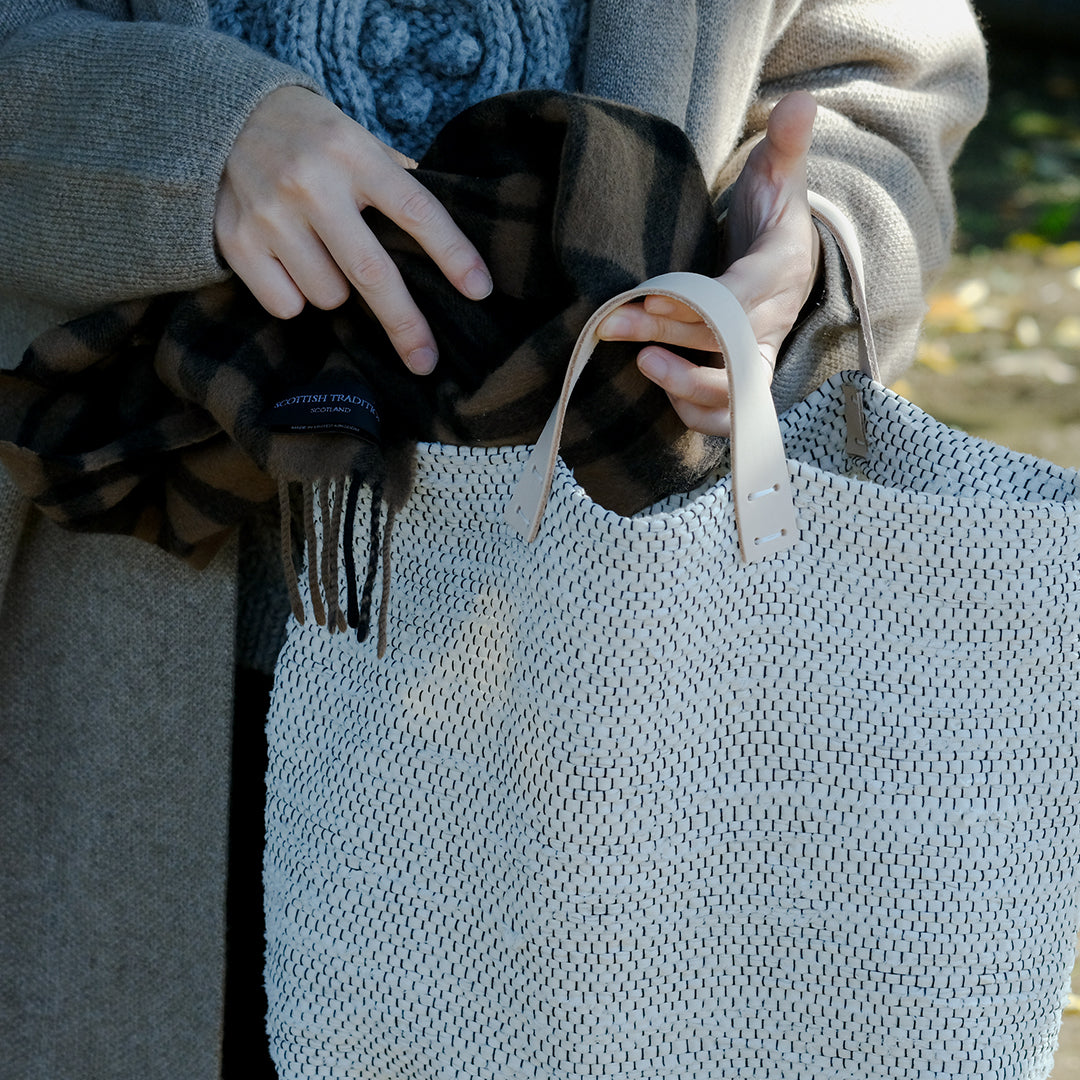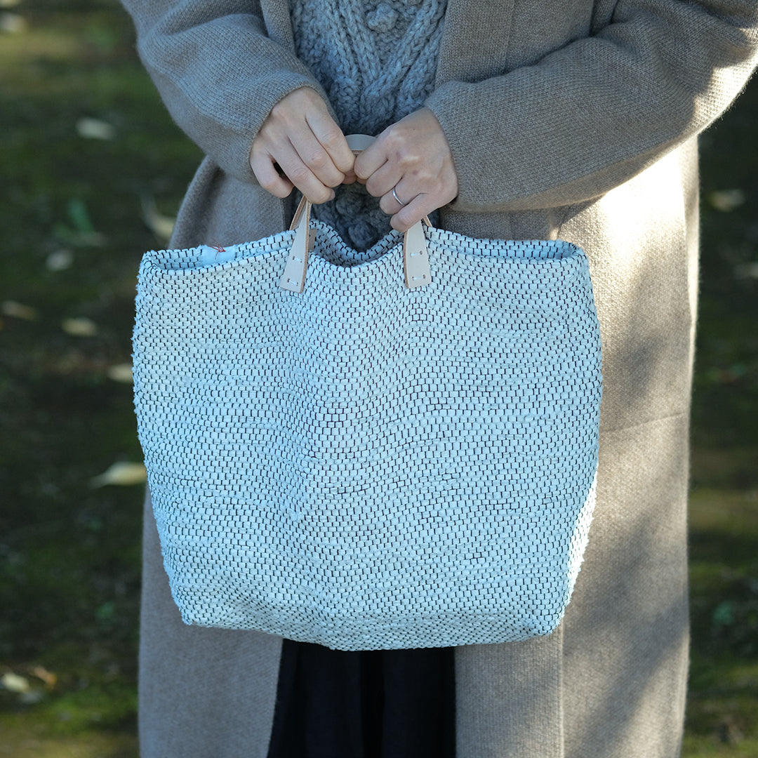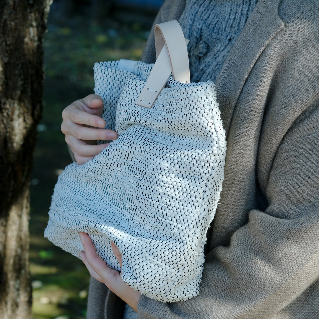 白と黒で織りなす、裂き織りバッグ