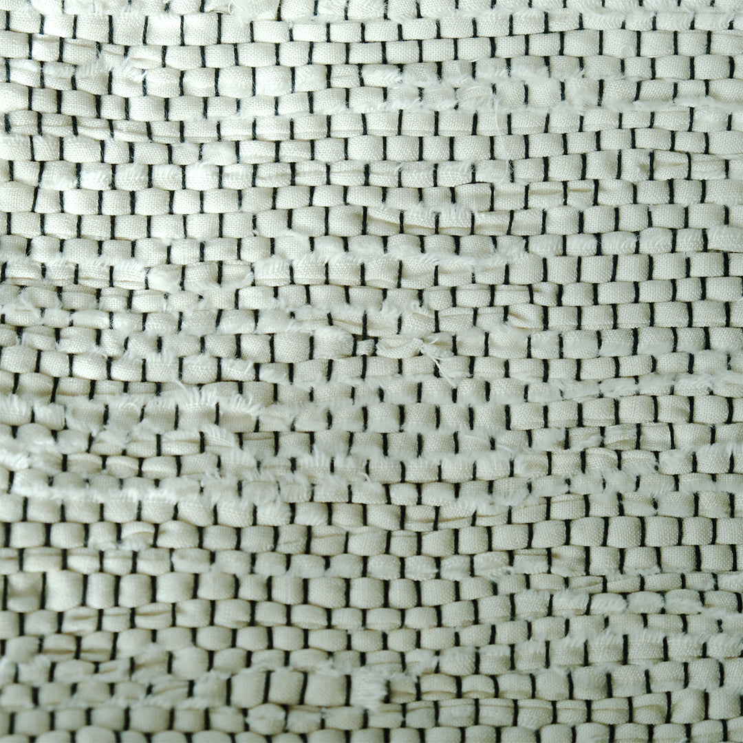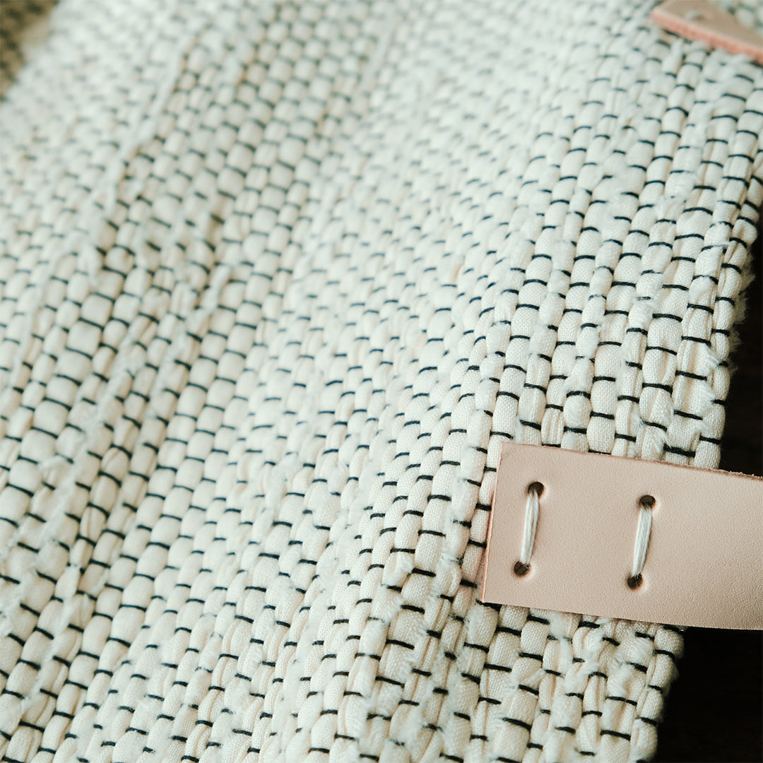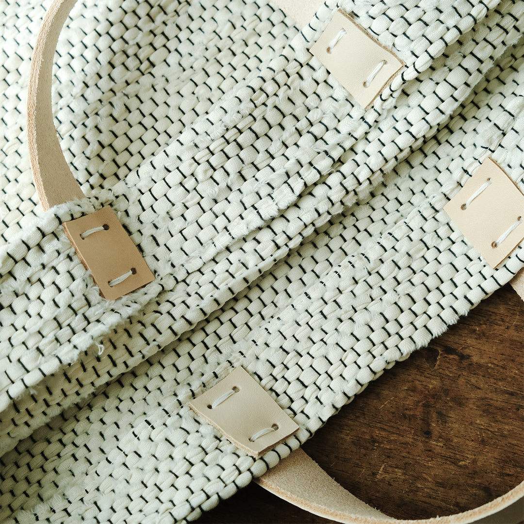 本体は清潔感のある白を基調にしながら、経糸に黒を用いることで、ところどころに黒がのぞく表情豊かな仕上がりに。