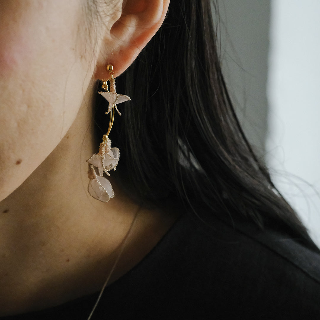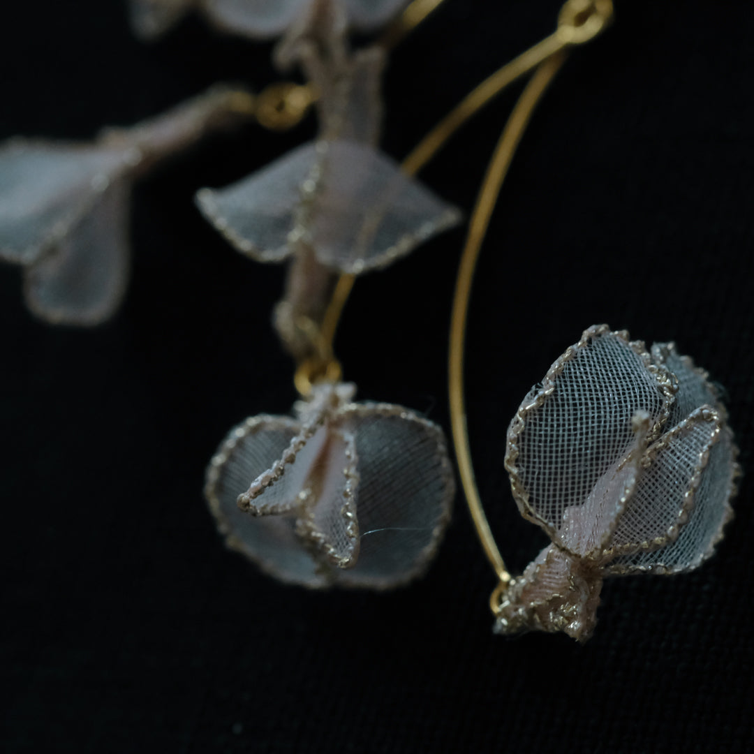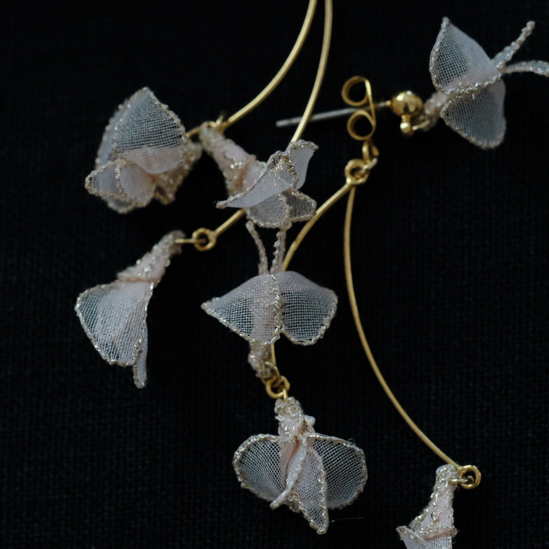 「蔓藤袴(つるふじばかま)」を横振り刺繍で丁寧に描いた耳飾り。光を通すオーガンジーと淡い桃色の糸が、耳元でひらひらと揺れ、野に咲く花の儚く繊細な美しさを映し出します。
