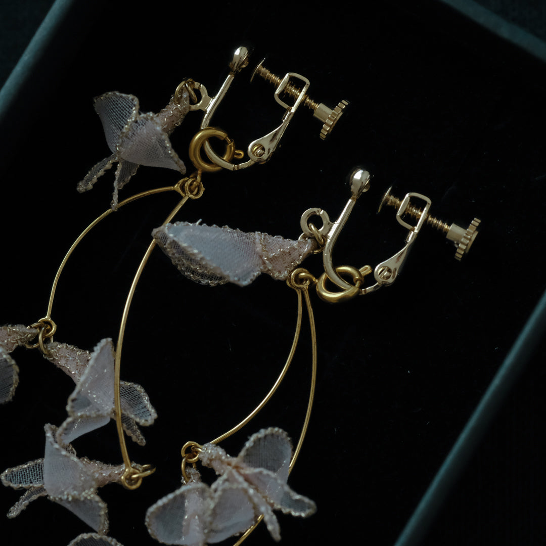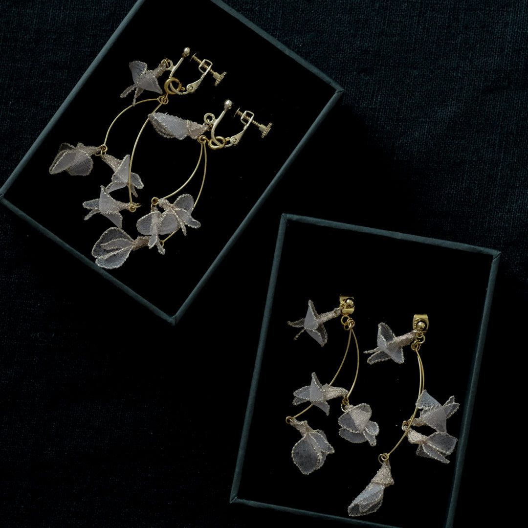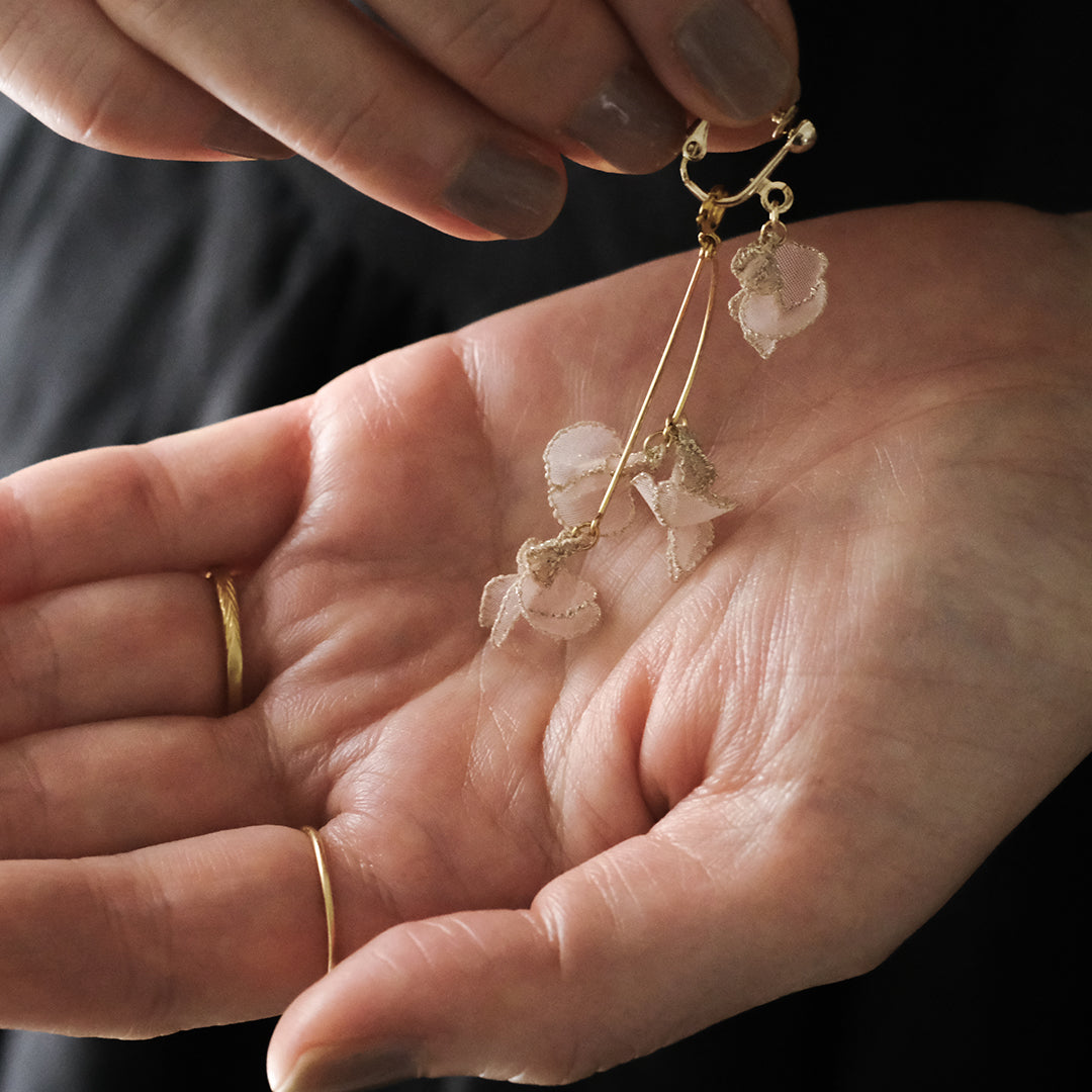 紅紫色の小さく可憐な花を、オーガンジーでひらひらと繊細に表現。耳元で揺れる様子は優美で可愛らしく、装いに華やぎを添えます。