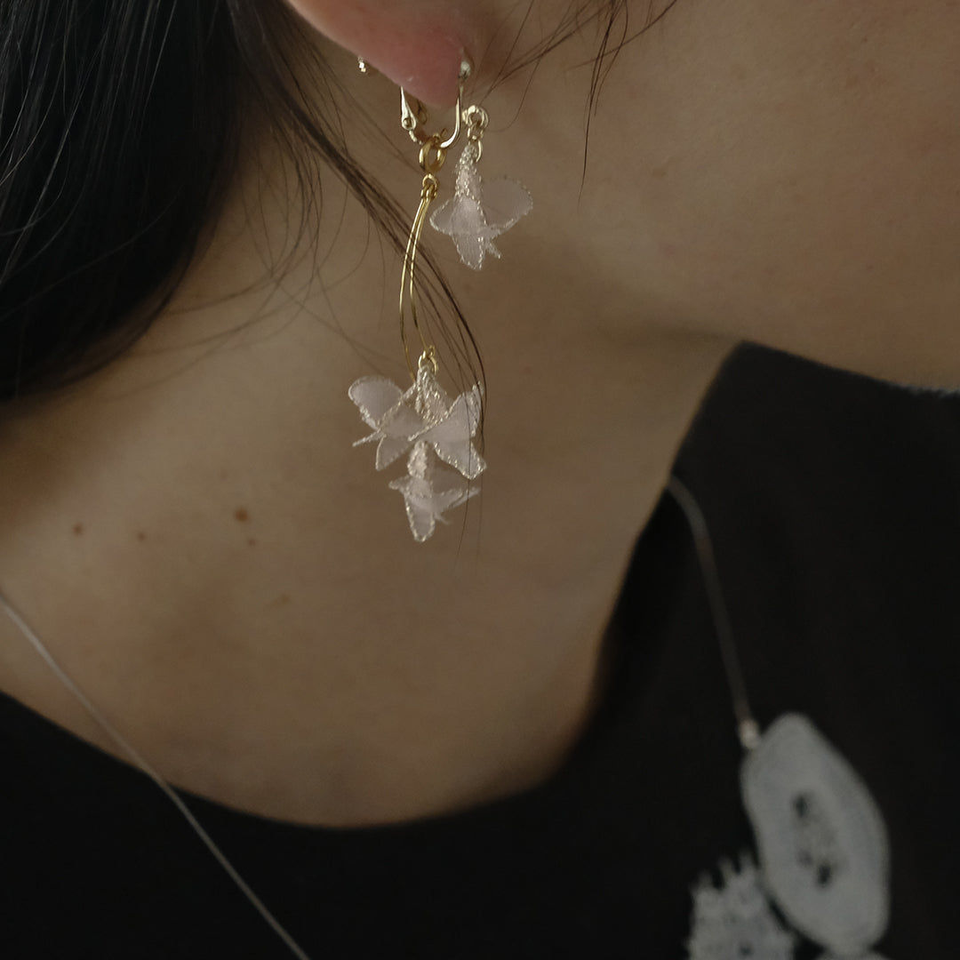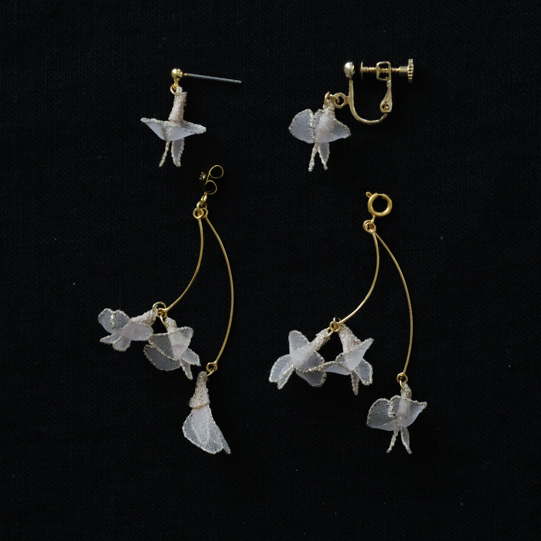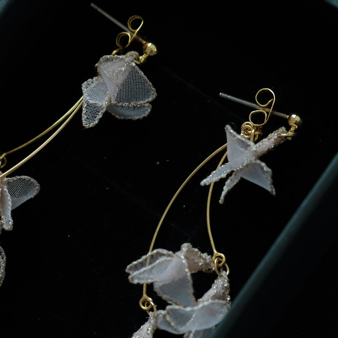 紅紫色の小さく可憐な花を、オーガンジーでひらひらと繊細に表現。耳元で揺れる様子は優美で可愛らしく、装いに華やぎを添えます。