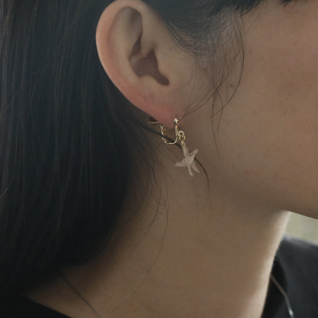 イヤリングの留め具はくるくると調節できるネジバネ式。まるでピアスのように留め具が目立ちにくいデザインです。