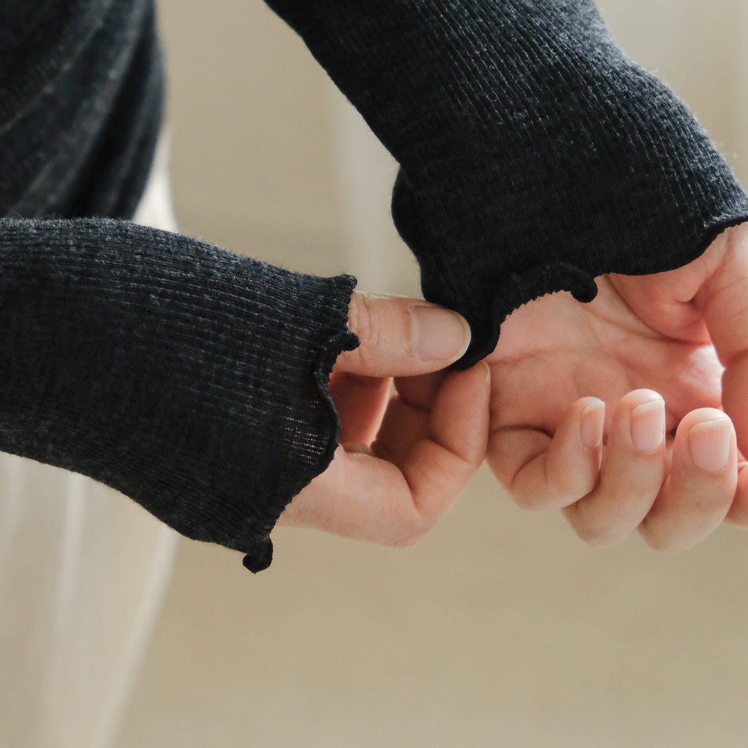 身体に沿うようにフィットし、動きに合わせてしなやかに伸びるリブ編みで長い時間身に着けても快適。ストレスフリーな着心地。
