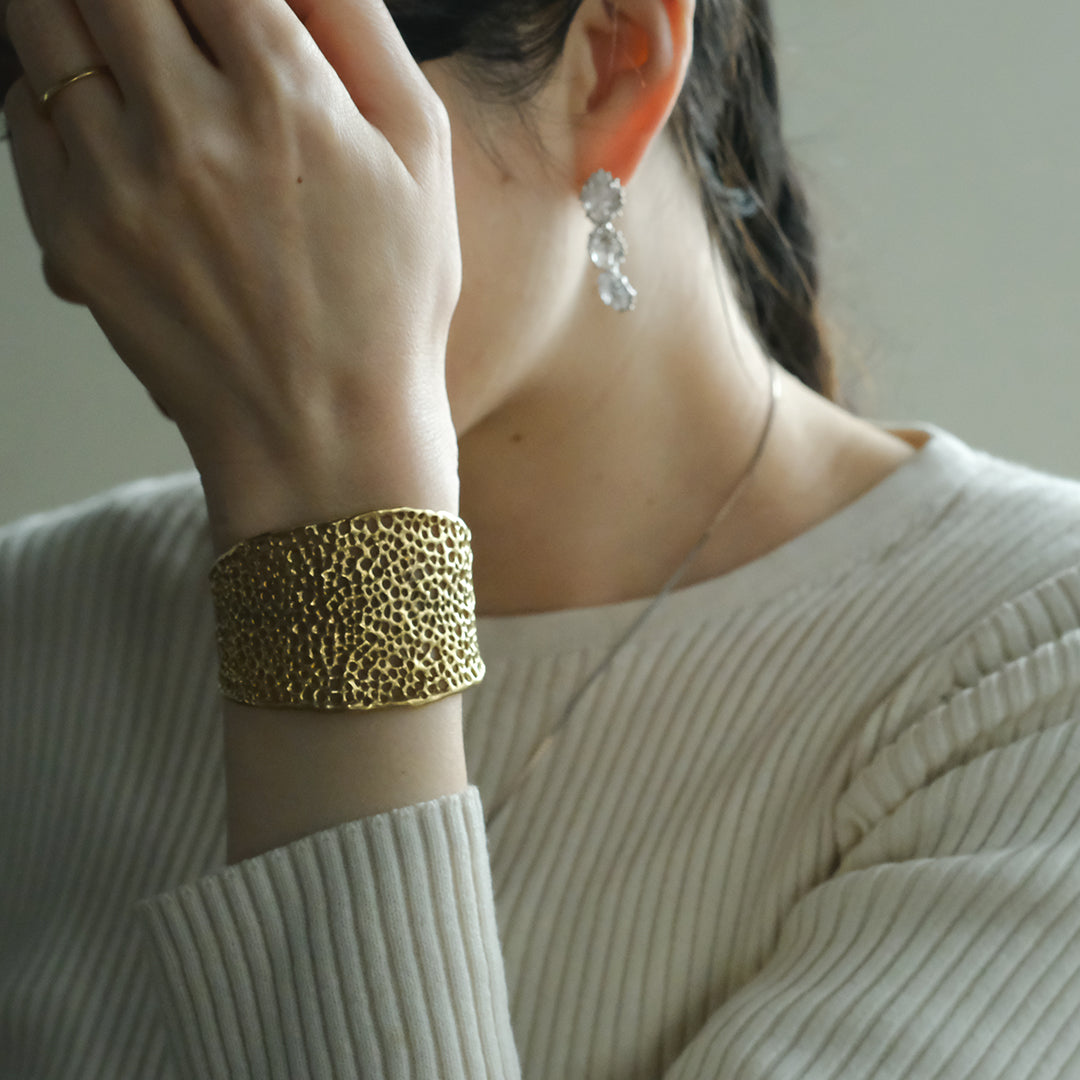 細やかな模様が美しく彩る、レース作品を思わせる金属のバングルです。