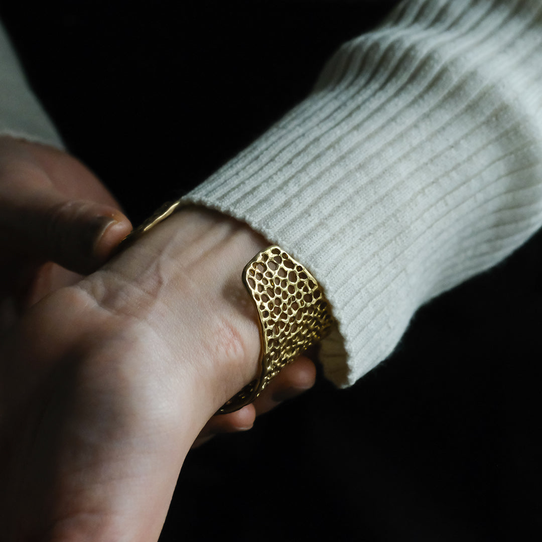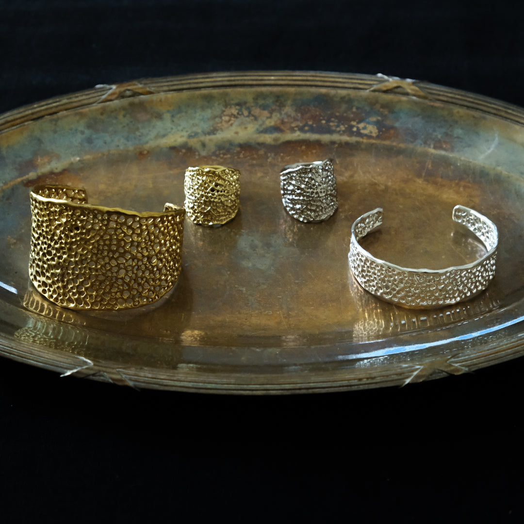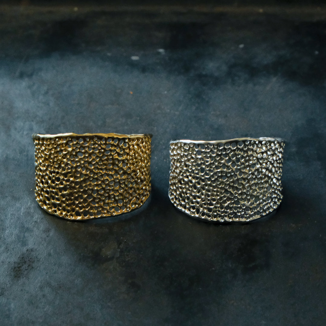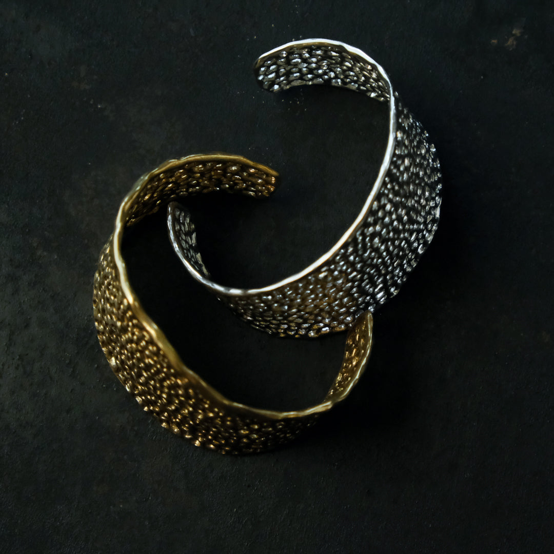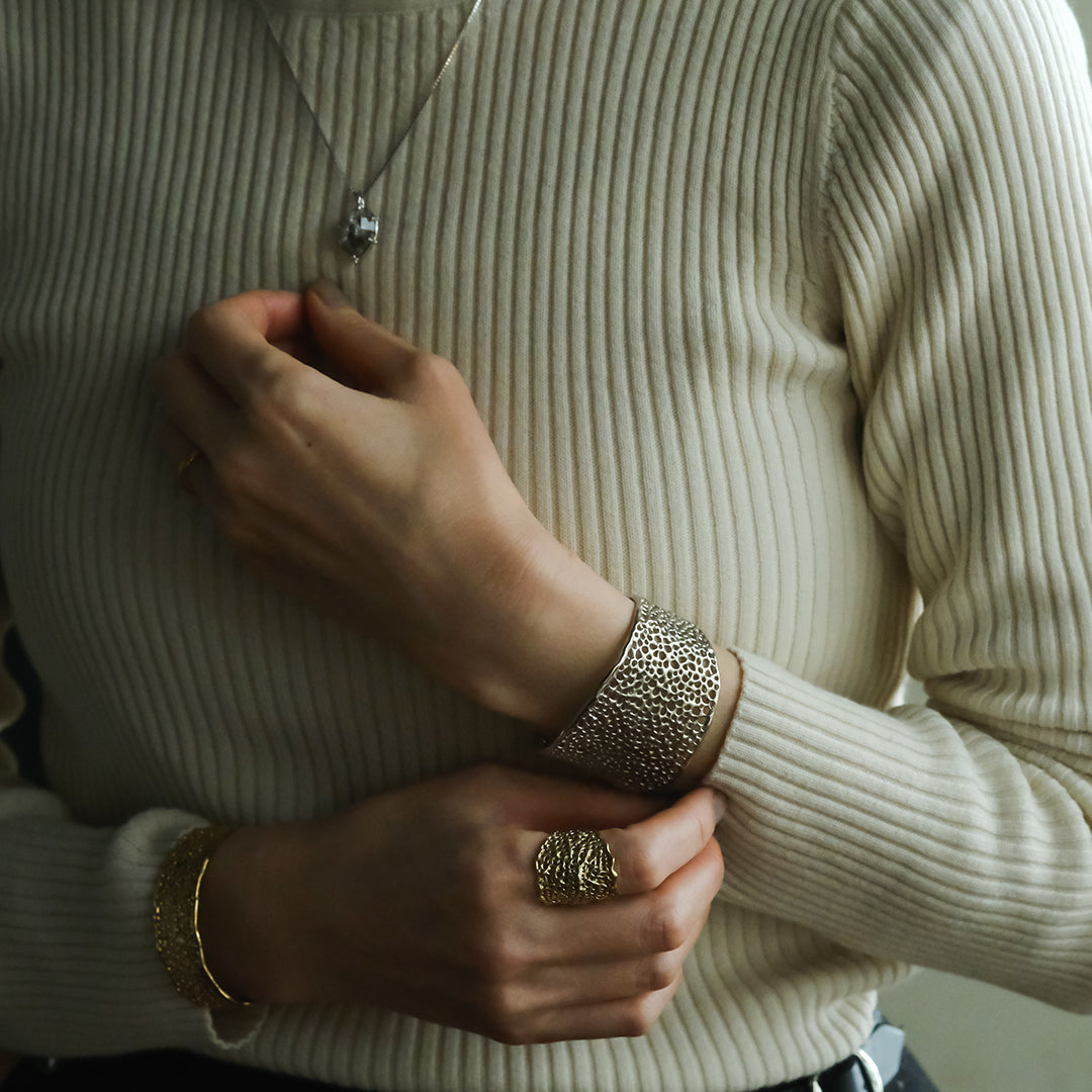 細かい模様で彩られた金属のバングル。まるで一目一目を編み上げたレースのように、光や影を受けて表情を変える美しさがあります。ご注文を受けてからひとつひとつおつくりします。