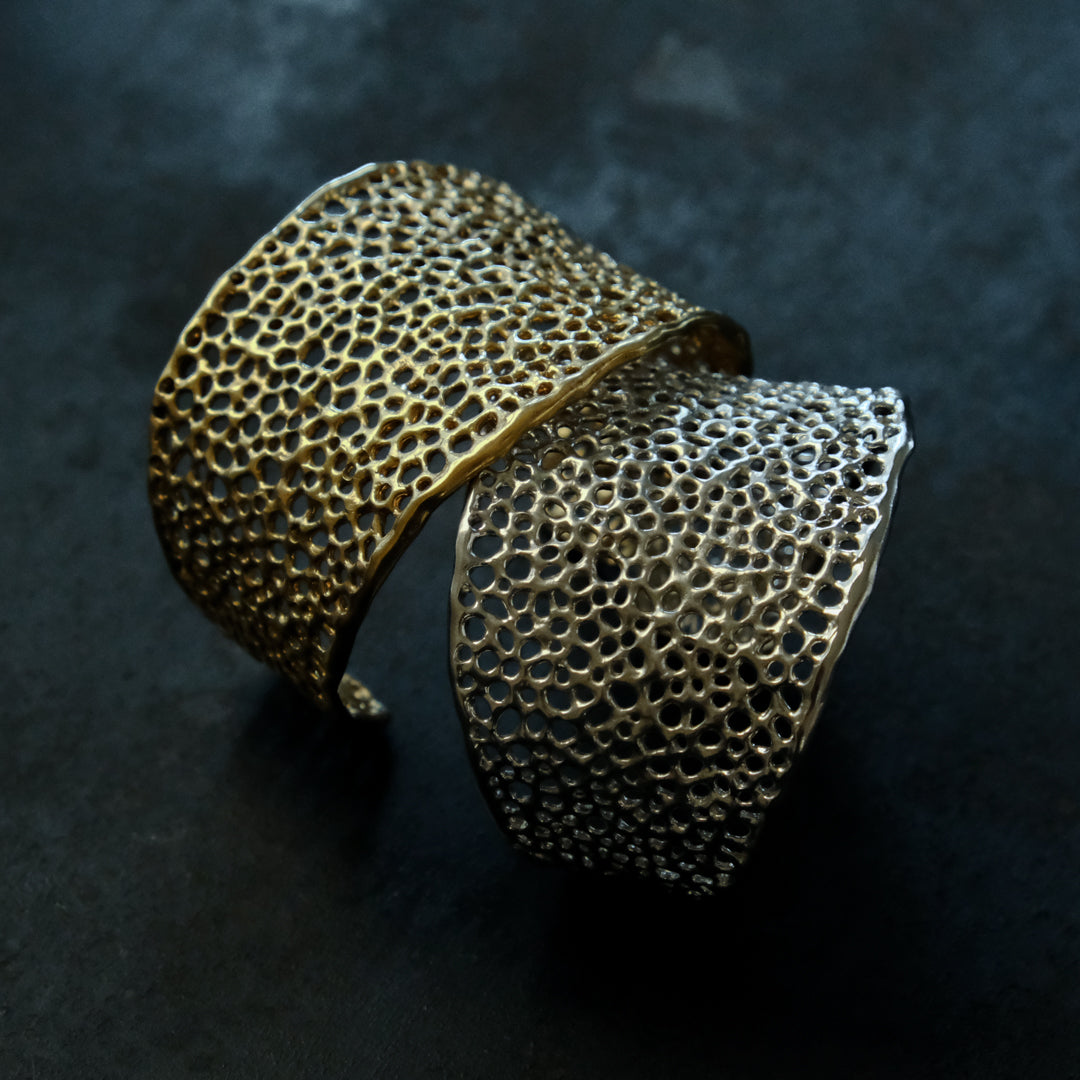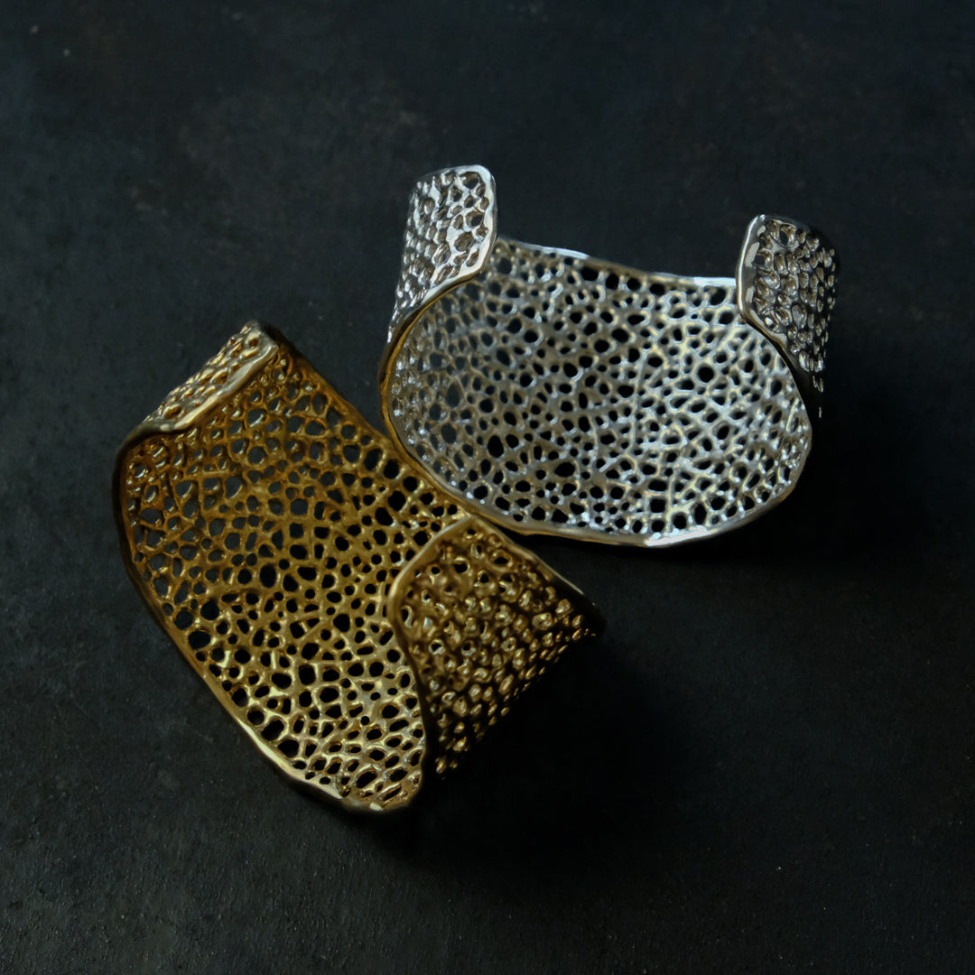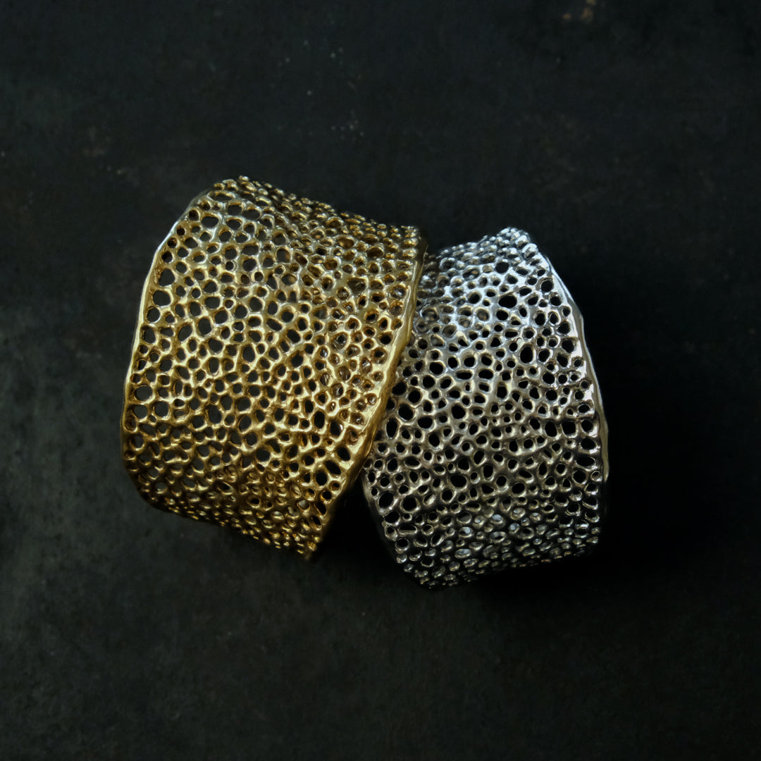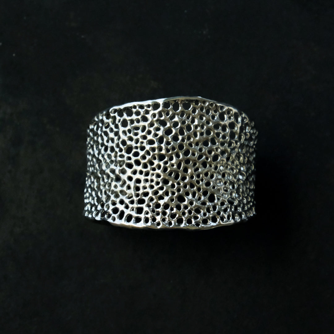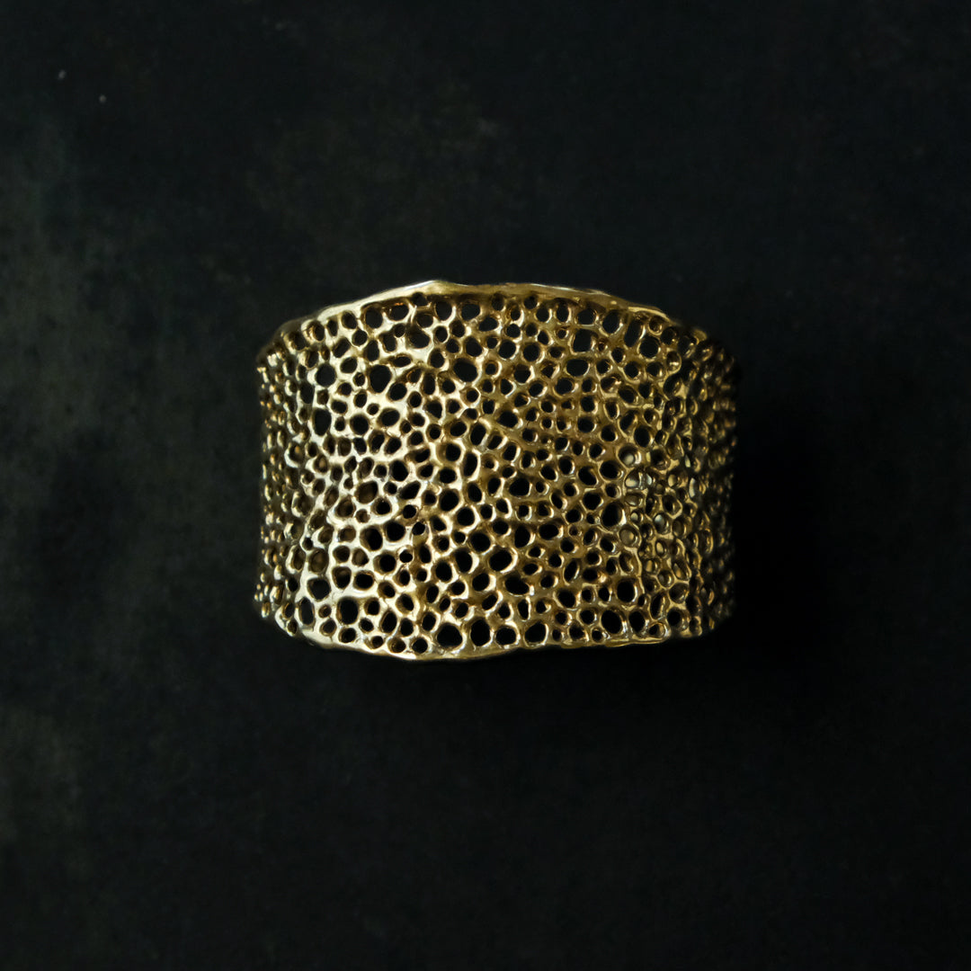 細かい模様で彩られた金属のバングル。まるで一目一目を編み上げたレースのように、光や影を受けて表情を変える美しさがあります。ご注文を受けてからひとつひとつおつくりします。