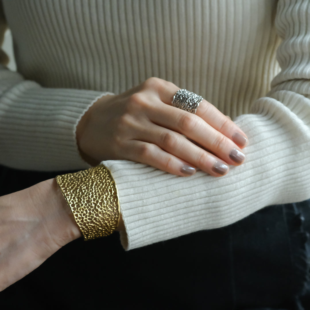 こちらのバングルは、手首に合わせてちょうどいいサイズで制作するので、動きやすく、手元にぴったり寄り添います。