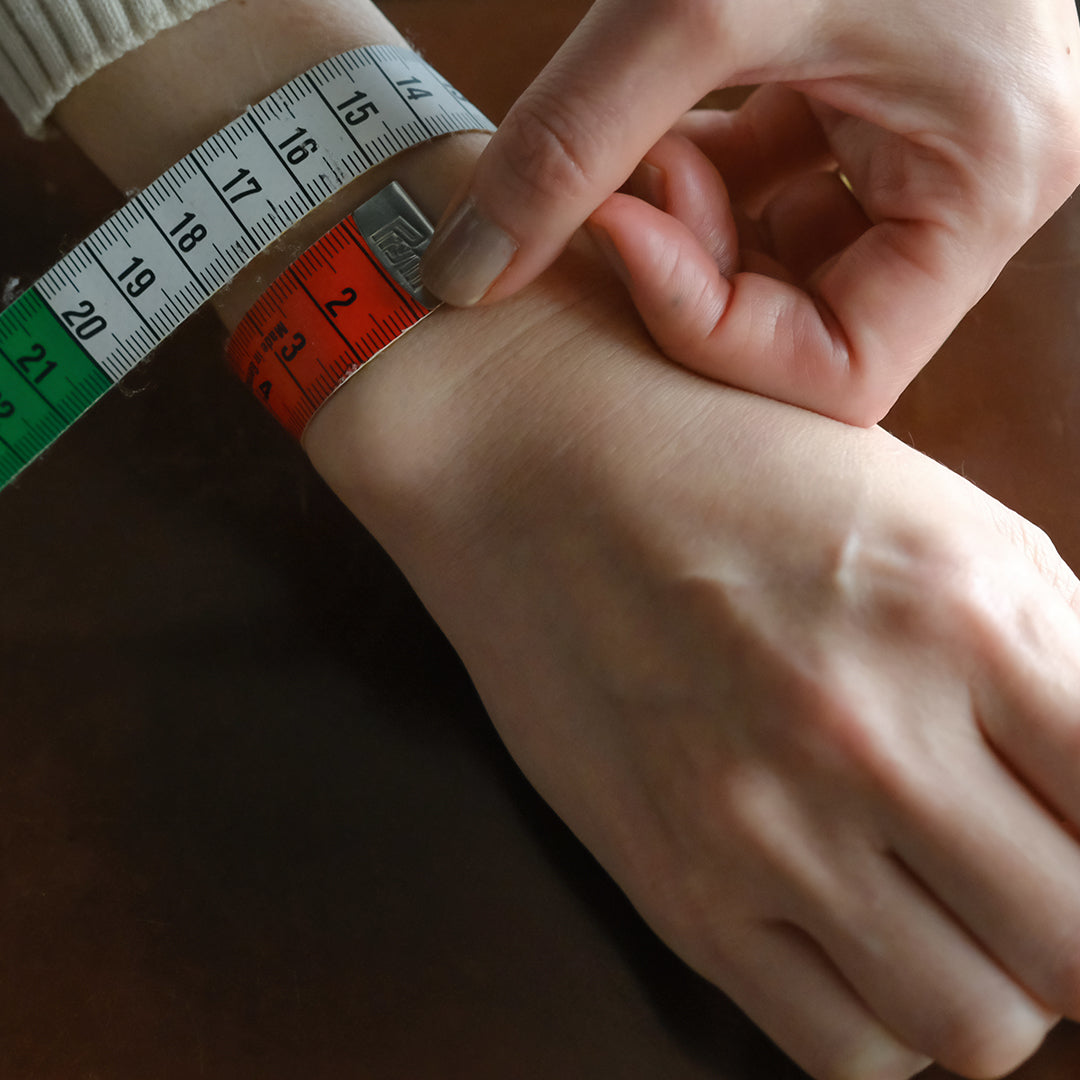 オーダーの際は、手首の出っ張った骨のすぐ下あたりを測ってください。装着する際も、ここから入れるとスムーズに着けられます。