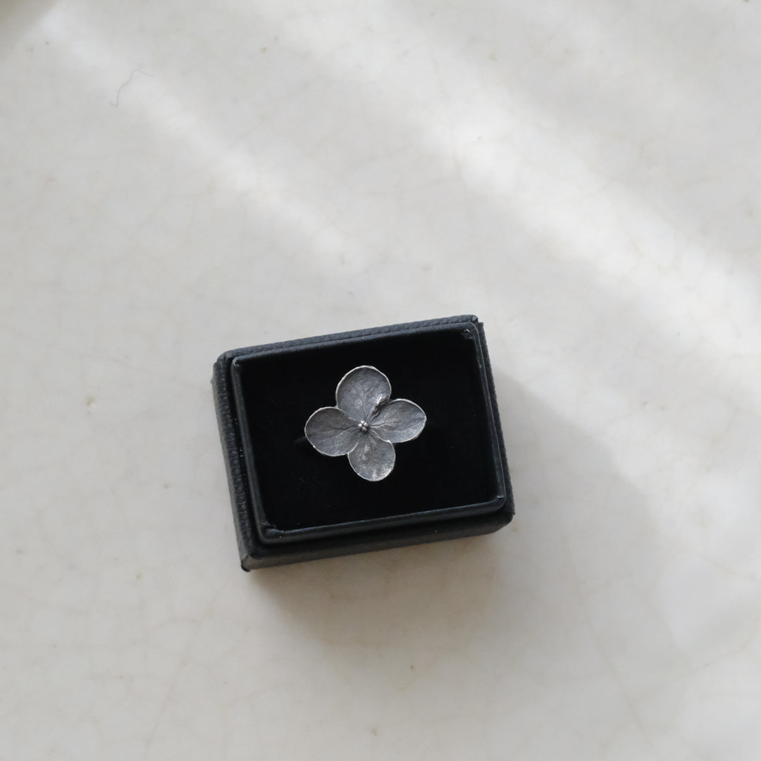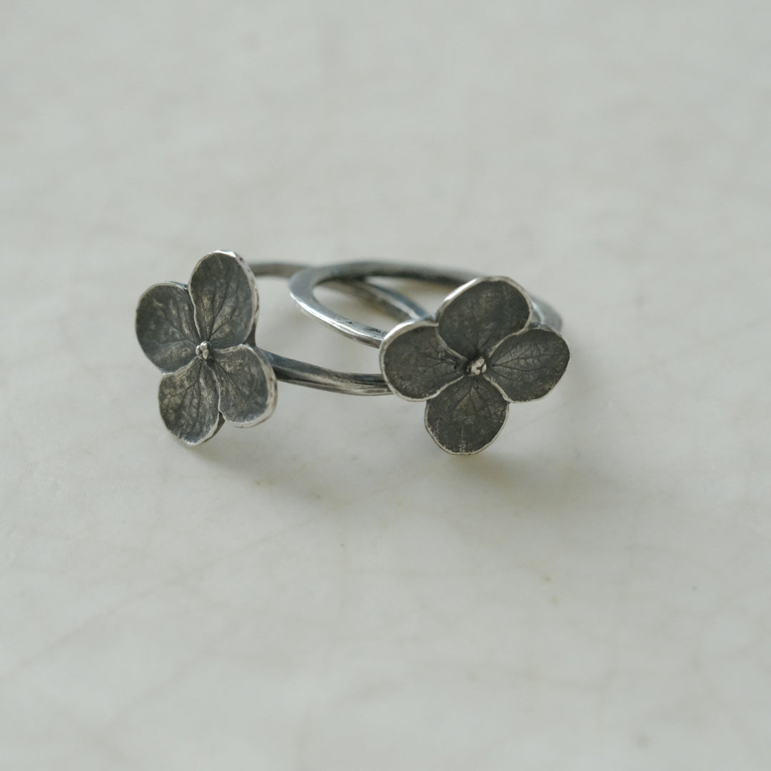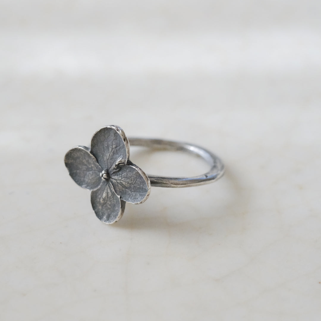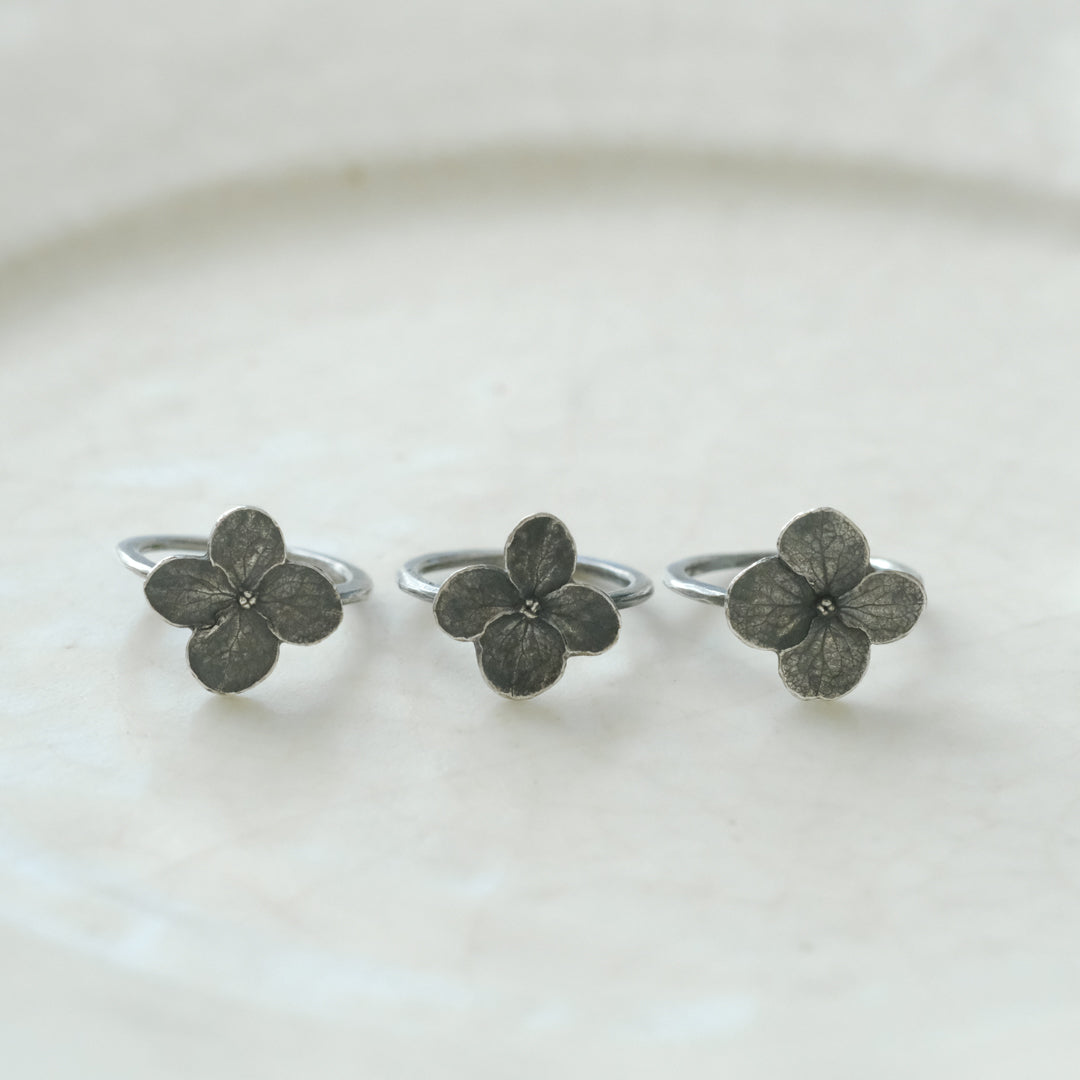 銀粘土作家古橋路子さんによる、アナベルをモチーフにしたリング。細かい葉脈まで写したその姿は、梅雨空のもとしっとりと咲く清楚な花そのものです。