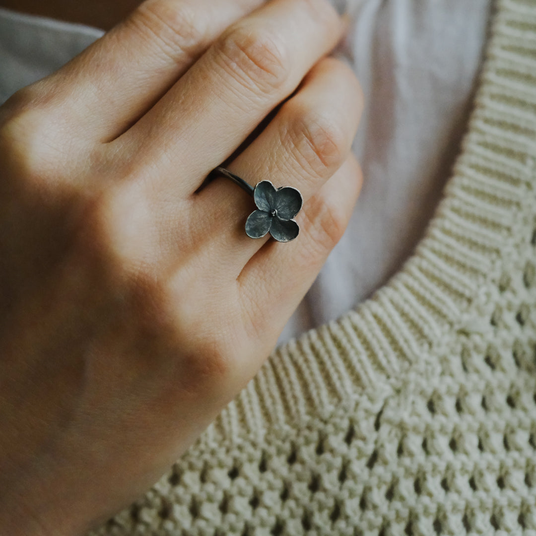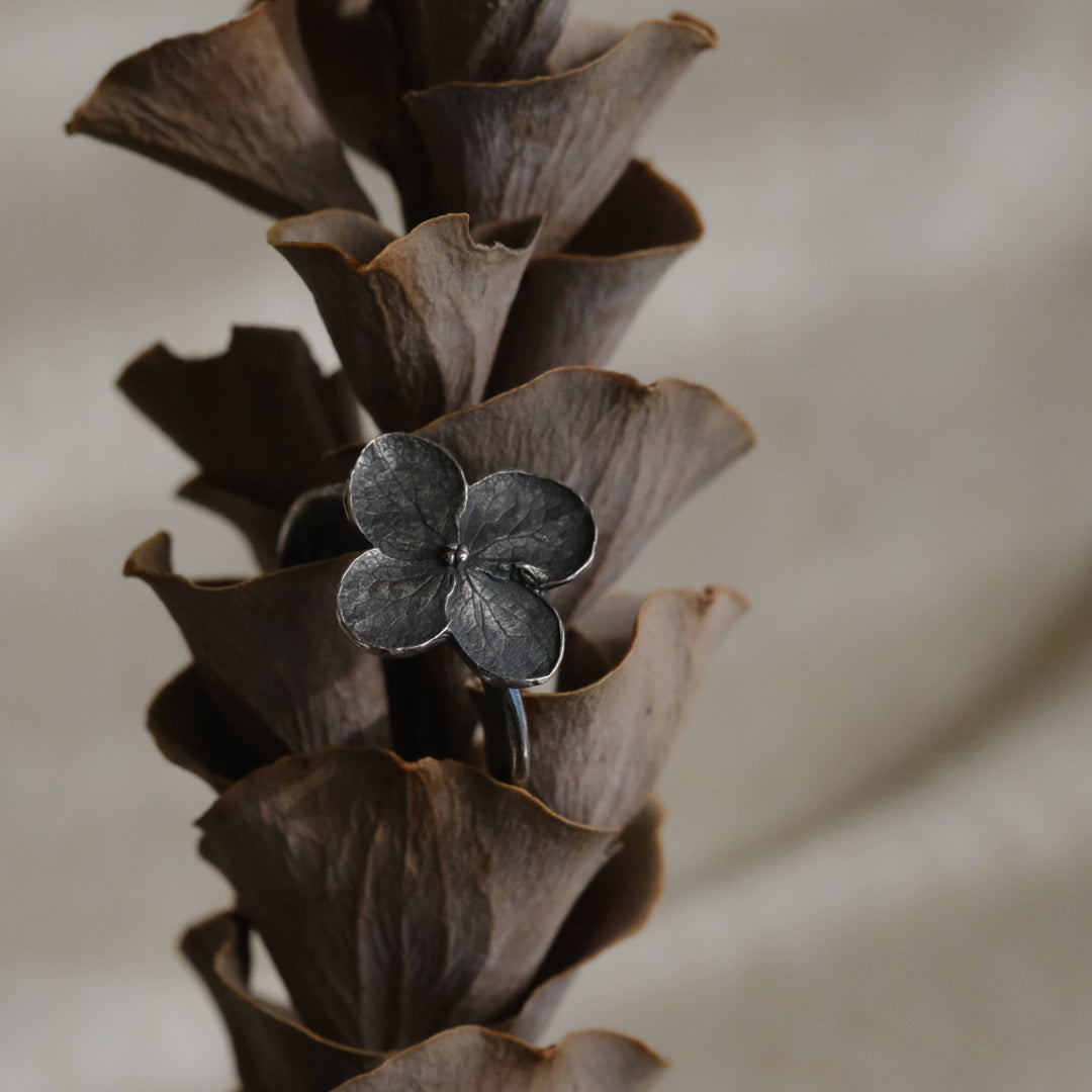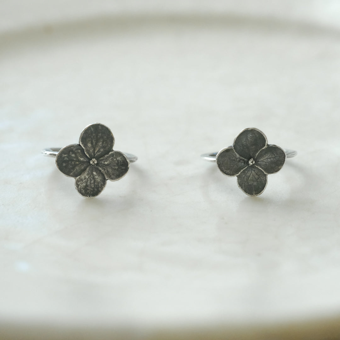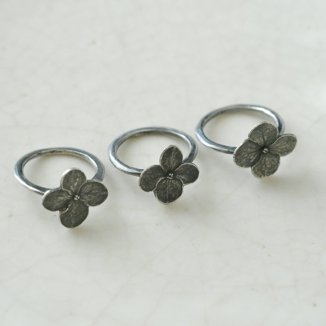 銀粘土作家古橋路子さんによる、アナベルをモチーフにしたリング。細かい葉脈まで写したその姿は、梅雨空のもとしっとりと咲く清楚な花そのものです。