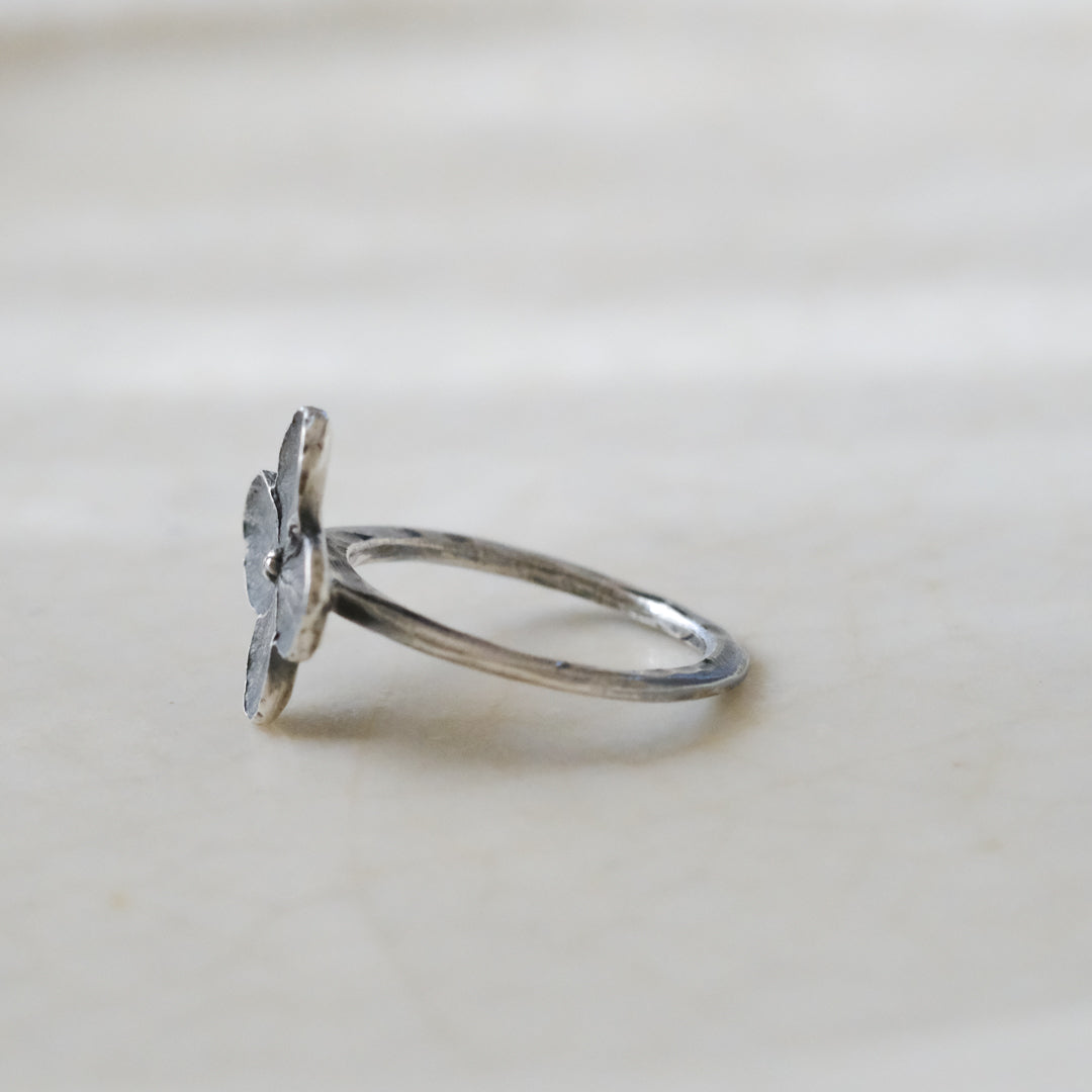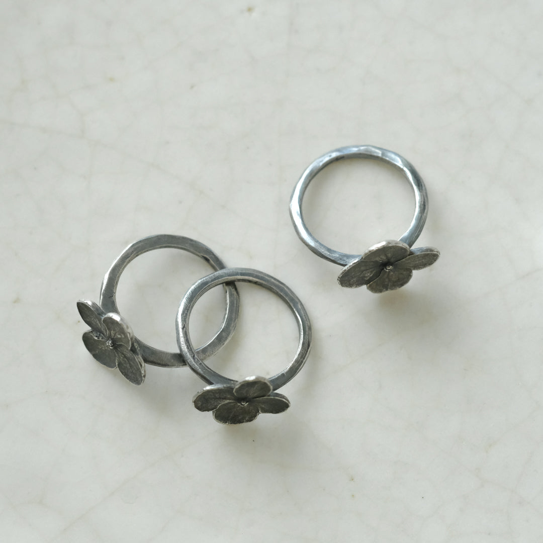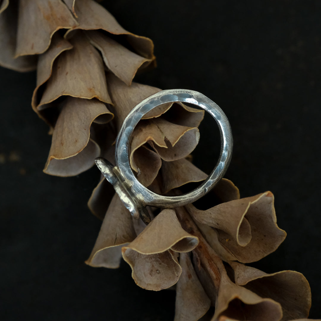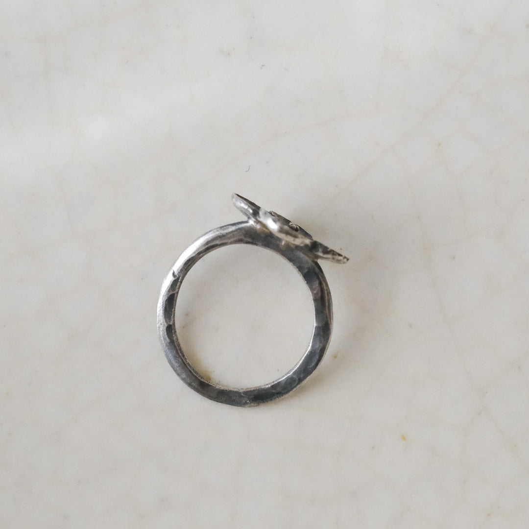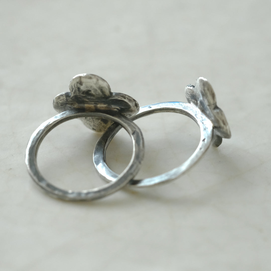 モチーフだけでなく、リングそのものも手で形づくったもの。銀粘土がつくり出す陰影と、手作業でしかつくれないゆらぎを感じます。