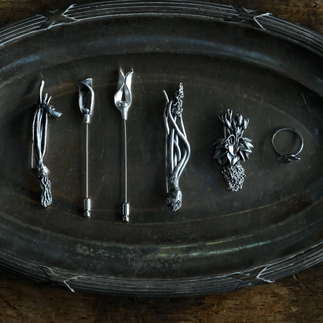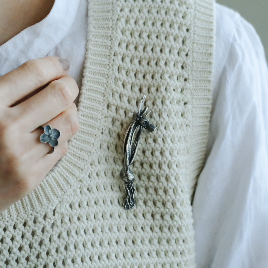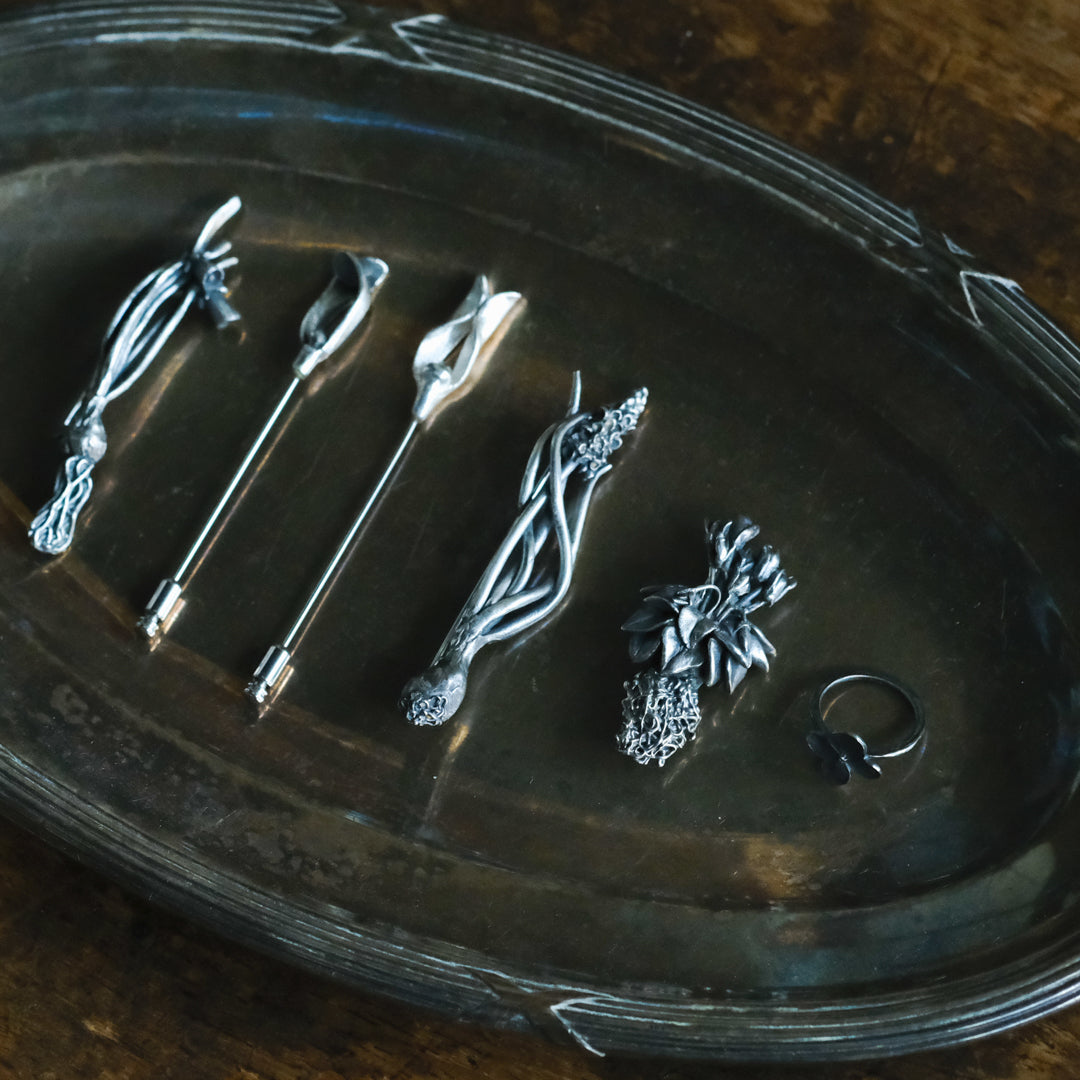 アナベルを写し取ってつくる装身具は、リングのほかにブローチと耳飾りをご紹介しています。シリーズで揃えて身に着けたくなる、特別な装身具です。