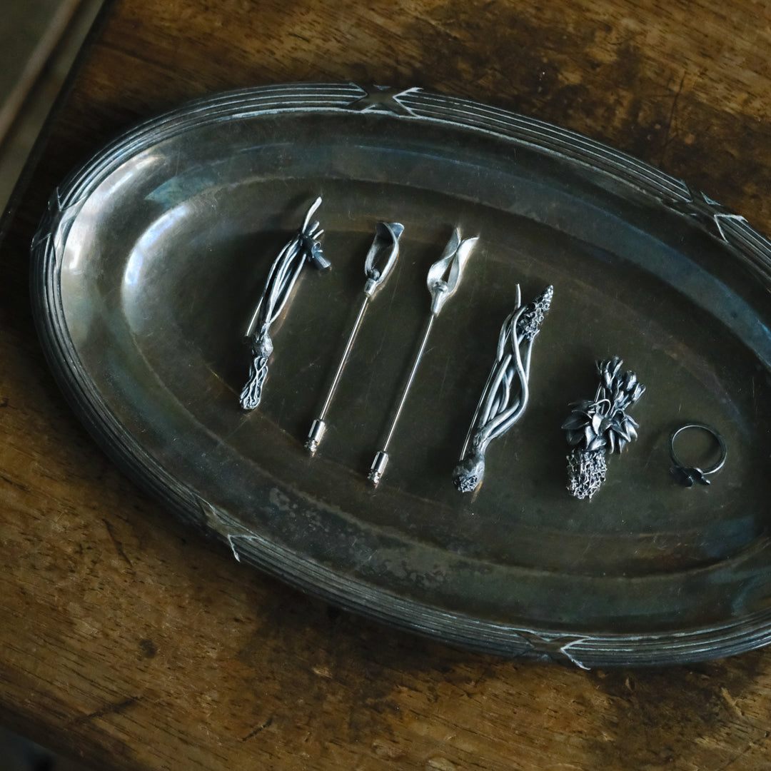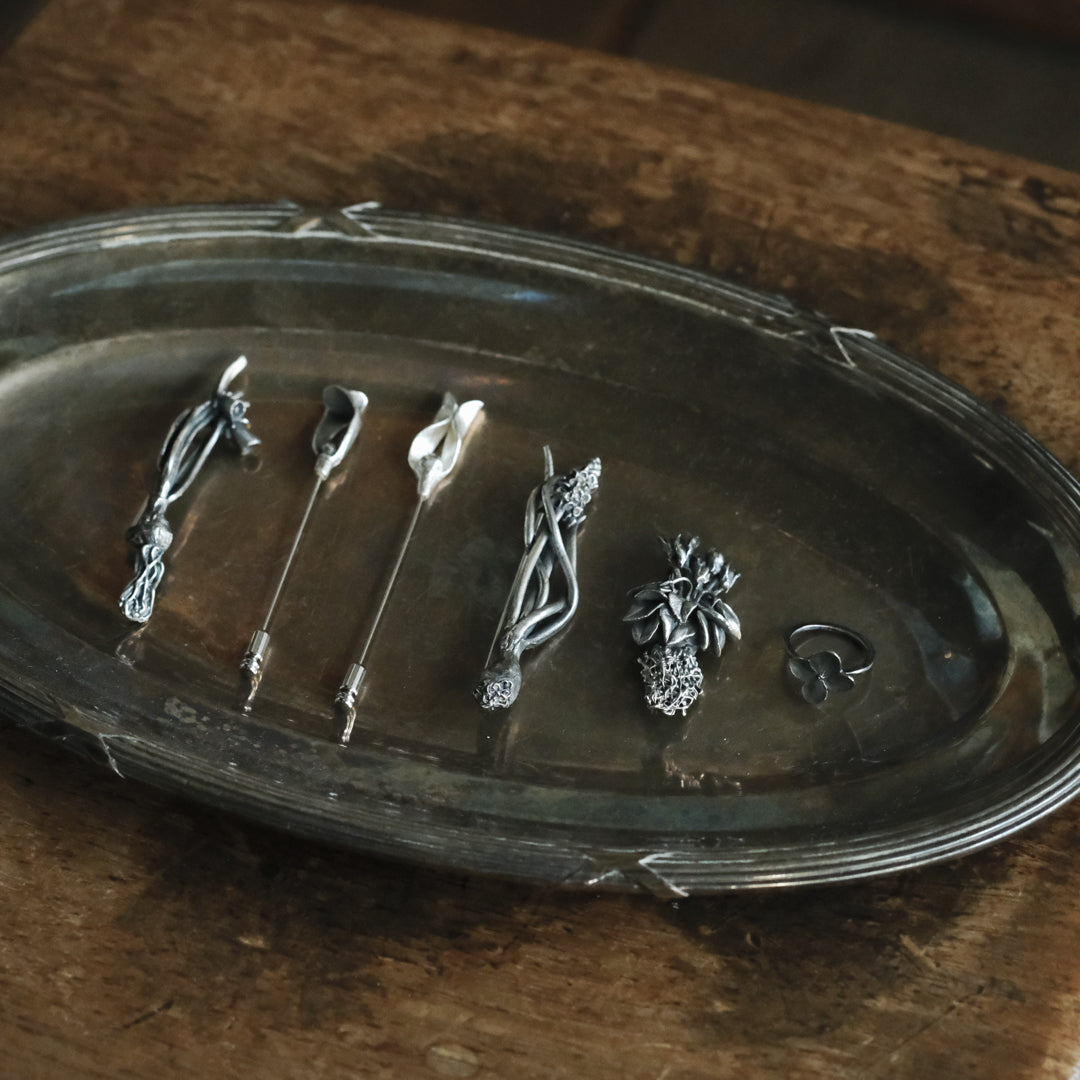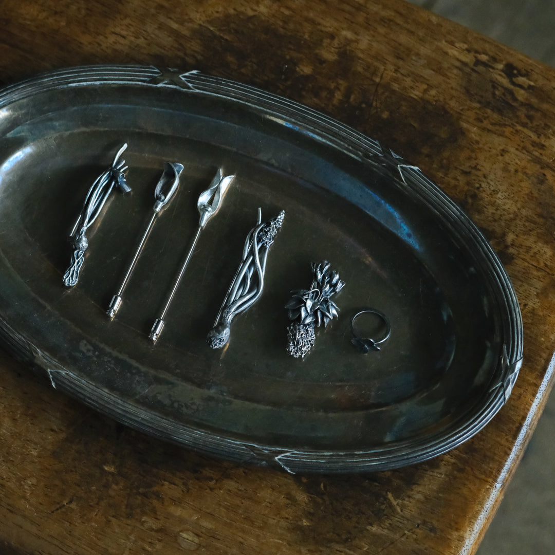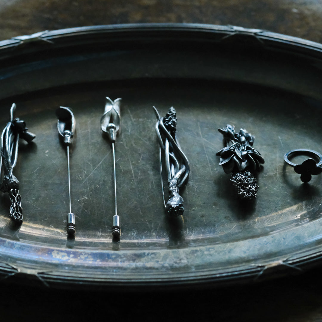 古橋さんは表現したい草花に合わせて技法を選び、この世にひとつだけの装身具や道具を制作します。