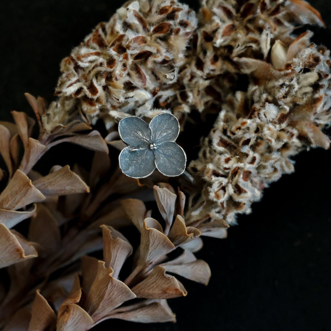 リングに使われているのは、古橋さんの庭で育ったアナベルをドライにしたもの。薄いグリーンに色づいたヴィンテージカラーのアナベルを銀粘土で表現しています。