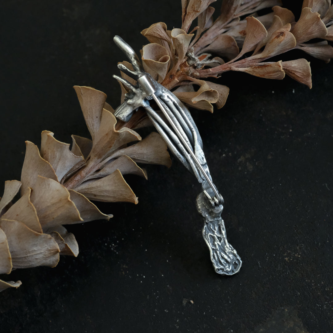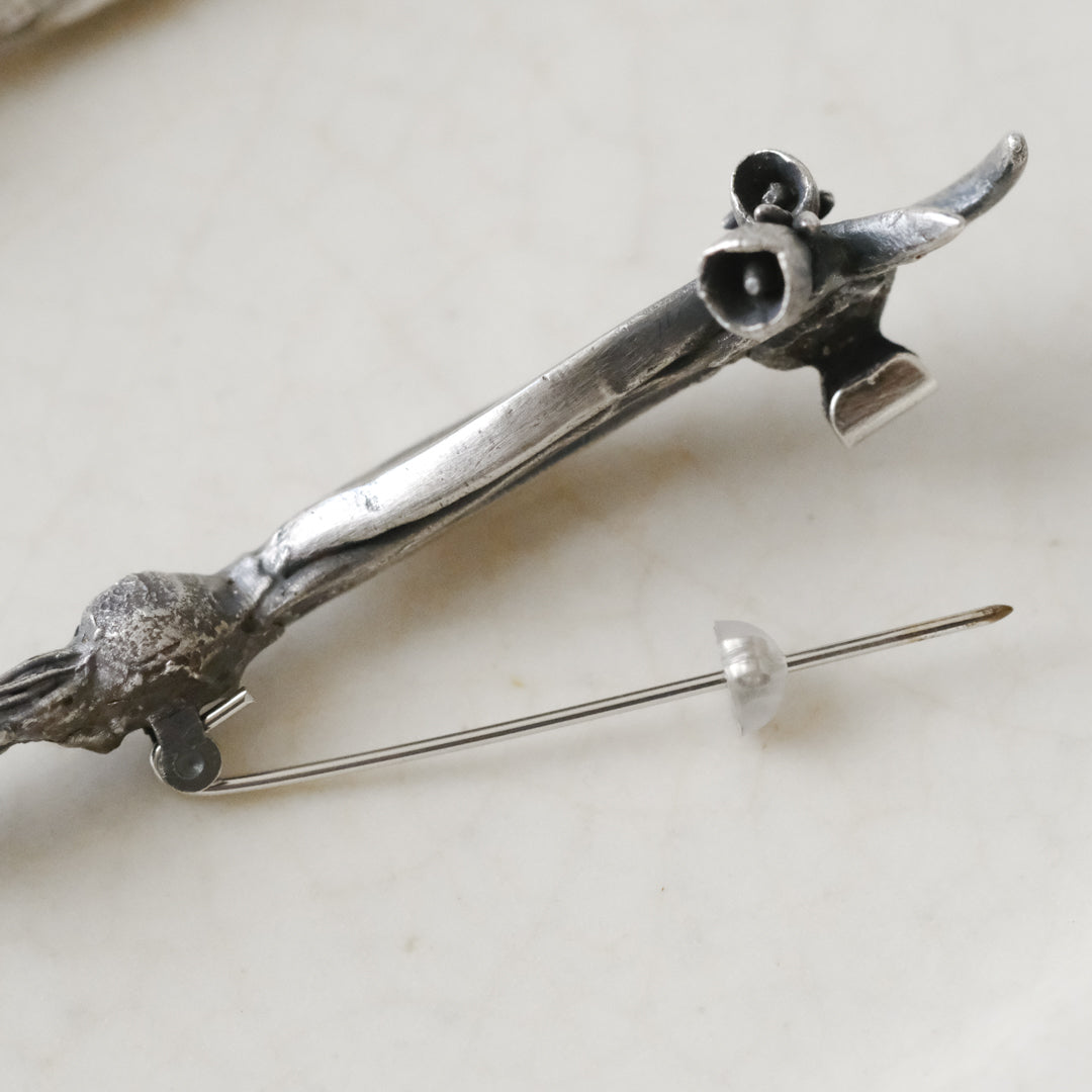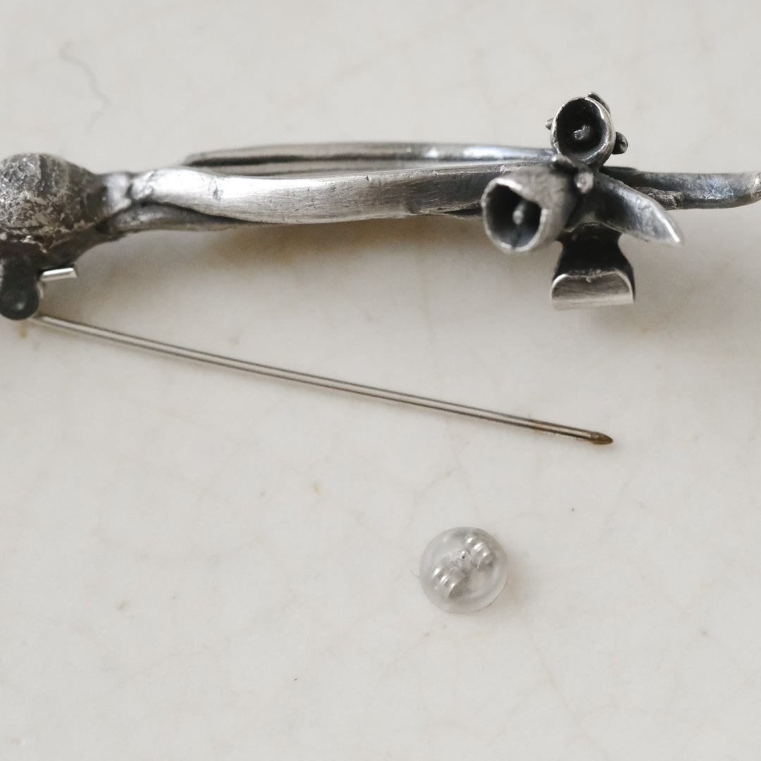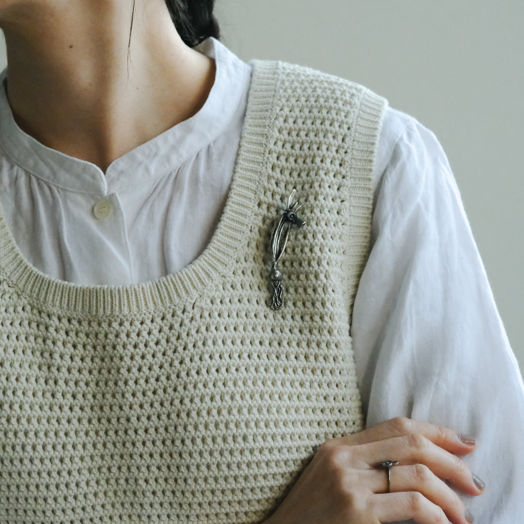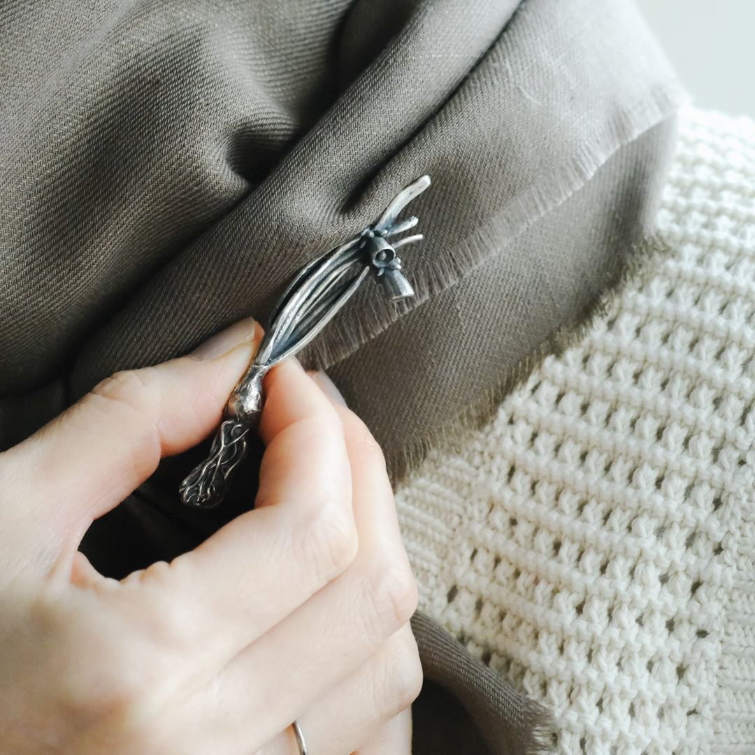 ジャケットの襟元や胸元を彩るシルバーブローチ。ストールや帽子の装飾品としても素敵です。金属でありながら、植物のしなやかさやあたたかみを感じます。