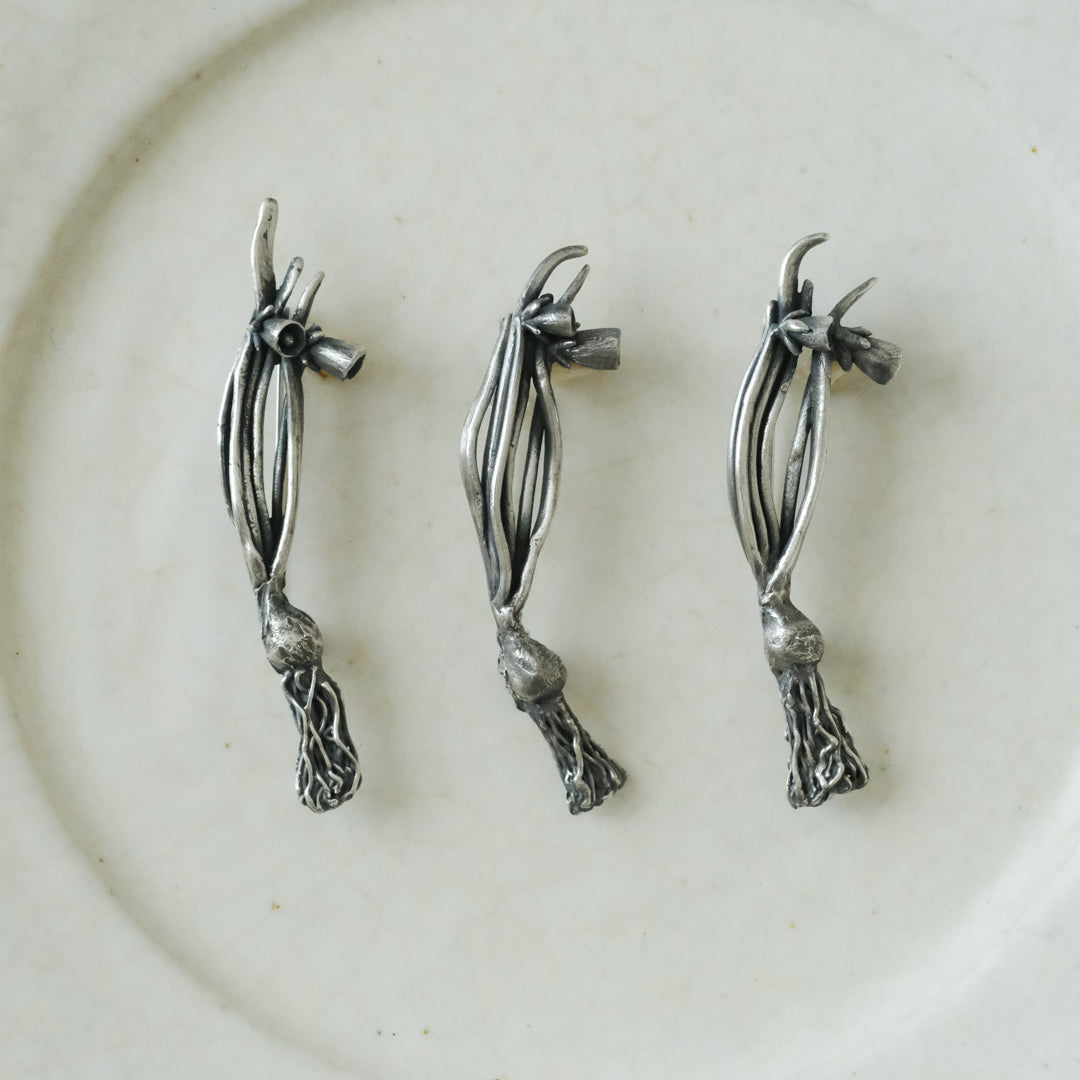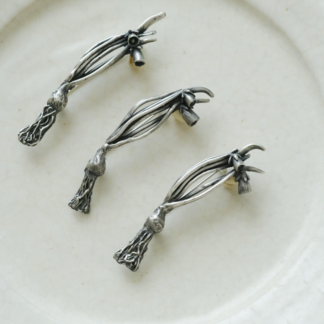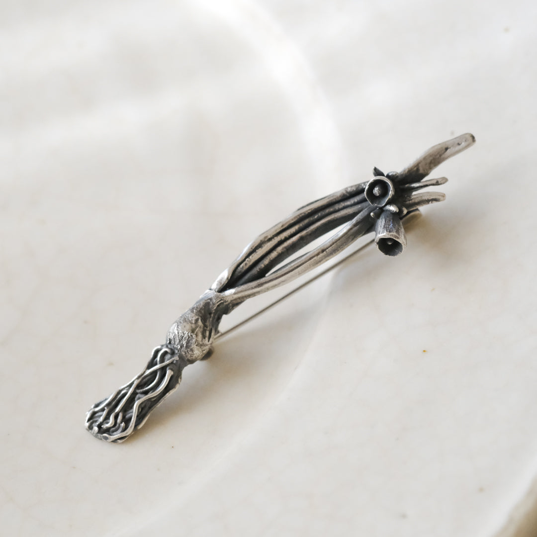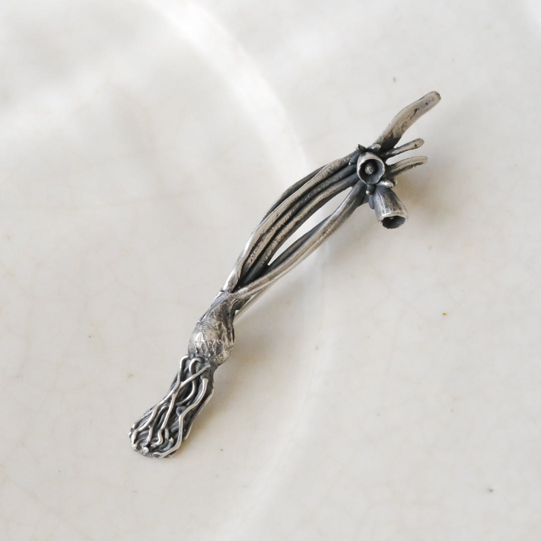 そんなペチコート水仙をモチーフにした、銀粘土のブローチです。手でひとつひとつ形づくる古橋さんの作品は、すっと伸びる茎や球根まで表現され、生き生きとした様子が伝わってきます。