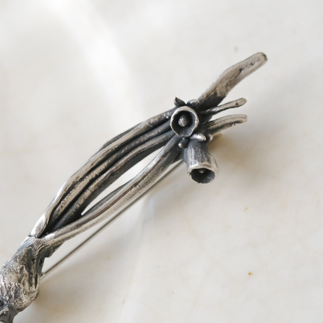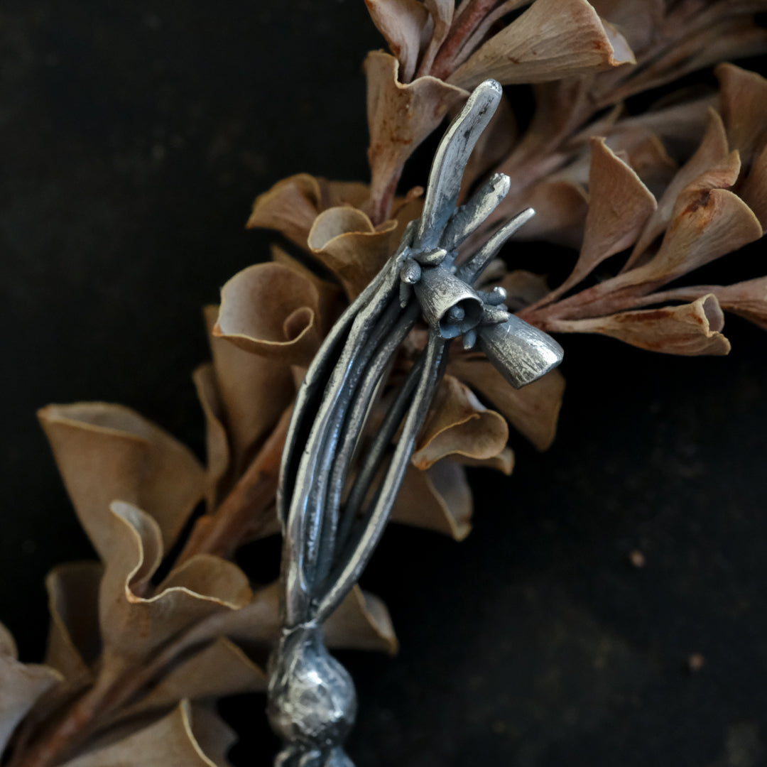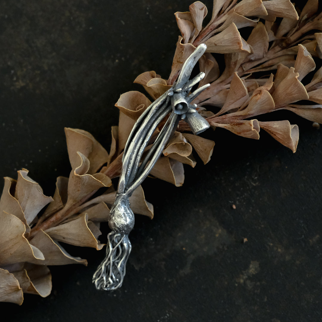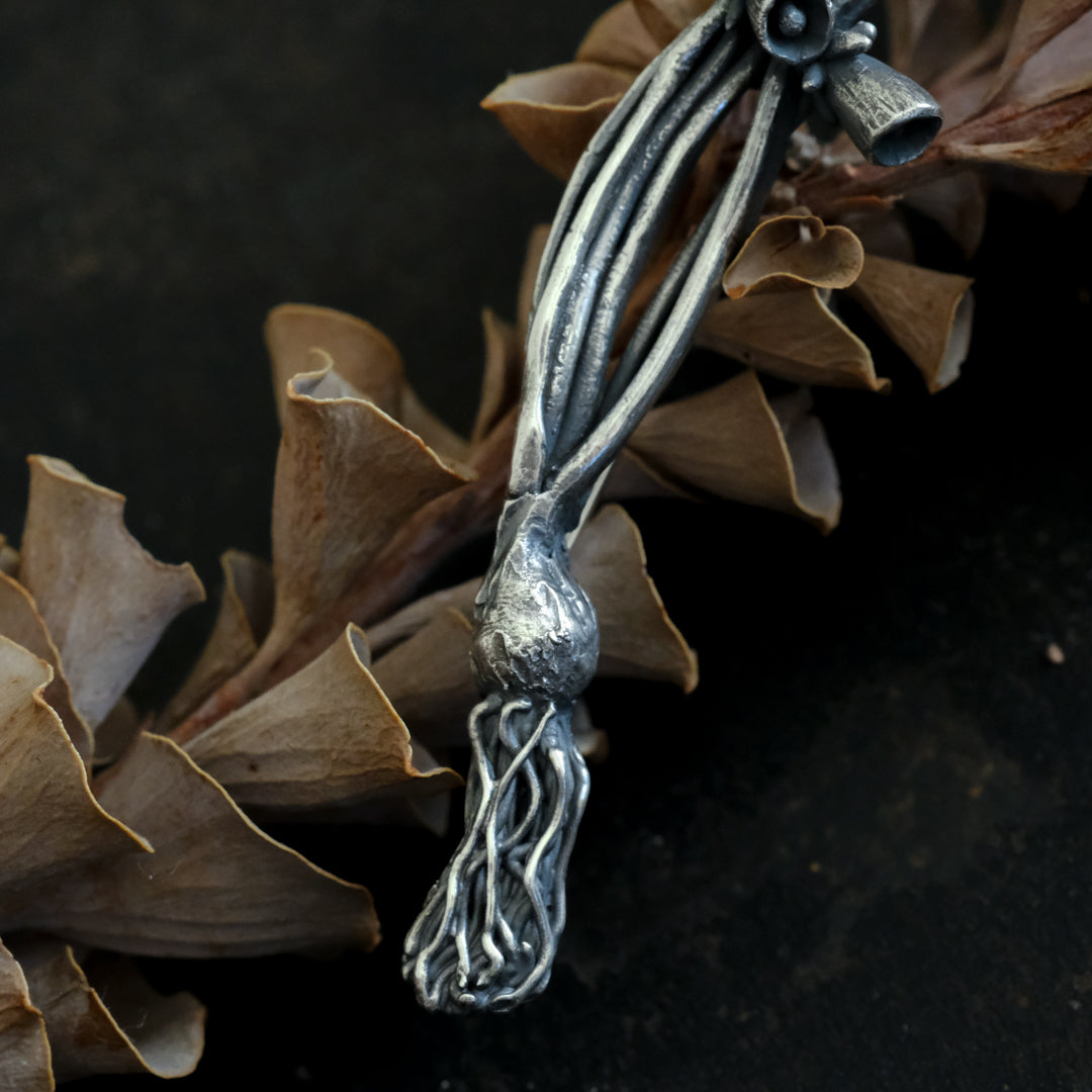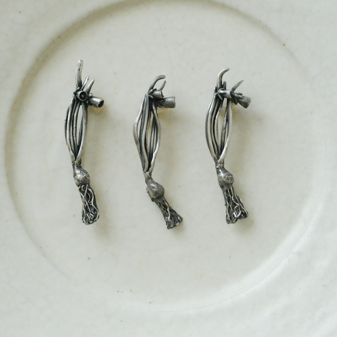 そんなペチコート水仙をモチーフにした、銀粘土のブローチです。手でひとつひとつ形づくる古橋さんの作品は、すっと伸びる茎や球根まで表現され、生き生きとした様子が伝わってきます。