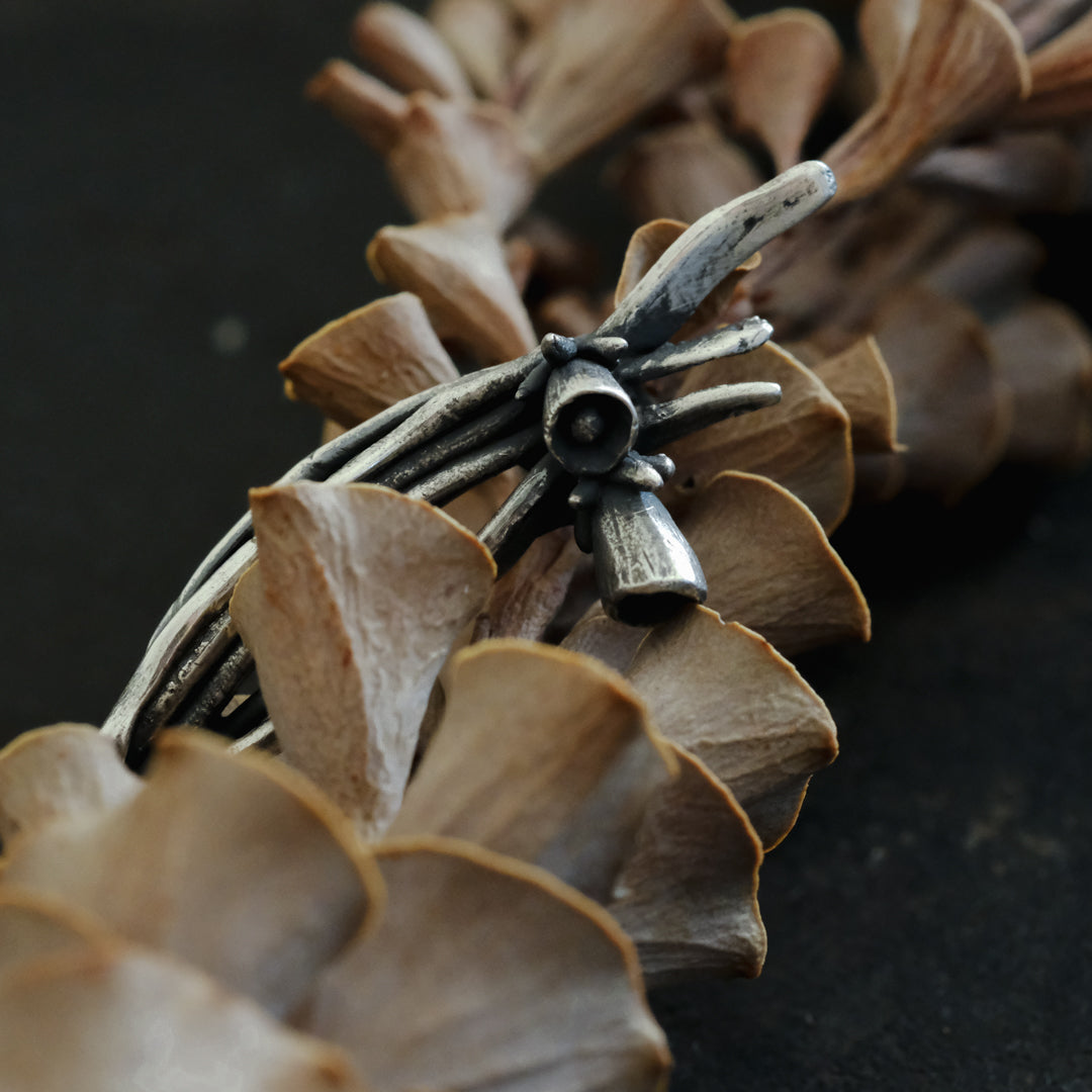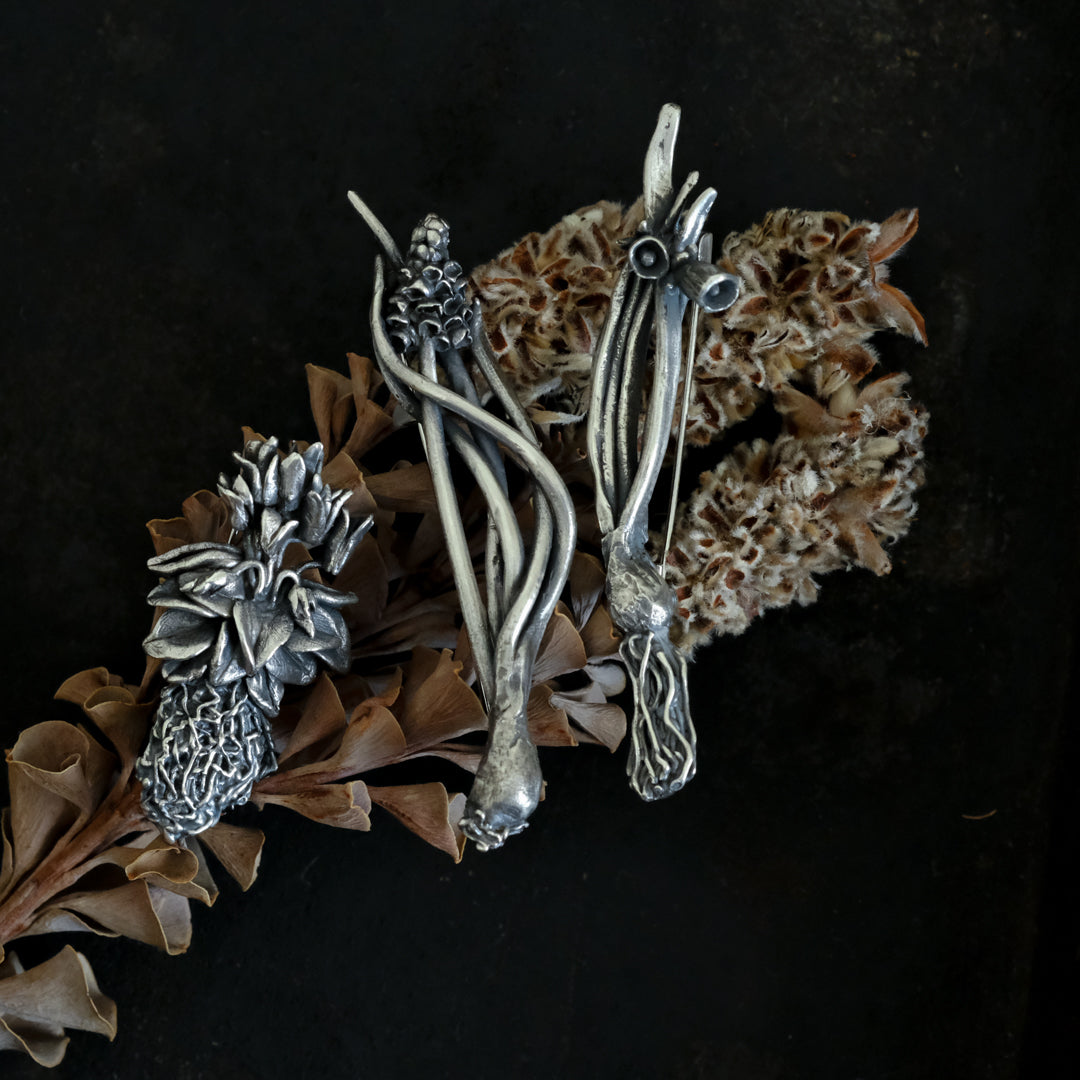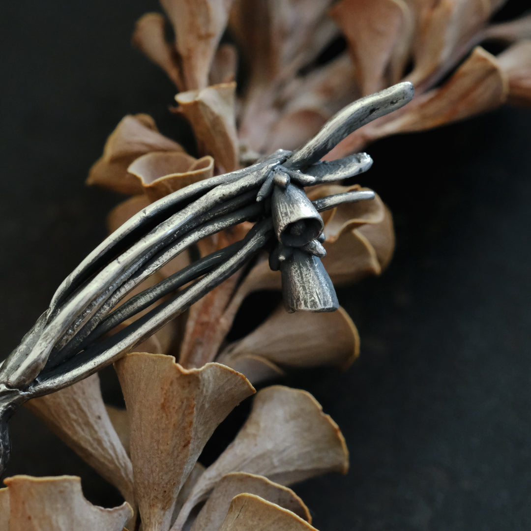 銀粘土がつくり出す美しい陰影。花も葉も、根の形も細やかに表現できるのは、手で形づくる古橋さんの作品ならでは。根の先までが植物本来の姿であることに気付かされます。