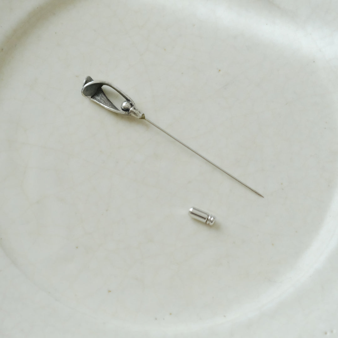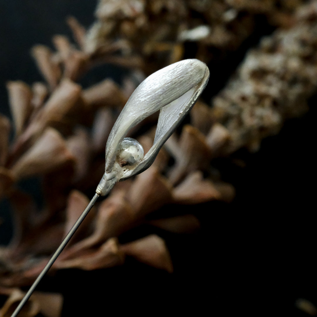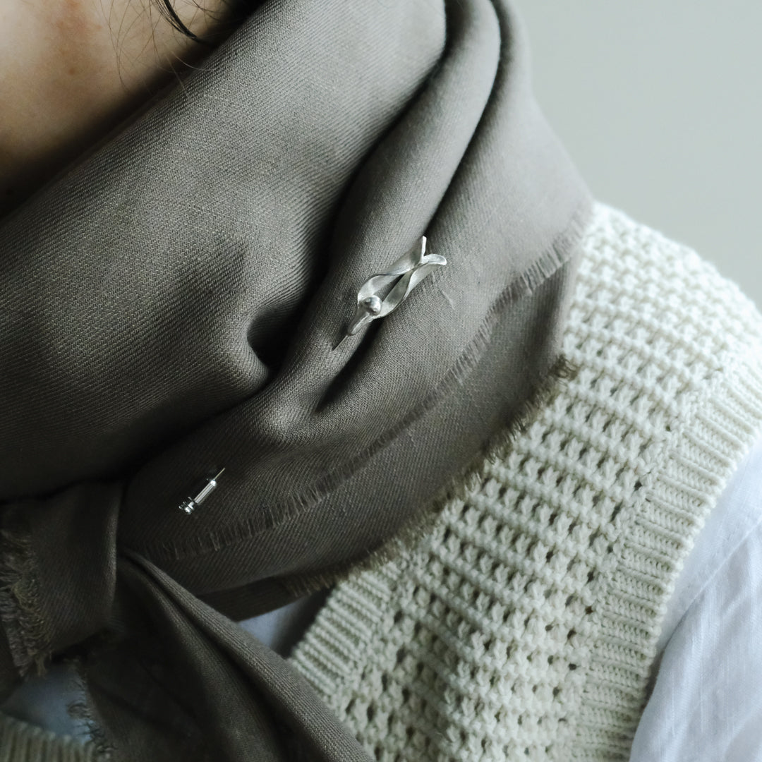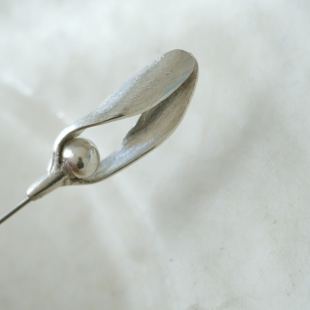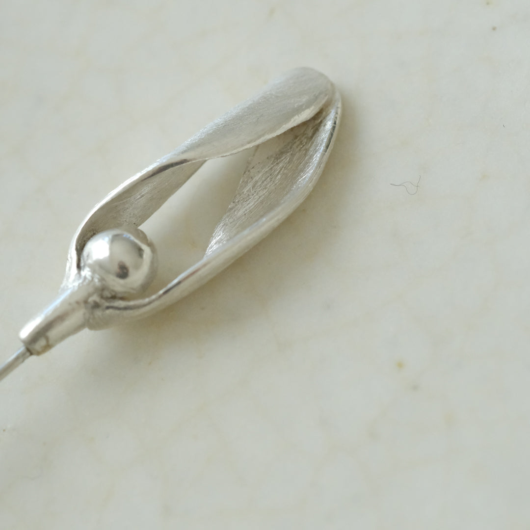 銀粘土がつくり出す陰影と、手作業でしかつくれないゆらぎ。ふたつとないヤドリギのクラバットピンは、自分だけのお守りのよう。