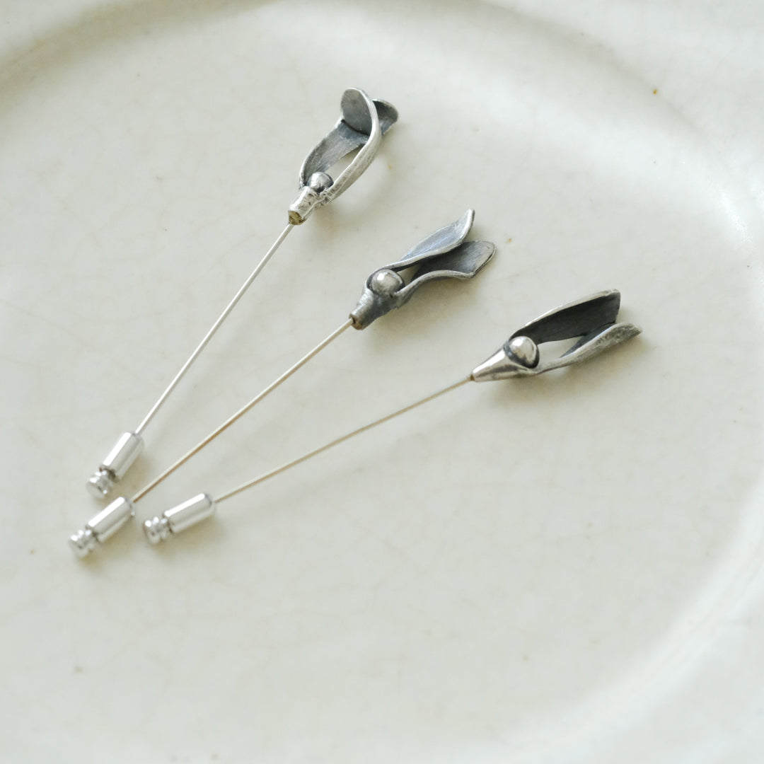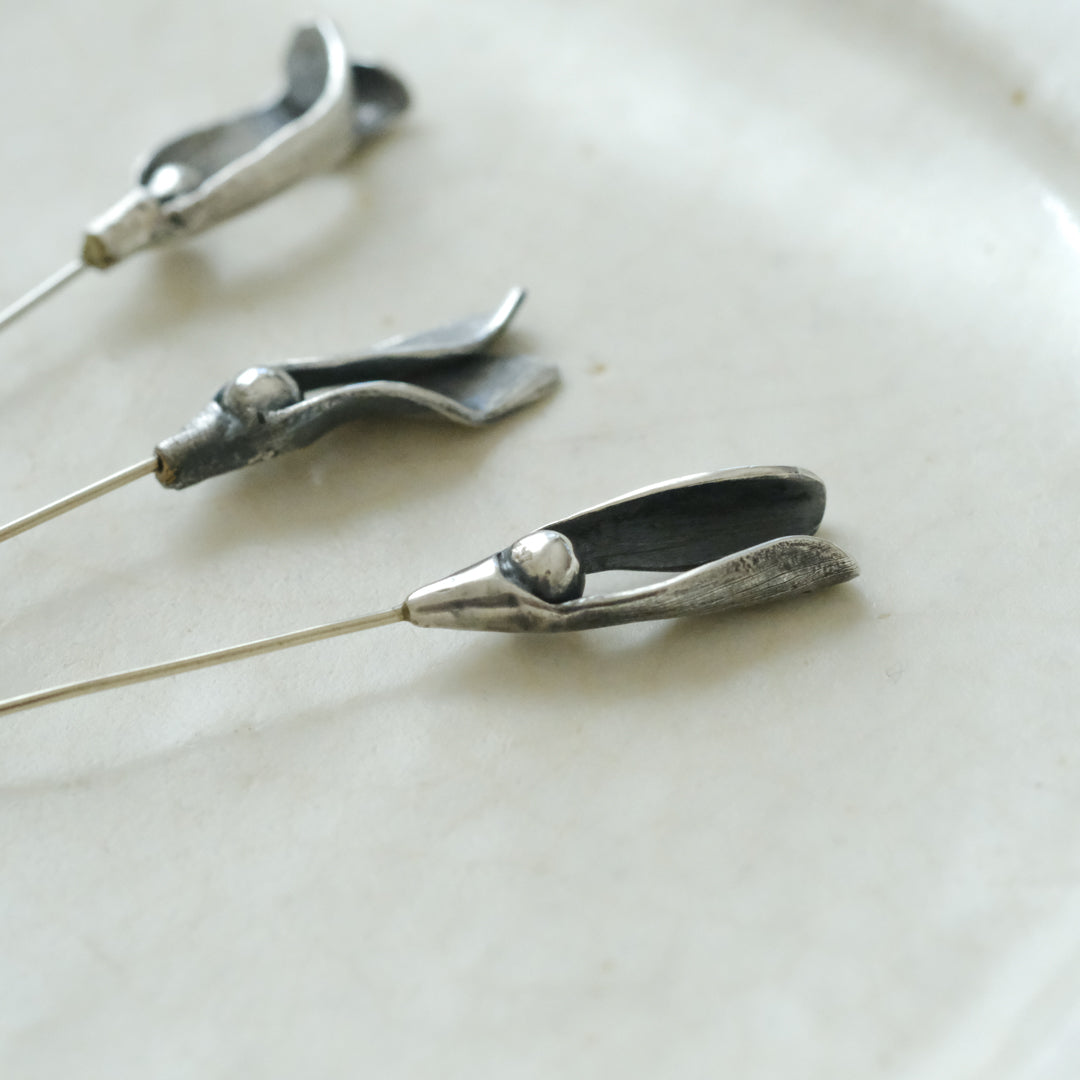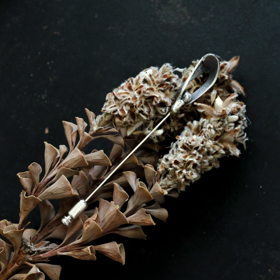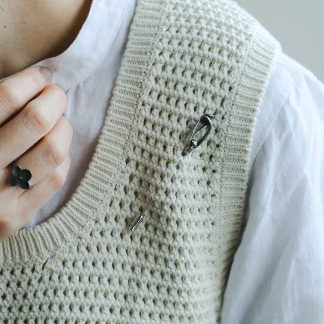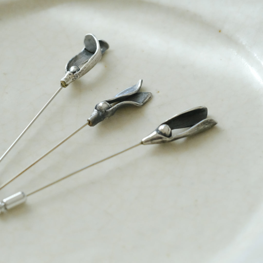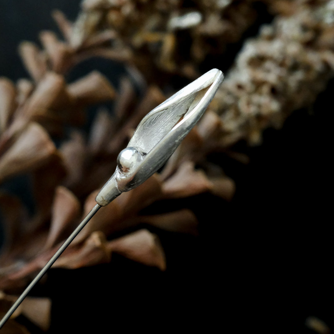 銀粘土がつくり出す陰影と、手作業でしかつくれないゆらぎ。ふたつとないヤドリギのクラバットピンは、自分だけのお守りのよう。