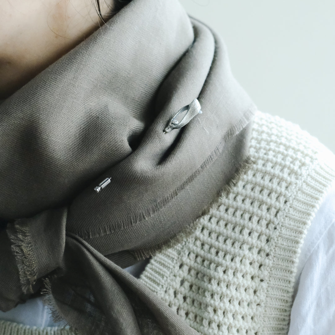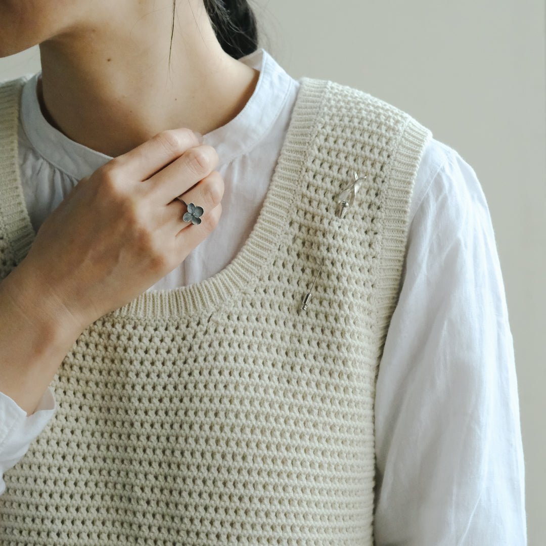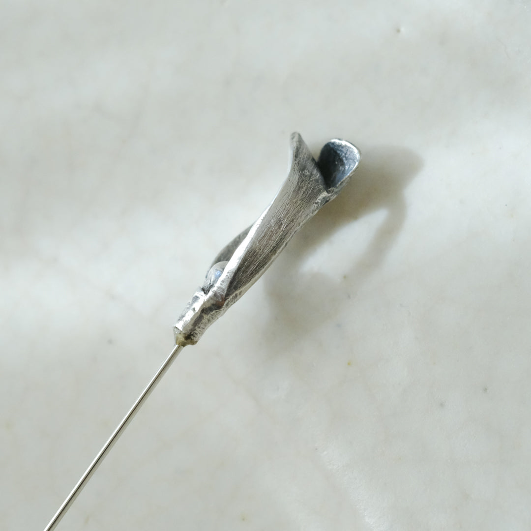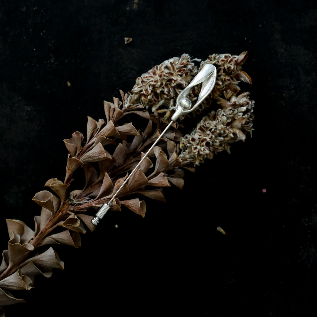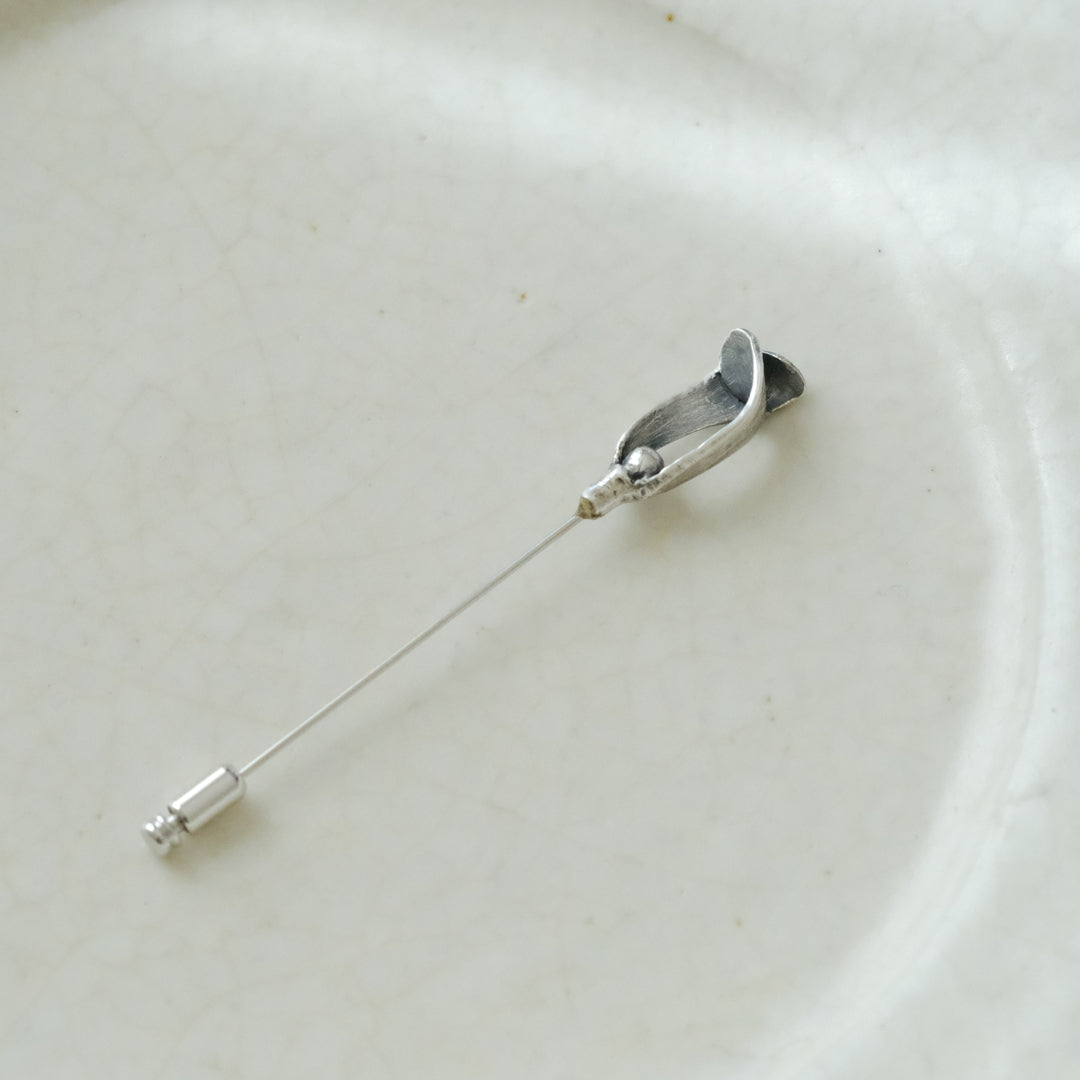 銀粘土がつくり出す陰影と、手作業でしかつくれないゆらぎ。ふたつとないヤドリギのクラバットピンは、自分だけのお守りのよう。