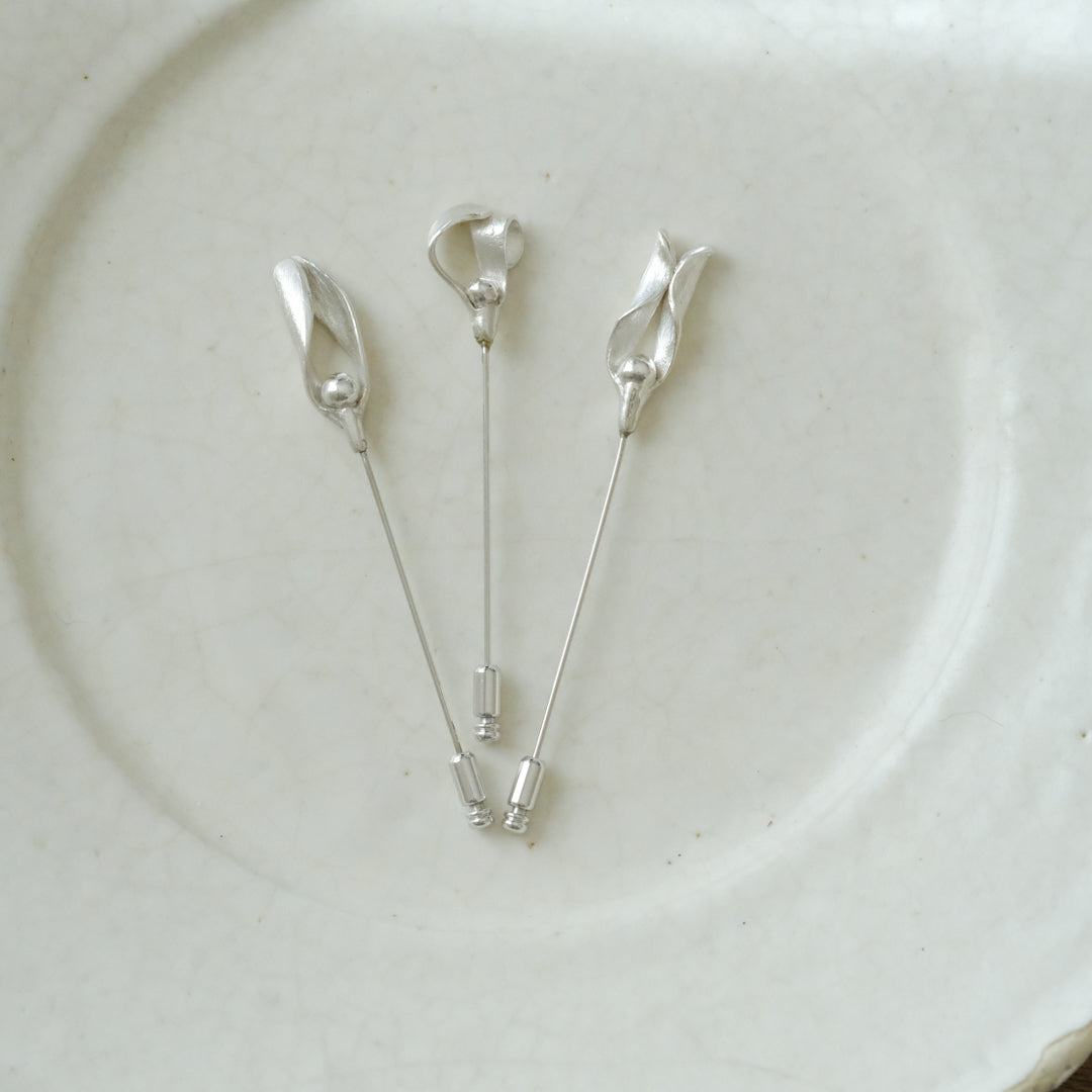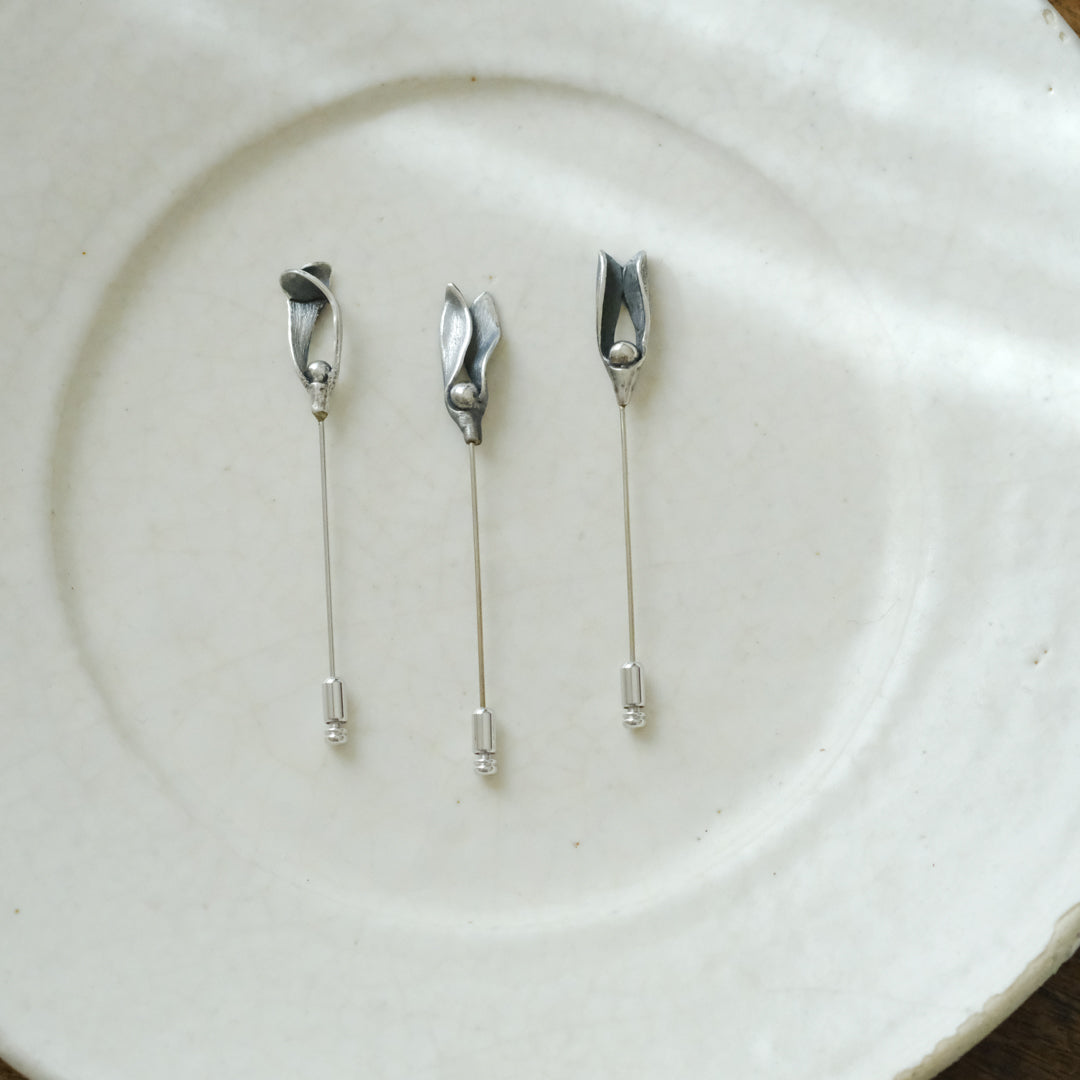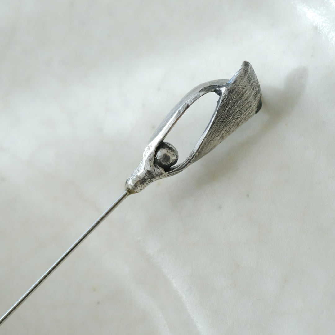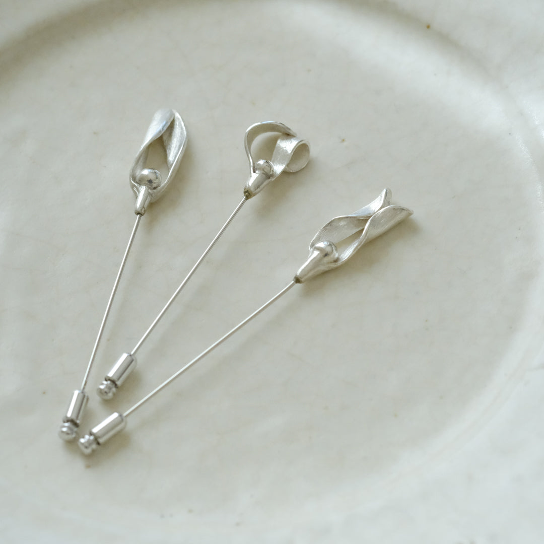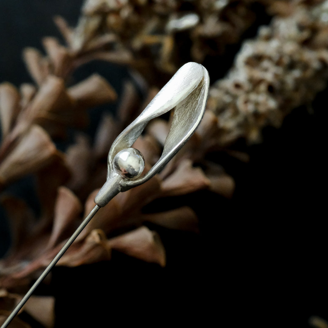 銀粘土がつくり出す陰影と、手作業でしかつくれないゆらぎ。ふたつとないヤドリギのクラバットピンは、自分だけのお守りのよう。