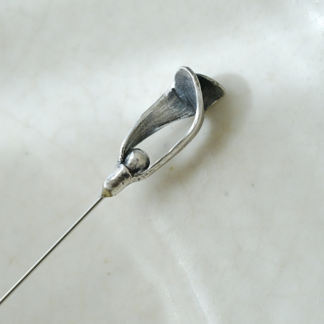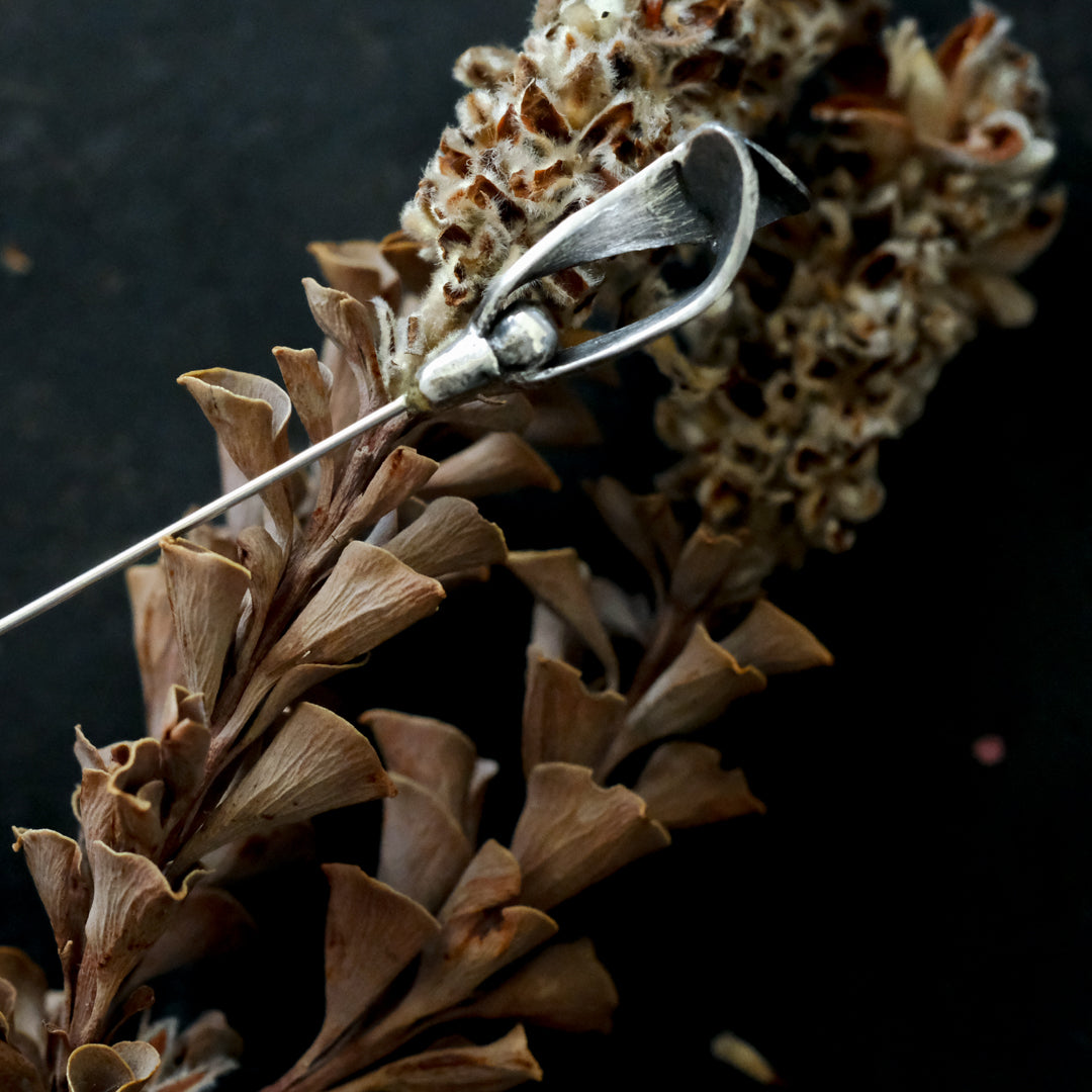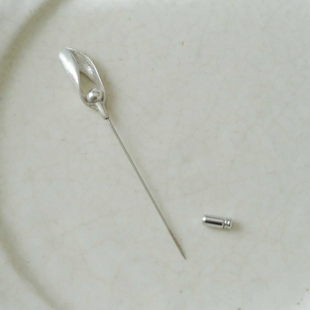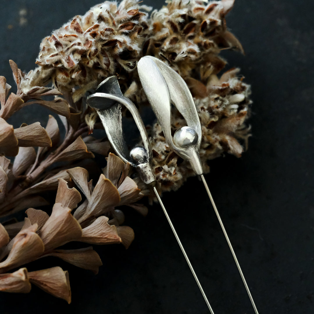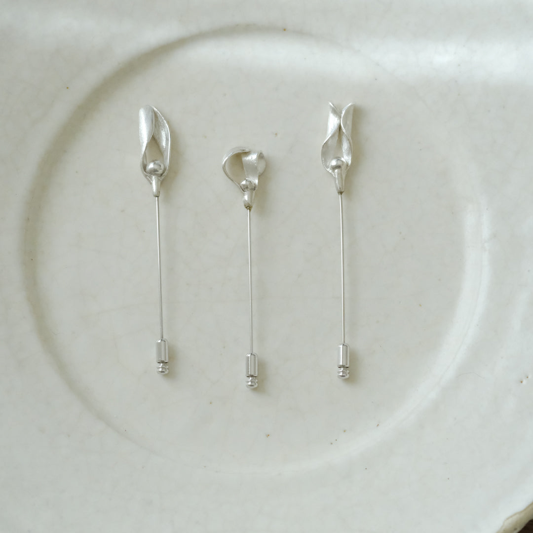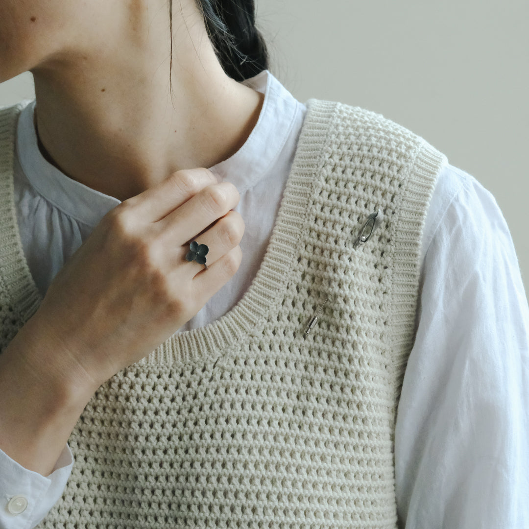 銀粘土がつくり出す陰影と、手作業でしかつくれないゆらぎ。ふたつとないヤドリギのクラバットピンは、自分だけのお守りのよう。