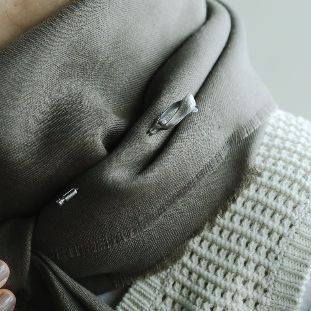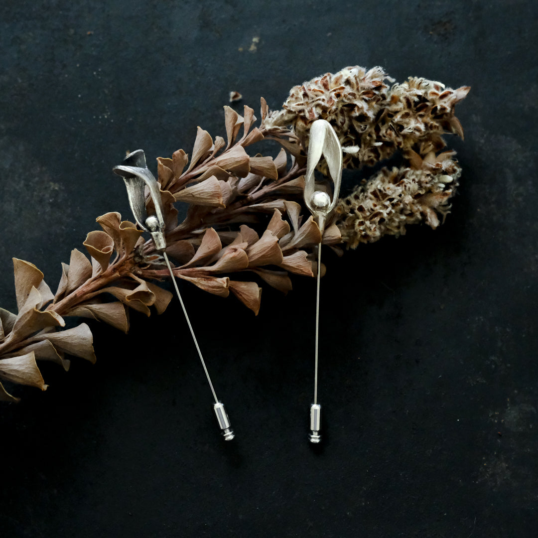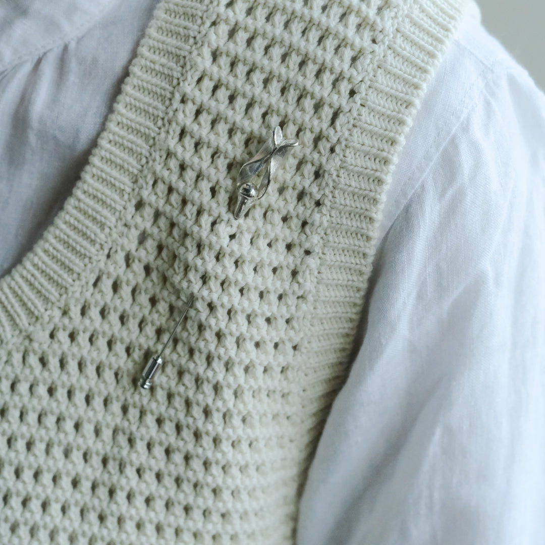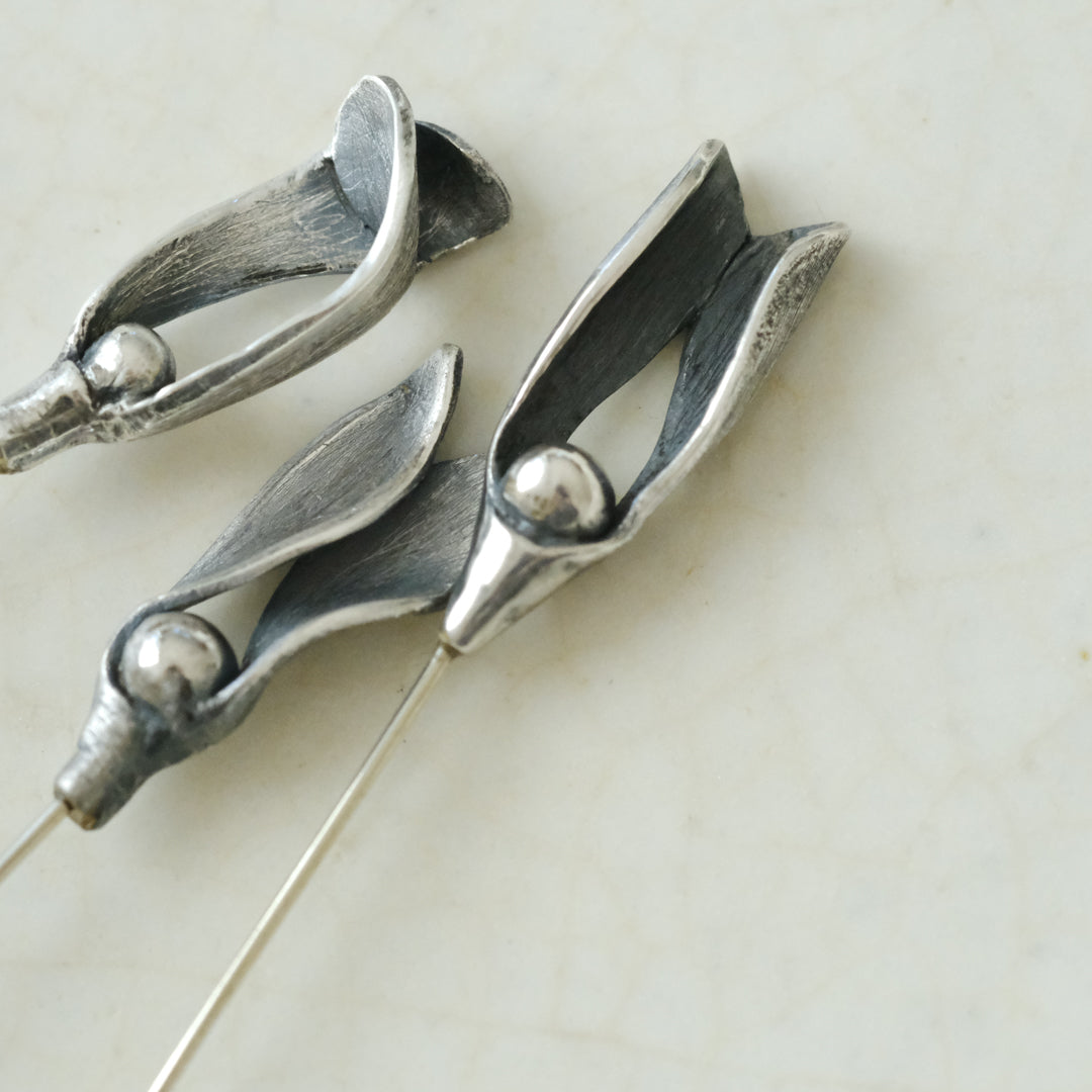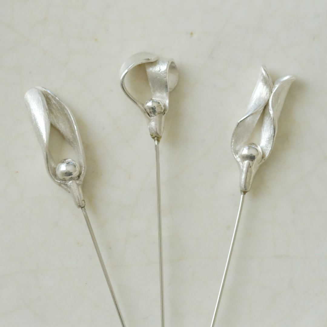 銀粘土がつくり出す陰影と、手作業でしかつくれないゆらぎ。ふたつとないヤドリギのクラバットピンは、自分だけのお守りのよう。