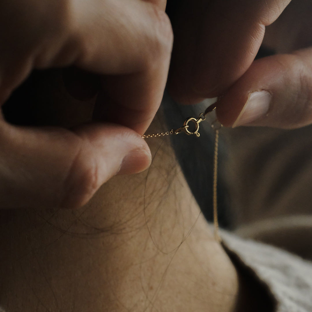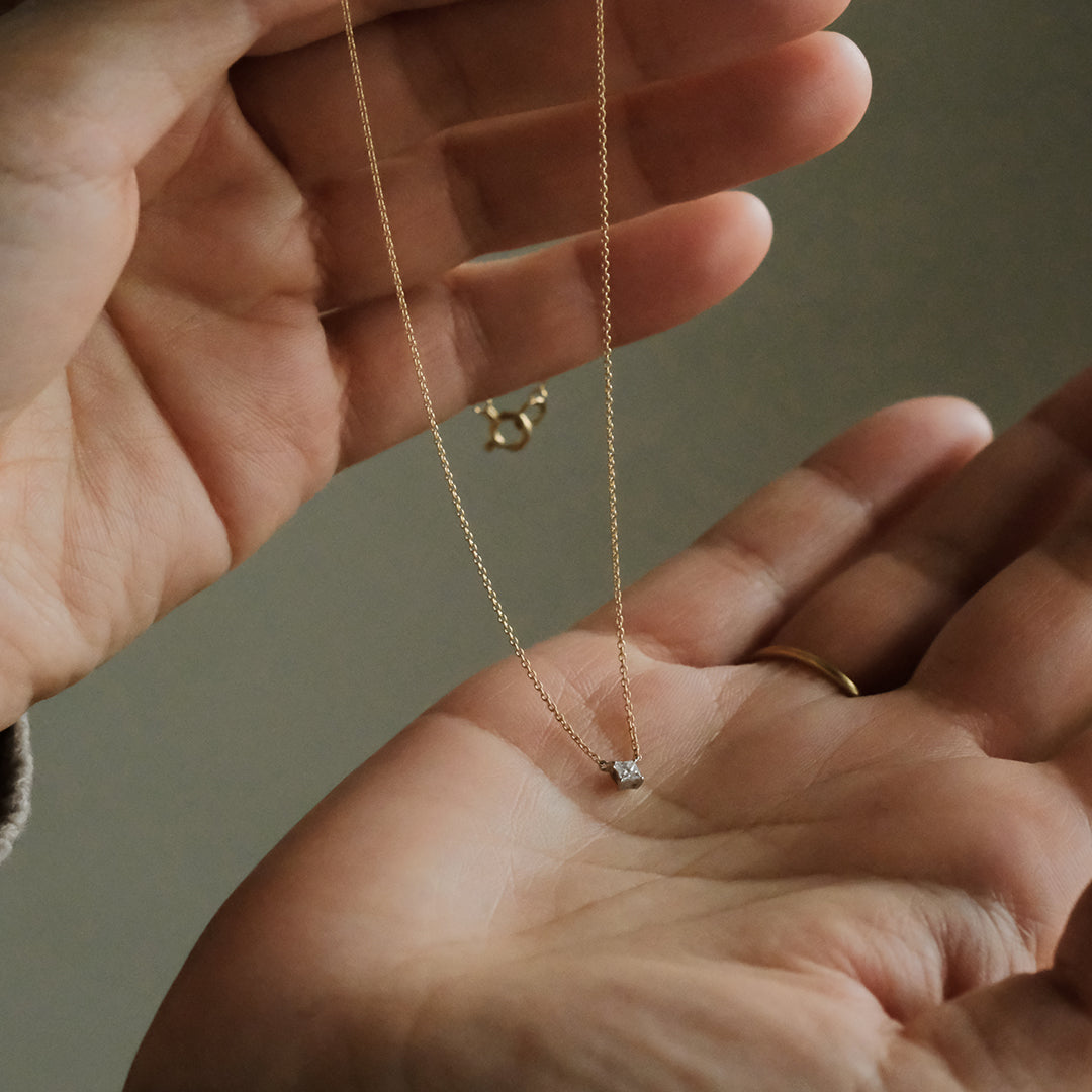 チェーンにはK18イエローゴールドを採用。繊細なチェーンは、肌になじむような落ち着きのある佇まいで、ダイヤモンドの静かな白さを引き立てます。