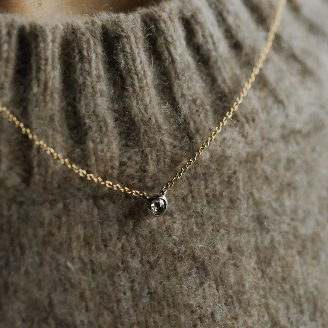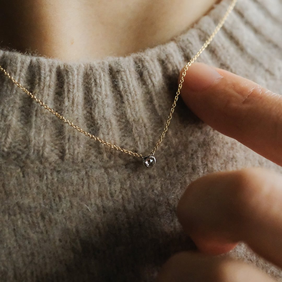 ダイヤモンドがもつ澄んだ白さを美しく映し出すために、トップの石座にはプラチナを用い、覆輪留めで丁寧に包み込んでいます。あえてプラチナを組み合わせることで、ローズカット特有のうるうるとした輝きがそのまま胸元に宿ります。