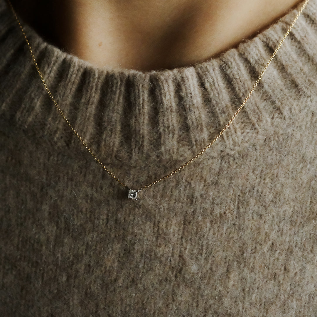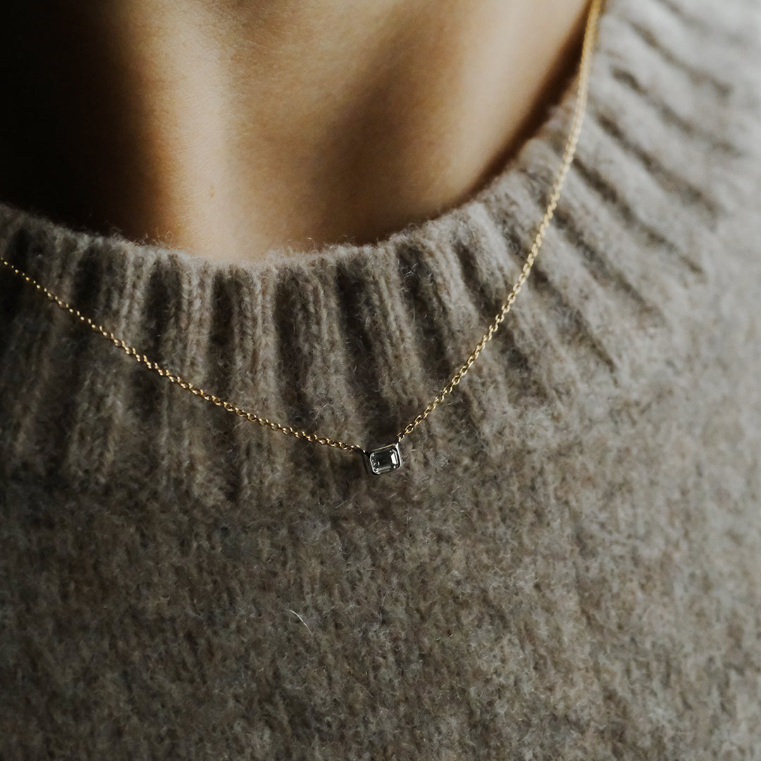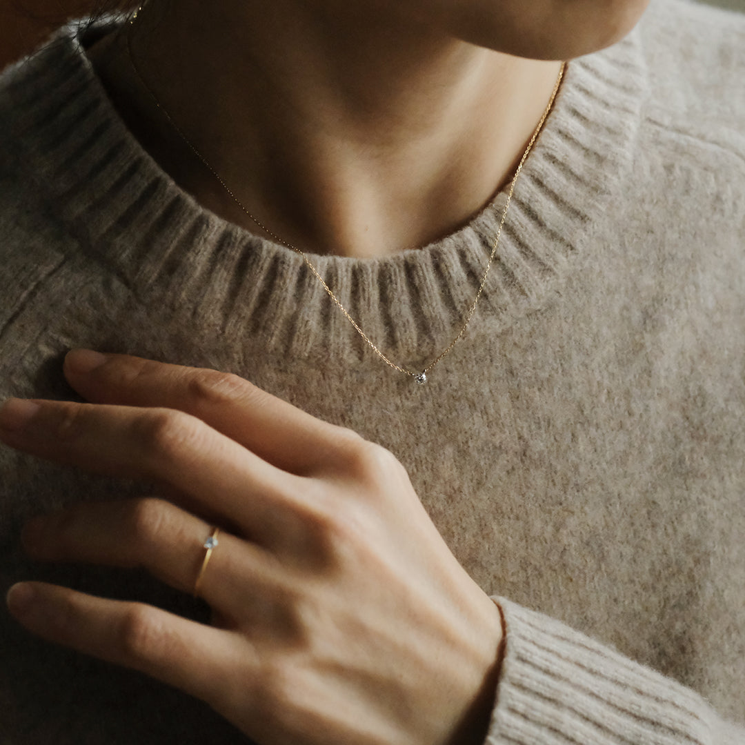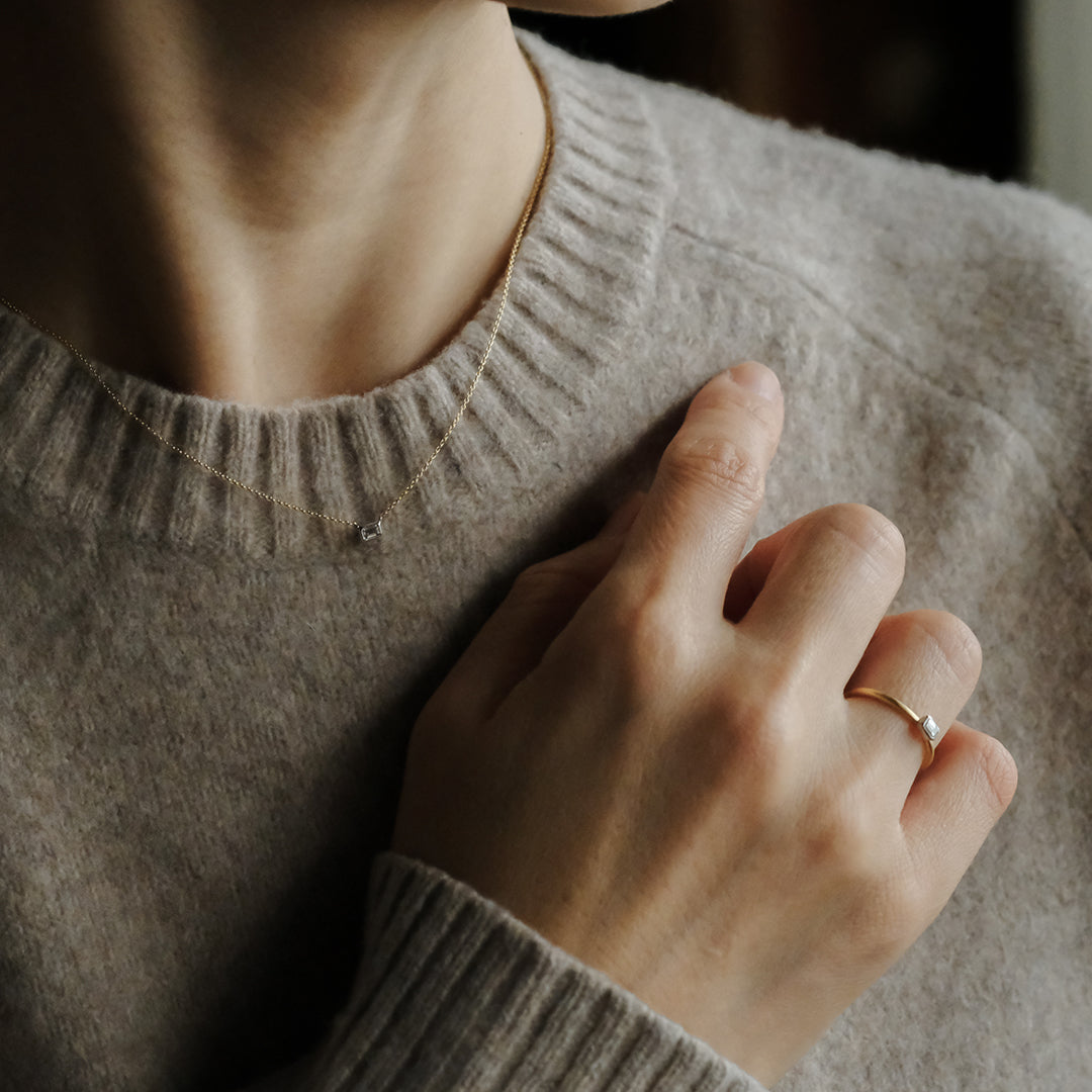 横幅のあるダイヤモンドはニットに重ねても存在感があります。透明感のある静かな輝きは、日常使いにもぴったり。