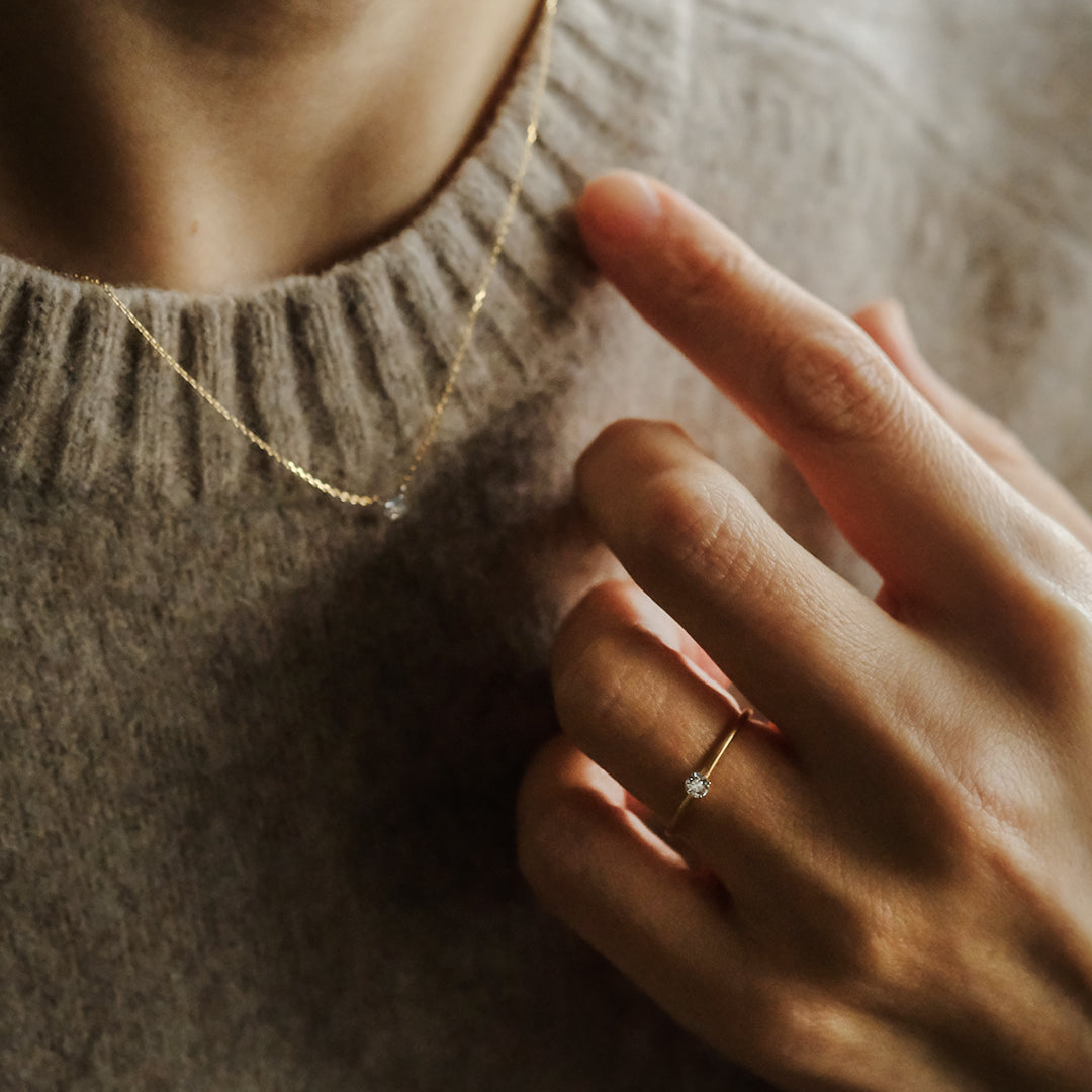 0.14ctのダイヤモンドの白さがいっそう際立つよう、石座にはプラチナを採用。石を覆うように留めることで、透明感のある輝きがすっと引き立ちます。