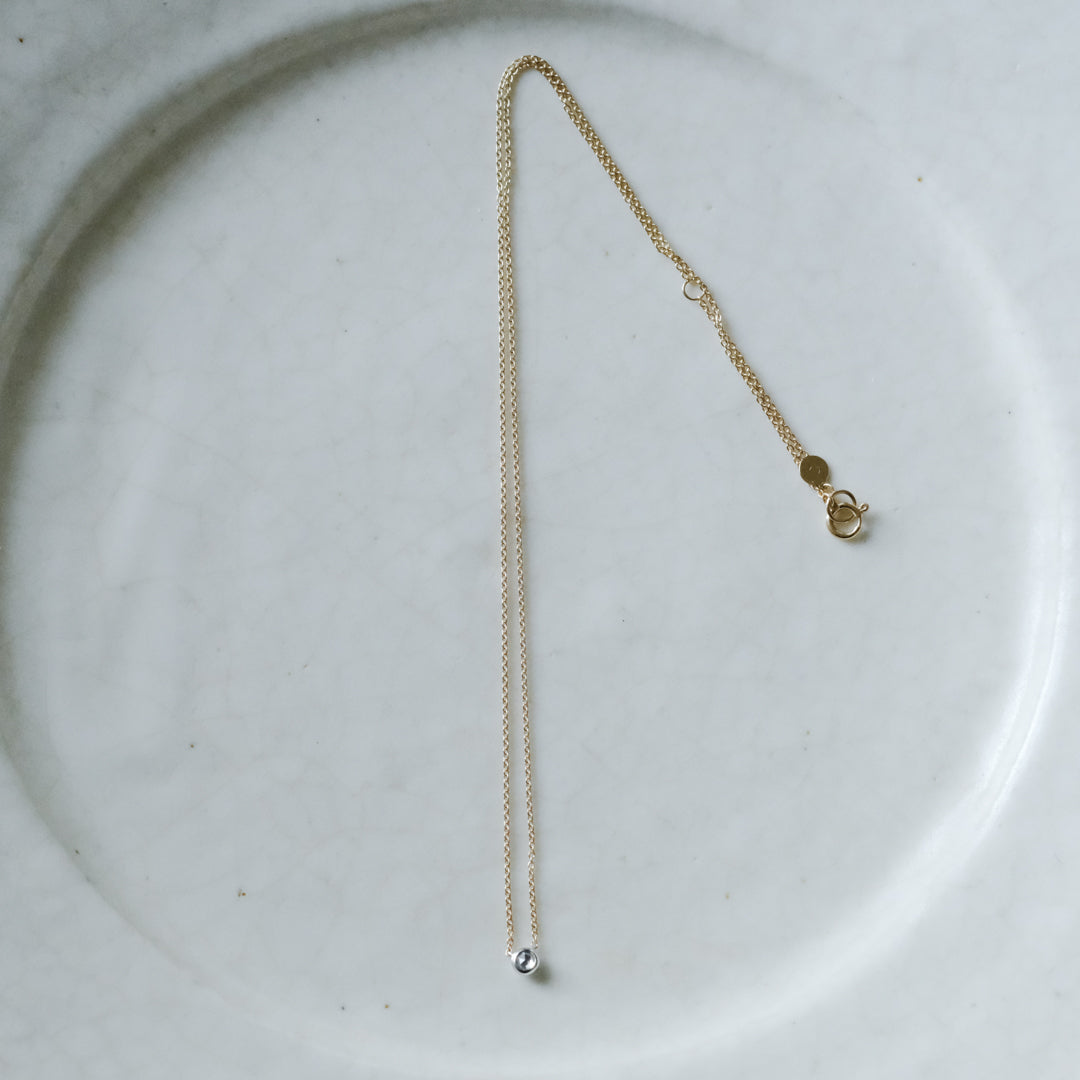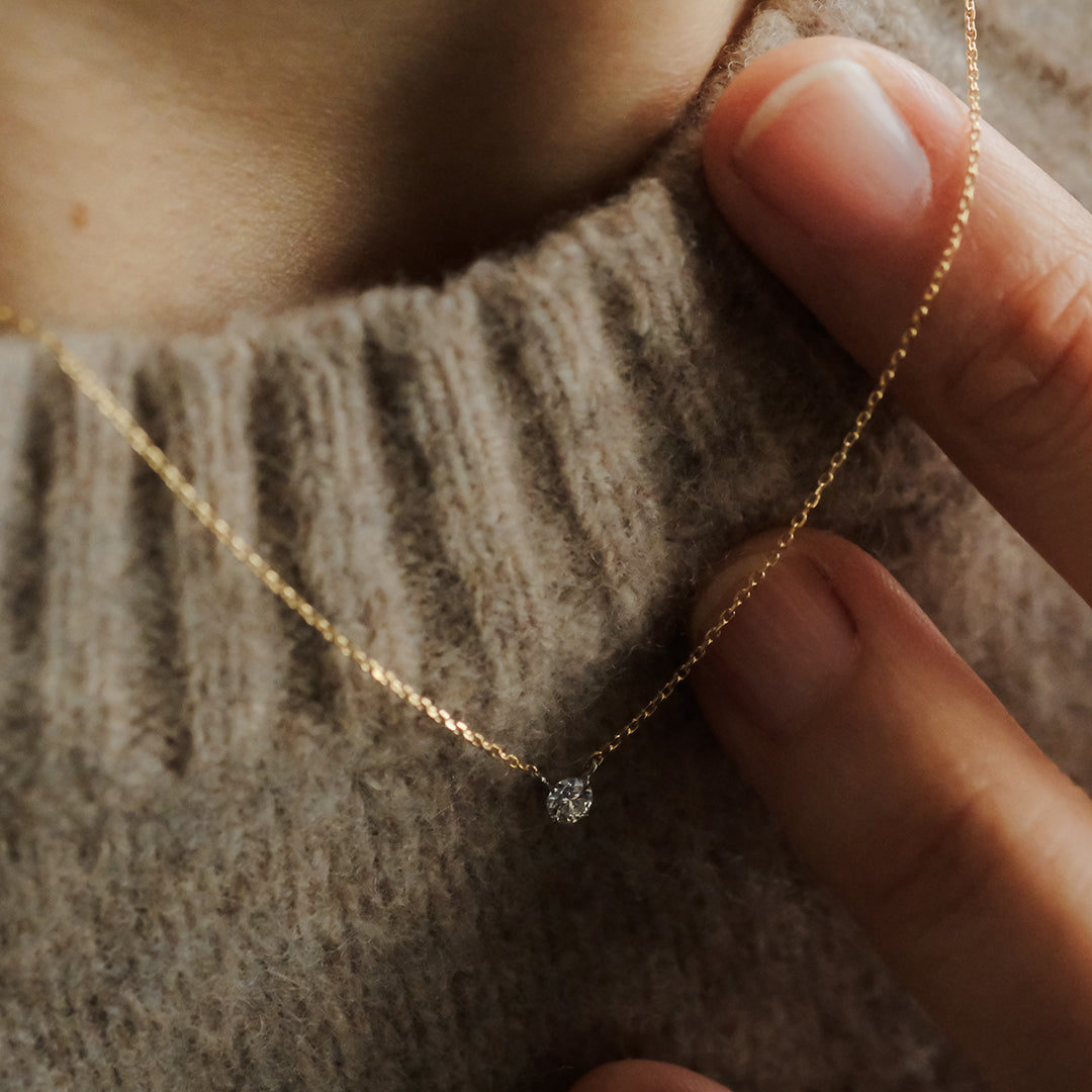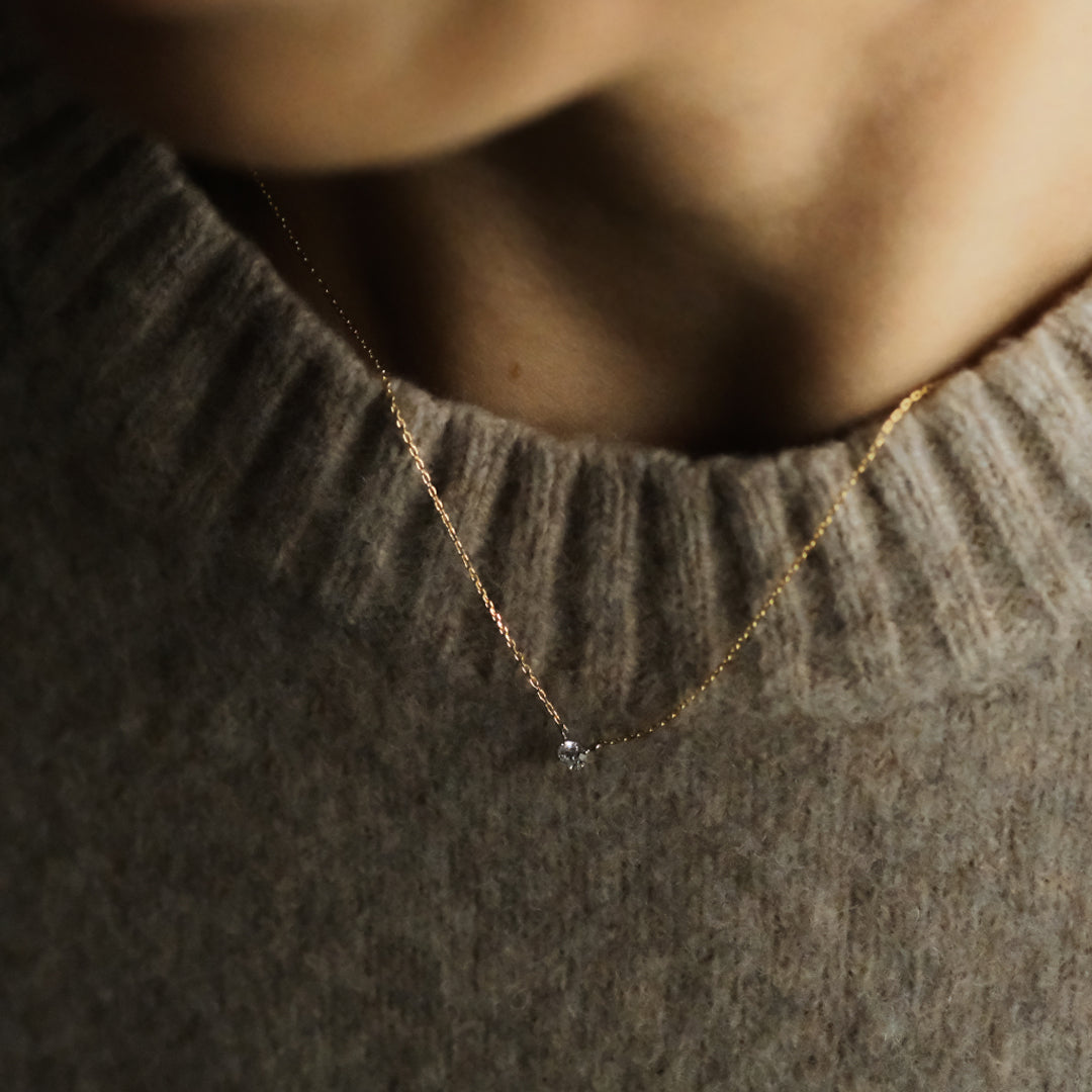 こちらのネックレスには、ダイヤモンド研磨の聖地であるベルギー・アントワープでカッティングされた高品質の0.10ctホワイトダイヤモンドを使用。カットグレード最高評価の 3EX(トリプルエクセレント)、カラーグレードはほぼ無色に分類される Hカラー のものを選びました。