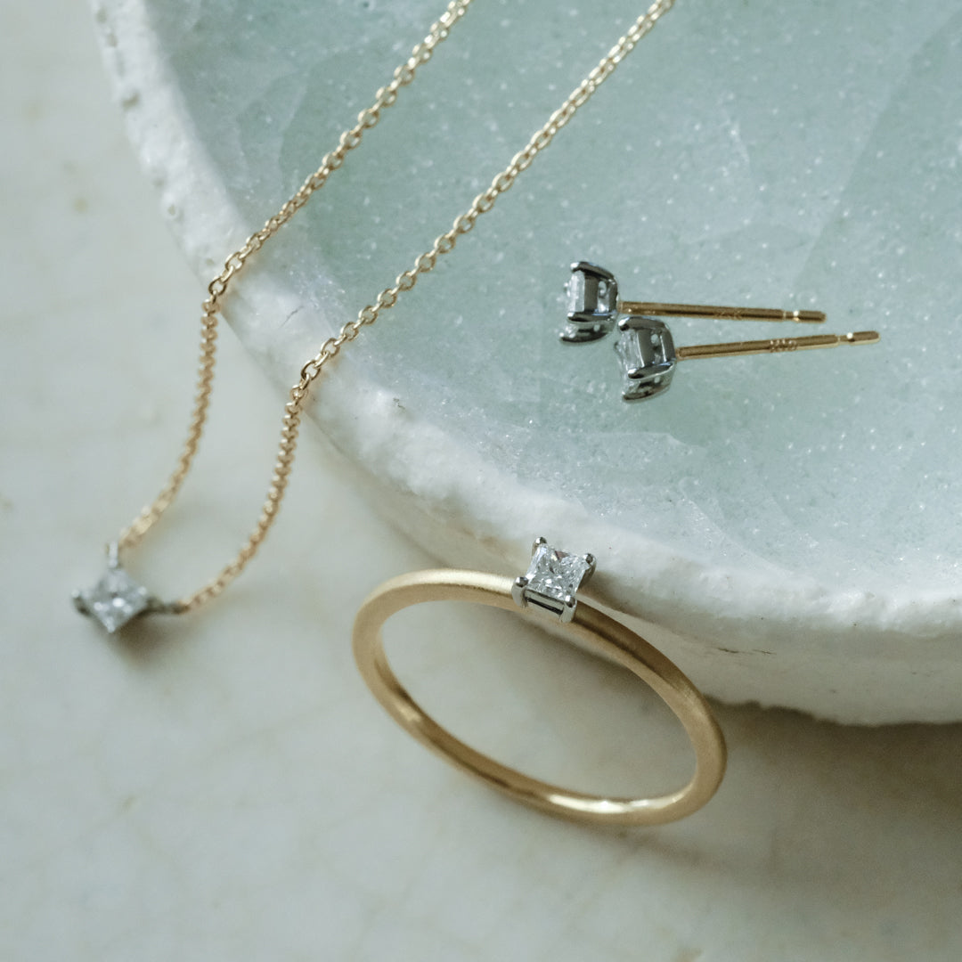 カット面の多いプリンセスカットは、特別な日に揃えて身に着けると持ち主を引き立てながら美しく輝きます。