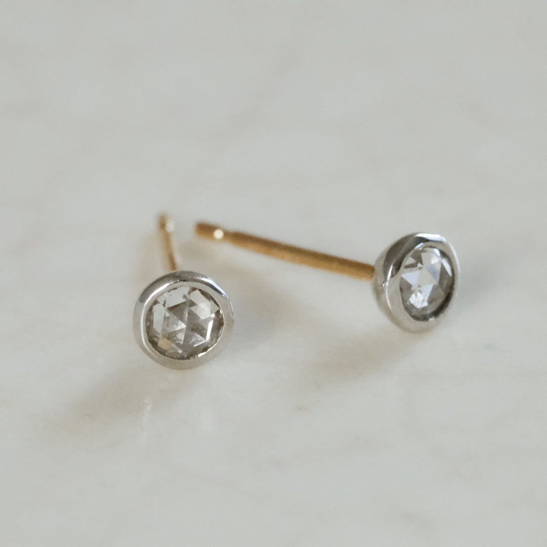 ダイヤモンドがもつ澄んだ白さを美しく映し出すために、トップの石座にはプラチナを用い、覆輪留めで丁寧に包み込んでいます。あえてプラチナを組み合わせることで、ローズカット特有のうるうるとした輝きがそのまま耳元に宿ります。