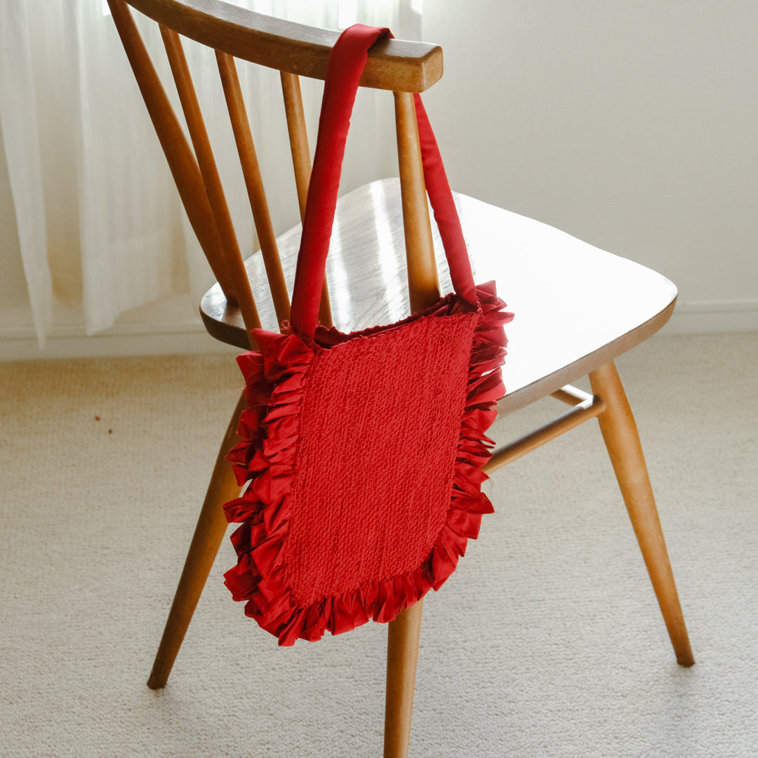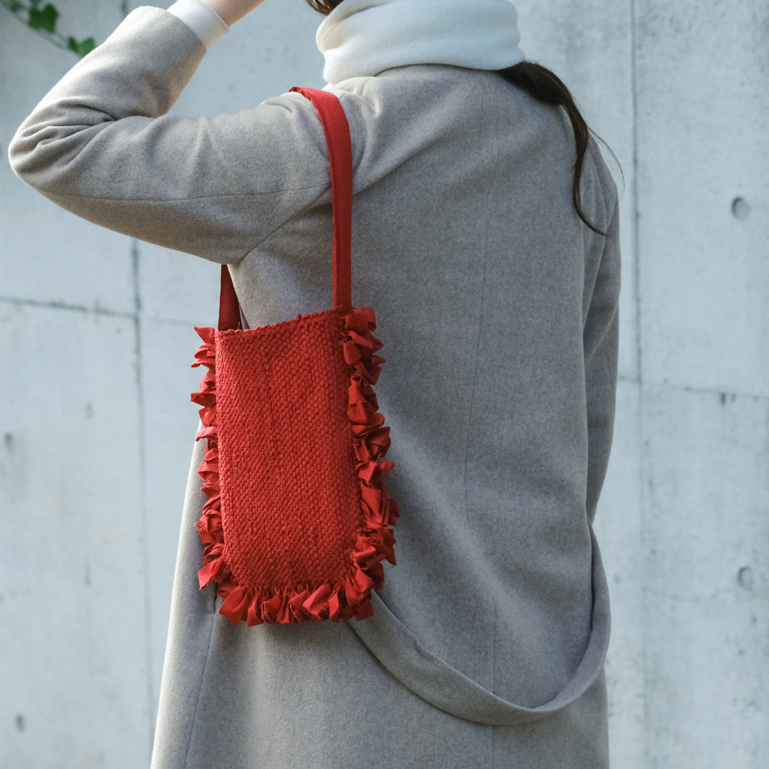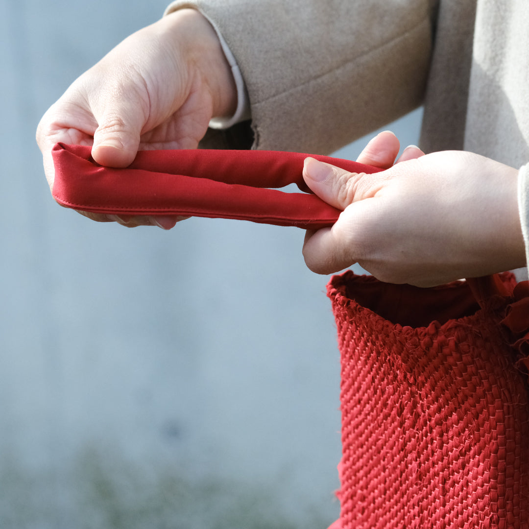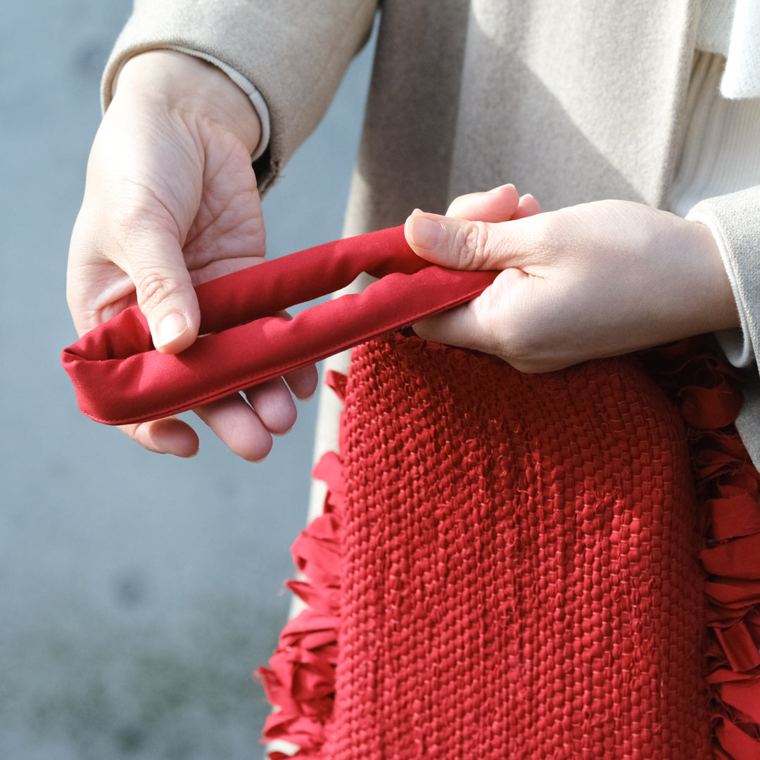 バッグ部分はしっかりと織った裂き織りでつくられ、織り目の凹凸から生まれる表情が鮮やかな赤でも強くなりすぎず上品な印象。